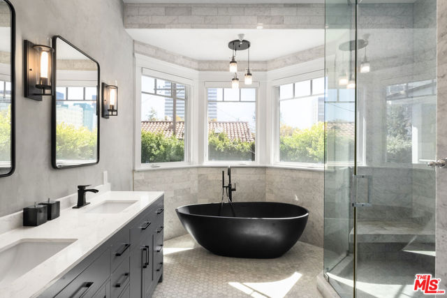 Tucked away in the highly coveted Beverly Grove neighborhood, this Cape Cod-inspired residence blends timeless design with modern luxury, creating the ideal setting for elevated family living. The entry level welcomes you with a grand two-story foyer and a thoughtfully designed floor plan featuring formal living and dining rooms, a versatile en suite bedroom or home office, and an expansive great room that flows seamlessly into the kitchen. The chef's kitchen is a standout, equipped with a Bertazzoni Heritage 6-burner range with griddle, custom cabinetry, and elegant quartzite countertops that elevate both form and function. Beautiful oak floors flow effortlessly throughout the home, leading to folding glass doors that open to a private outdoor retreat. This tranquil sanctuary includes a covered patio with a new ceiling fan, a dedicated dining area, lush new turf and landscaping, and a sparkling pool and spa complete with a rebuilt pump enclosure and added child safety fencing - perfect for both entertaining and everyday enjoyment. Upstairs, the primary suite is a private retreat, featuring an expansive terrace, dual custom closets, and a newly reimagined spa-inspired bath with a soaking tub, custom vanity, plaster accents, updated lighting and mirrors, and a Toto bidet. Upstairs you'll find three additional en suite bedrooms - two with views of the iconic Hollywood Sign - along with a fully customized new laundry room with upgraded tile and cabinetry. Every detail has been thoughtfully enhanced, from retrofit LED lighting and whole-home screens and blinds to upgraded audio, video, and security systems - including DoorBird entry, 24/7 recording, and seamless smart app integration. The finished garage includes new cabinetry, decorative lighting, a workbench, Tesla-ready 240V charger, and a brand-new door and motor. Additional highlights include new private front and side gates with stucco privacy walls, a generator connection at the main panel, multi-zone climate control, and fully paid solar providing energy efficiency and long-term savings. Securely gated and just moments from LA's premier dining, shopping, and entertainment, this move-in-ready home combines classic elegance, contemporary convenience, and the warmth of true family living.