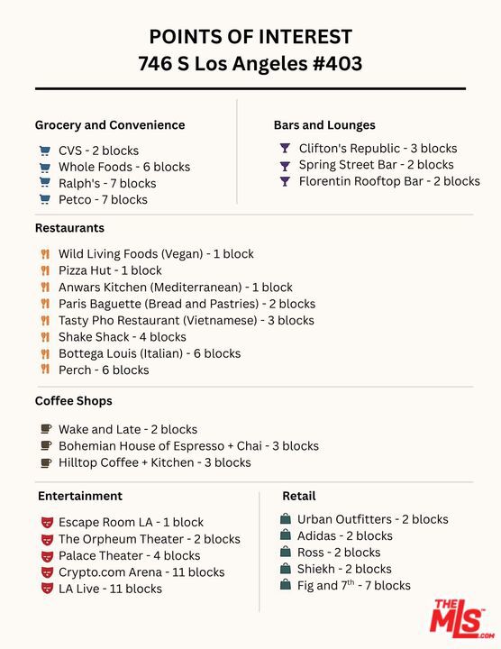 除了房屋基本信息以外,CCHP.COM還可以為您提供該房屋的學區資訊,周邊生活資訊,歷史成交記錄,以及計算貸款每月還款額等功能。 建議您在CCHP.COM右上角點擊註冊,成功註冊後您可以根據您的搜房標準,設置“同類型新房上市郵件即刻提醒“業務,及時獲得您所關注房屋的第一手資訊。 这套房子(地址:746 S Los Angeles St Unit 403 Los Angeles, CA 90014)是否是您想要的?是否想要預約看房?如果需要,請聯繫我們,讓我們專精該區域的地產經紀人幫助您輕鬆找到您心儀的房子。
