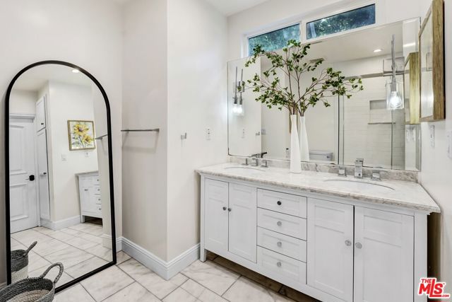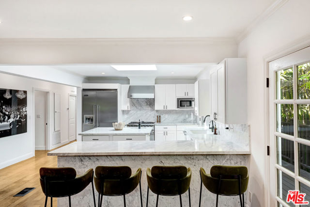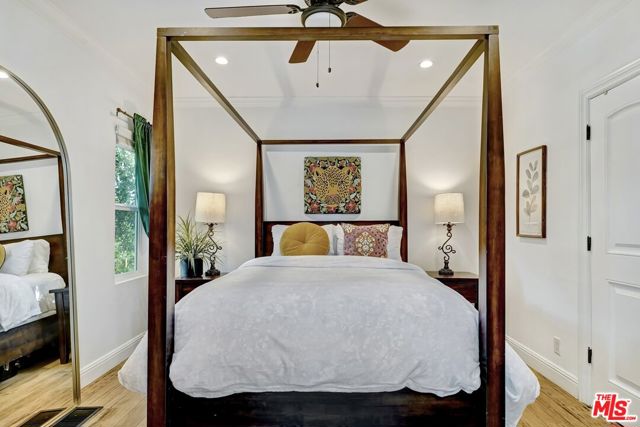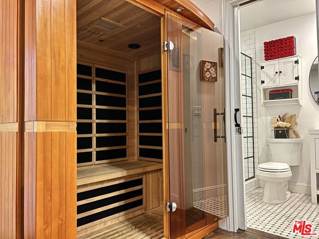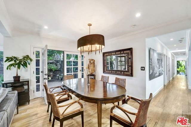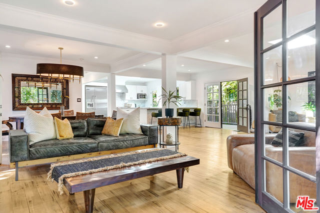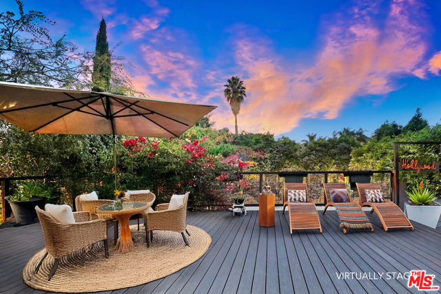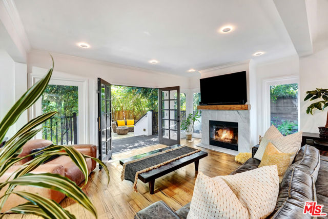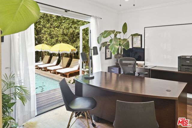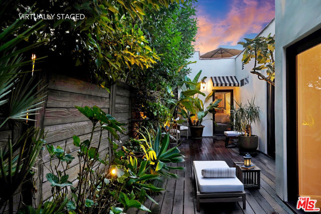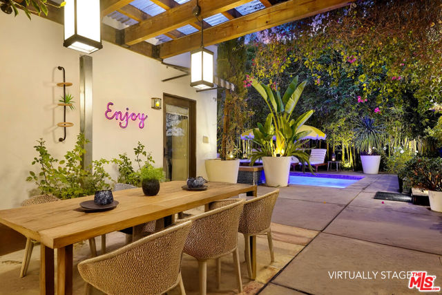 Prepare to be mesmerized. Welcome to Secret Garden Weho, a walker's paradise just minutes from 6 Michelin-Starred restaurants, neighborhood parks, recreation centers, and local markets - yet it feels a world apart. Here, every space blurs the line between home and haven. Discover spectacular indoor and outdoor living, including a panoramic rooftop deck, in a bright, canopied, Moorish-inspired sanctuary where architecture and nature dissolve into a Zen California dream. Your journey begins the moment you step through a massive driftwood door into a lush courtyard of beautiful tiled floors and inviting seating areas - a serene prelude to what lies within. This isn't just a home; it's your own Secret Garden, enveloped by olive trees, silver sheens, fern trees, and exotic flora. Positioned on a privileged corner lot, the property offers rare privacy and effortless freedom to entertain amid the city's vibrant pulse. Spanning over 3,000 square feet of total indoor-outdoor living space (~2,450 sqft indoor), the residence unfolds on a single level, perfectly balancing openness and intimacy. Expansive terraces and wraparound decks flow almost entirely around the home, drawing the vibrant greenery inside and creating a dreamy, seamless indoor-outdoor lifestyle. At its heart lies a grand, open-concept living area designed for both lively gatherings and quiet reflection, centered around a chef's kitchen with a generous island, peninsula bar, and a stunning skylight that floods the space with natural light. Two primary suites, two guest bedrooms, and a versatile room with dual-access bath and outdoor deck (currently serving as an executive office with water views and an adorable nursery) offer calming vistas of gardens and greenery from every corner. Step beyond, and the magic deepens. The backyard reveals a private, sparkling pool and spa nestled among groves of bamboo -- your very own resort retreat. You'll feel transported thousands of miles away to your own slice of paradise, where time slows and the air feels lighter. Adjacent, a spacious entertaining area awaits, perfect for unforgettable al-fresco dinners. For added comfort, a detached pool house includes a full bath for guests and an infrared sauna to unwind after the day's adventures. Finally, ascend a spiral staircase through the canopy to discover the crown jewel -- a private rooftop deck that seems to lift this Secret Garden into the sky. Shielded by lush landscaping, it offers complete privacy and panoramic views of the Hollywood skyline, the Hollywood Sign, and the surrounding hills. Whether you're soaking up the California sun or stepping away from the home office for a midday burst of inspiration, this rooftop haven is your personal sanctuary above the city. An incredibly rare offering just moments from the heart of West Hollywood, Secret Garden Weho is more than a home - it's a feeling. Are you ready to escape into your Secret Garden?