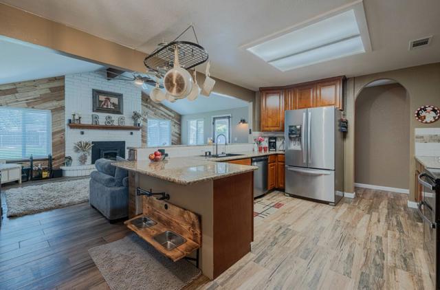 Welcome to this charming 3-bedroom, 2-bathroom (plus office) home located in the County of Madera. Spanning 2,086 square feet, this residence offers a blend of comfort and functionality. The kitchen is a culinary delight featuring modern appliances including an electric cooktop, granite countertops, a gas oven range, dishwasher, garbage disposal, ice maker, and microwave, not to mention a spacious pantry. The home boasts a mix of concrete, laminate, and tile flooring throughout, creating a seamless flow from one room to the next. Relax in the separate family room, which includes a cozy fireplace, perfect for cooler evenings. The formal dining room is ideal for entertaining guests. High ceilings enhance the open and airy feel of the home, and central AC with a whole house/attic fan ensures year-round comfort. The property also includes an in-ground pool, perfect for enjoying warm Madera days, with a Bar/BBQ area (look at pictures to appreciate) including misters here and under the patio walking out of home! Additional features are a convenient in-utility room laundry area, RV area with electrical set with 240 volt/50AMP, a "beach area" for kids already set up and a 2-car garage. This home provides a comfortable and convenient lifestyle in a thriving community. A must see!