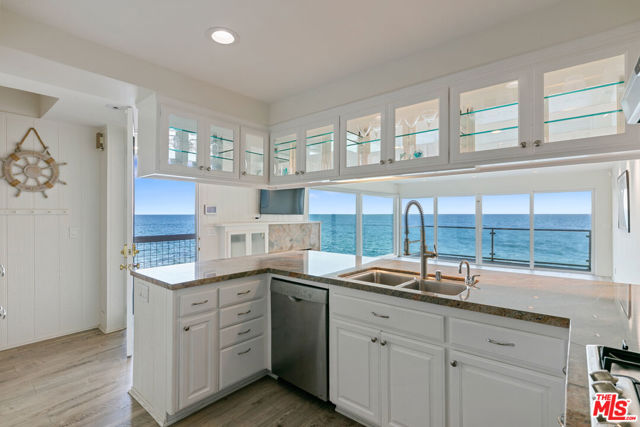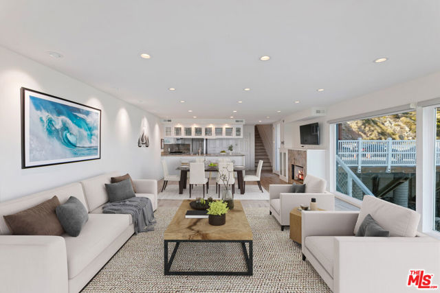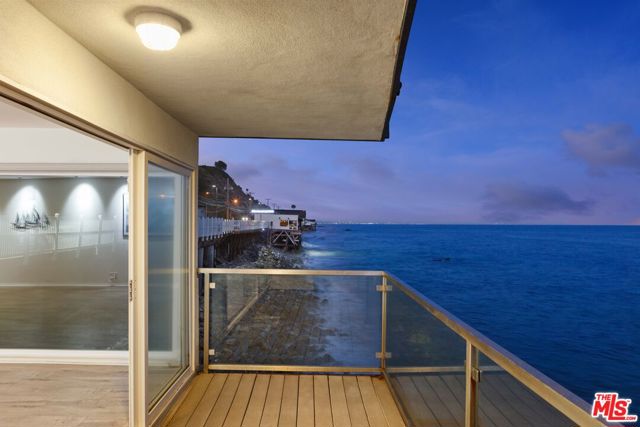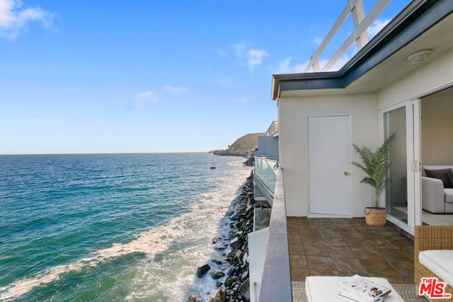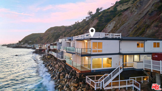 A Coastal Sanctuary with Unmatched Views. Extraordinary end cap residence perfectly positioned on Big Rock Beach, just minutes from Santa Monica and central Malibu. Own the whole building, the adjacent home is for sale as well! This rare offering features two bedrooms plus a loft, and 2.5 bathrooms that are thoughtfully designed to showcase unobstructed, panoramic views of the ocean, Catalina Island, and the shimmering Queen's Necklace.Step inside to discover a warm and inviting interior curated for both relaxed living and elegant entertaining. The well-appointed kitchen and open dining area seamlessly flow into a sunlit living room with a balcony perched directly above the sea, offering front-row seats to stunning sunsets and the rhythmic sound of the waves.Upstairs, the romantic primary suite is a serene retreat, complete with an oceanfront balcony and an en-suite bathroom. A spacious open loft/family room area leads to the guest suite with a private bath, providing comfort and privacy for family or visitors. Step outside and indulge in the multiple outdoor living spaces, including an ocean-facing deck and a private subterranean patio perfect for al fresco dining by the crashing surf. With just a few steps, enjoy easy access to a picturesque cove and sandy pocket beach, an idyllic escape for sunbathing, swimming, or peaceful strolls along the shore. Additional features include an attached 1-car garage and carport for parking, and the quiet prestige of Malibu's storied Big Rock community. Combining modern amenities with the timeless soul of coastal living, this is beachfront living at its finest. This property has a strong history of short-term rentals and can be purchased with current furnishings for a seamless rental investment opportunity. 43 YEARS REMAIN ON LAND LEASE.