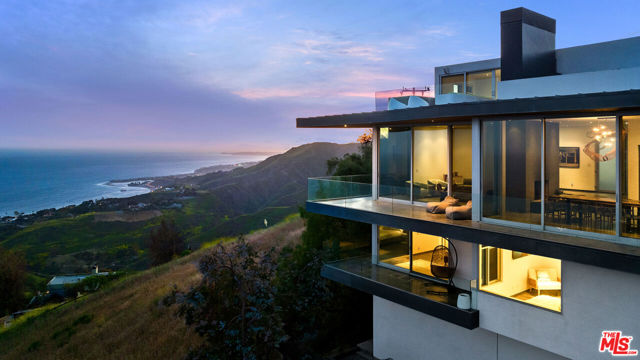 Stunning modern masterpiece designed by award-winning architect Steve Kent, AIA. A true architectural gem, crafted with impeccable quality and extraordinary attention to detail. Walls of custom glass seamlessly open to expansive wraparound decks, revealing jaw-dropping, 180-degree panoramic whitewater views from Santa Monica and Catalina Island to the Malibu Pier to Point Dume and beyond. The main house features 4 bedrooms, 4 bathrooms, a private office, and a state-of-the-art media room. A separate 1-bedroom, 1-bathroom guest house with its own private entrance offers ultimate flexibility perfect for guests, a home office, or a recording studio.The sleek Boffi kitchen is outfitted with top-of-the-line Miele appliances including a cooktop, ovens, and built-in espresso machine, complemented by twin Sub-Zero refrigerator/freezers and a built-in Sub-Zero wine cooler. Modern conveniences include fiber-optic internet, a central vacuum system, and a fully integrated sound system throughout the home and outdoor spaces. The setting is exceptionally private, surrounded by natural beauty, yet just three minutes from PCH. Included are two additional parcels: one adjacent lot for additional privacy, and a third lot that grants coveted membership to the exclusive La Costa Beach and Tennis Club. The home also includes membership to the private, guard-gated section of Rambla Pacifico. An extraordinary opportunity to own a one-of-a-kind coastal retreat blending modern luxury, privacy, and panoramic views. Includes the following APN #'s: 4453-011-005 | 44453-010-005 | 4451-022-032. Can be sold furnished and turnkey.