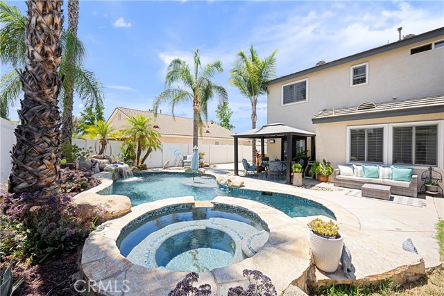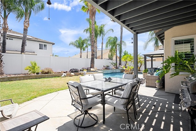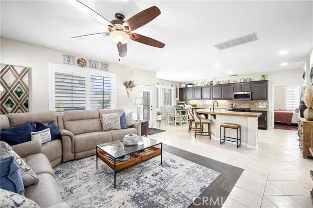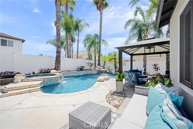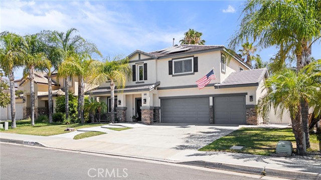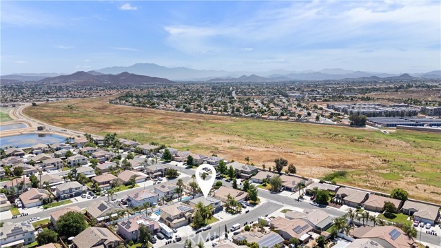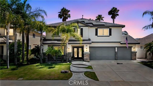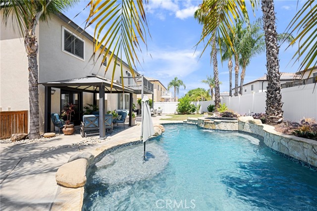 Step into your dream retreat—where amenities and spacious living blend effortlessly with everyday convenience in this two-story pool home offers a flexible and inviting floor plan. The double door entry invites you straight into the formal living and dining room combo ideal for entertaining, high ceilings and plenty of natural light. The home features shutters throughout the home, paid off solar, and recent upgrades throughout. The open concept kitchen, equipped with granite countertops and a large island, opens into the warm and welcoming family room with surround sound. On the main level, a versatile flex room with double-door entry, guest suite, or optional fourth bedroom. Upstairs, discover spacious bedrooms, including a generous primary suite, accompanied by an expansive loft perfect for recreation or quiet relaxation. Outdoors, the private backyard is an entertainer’s dream with a sparkling pool and spa—the perfect retreat for family and friends—and a dedicated dog-run area for pet comfort. Centrally located in a desirable Menifee neighborhood with no HOA and low property taxes, this home offers effortless access to shops as well as the I-15 and I-215 freeways.