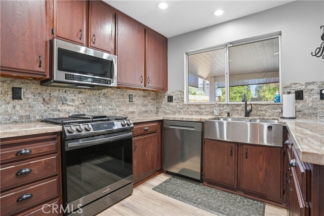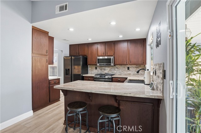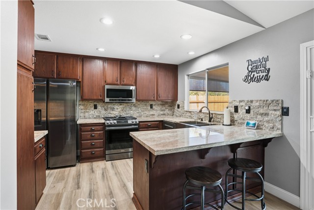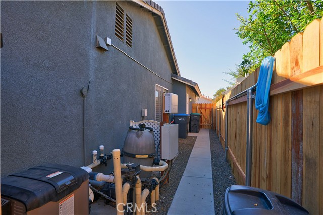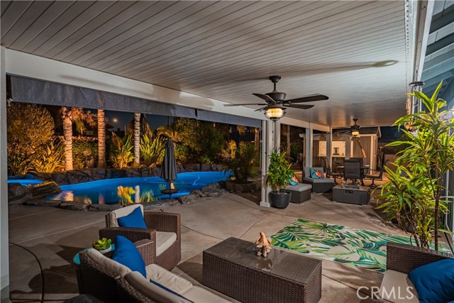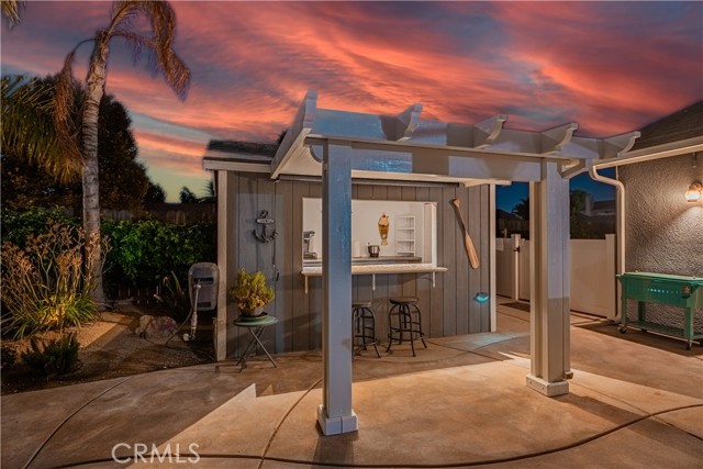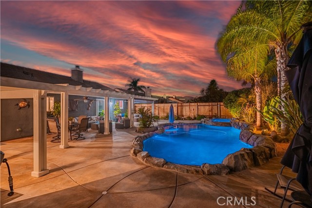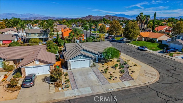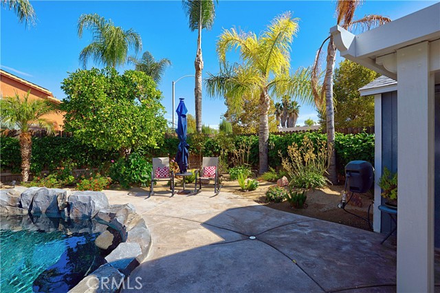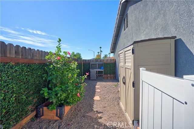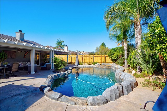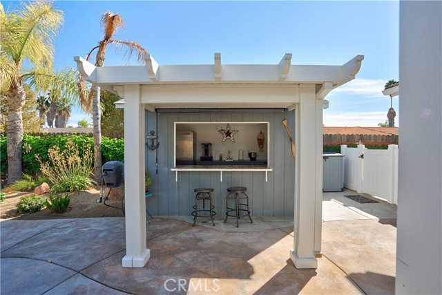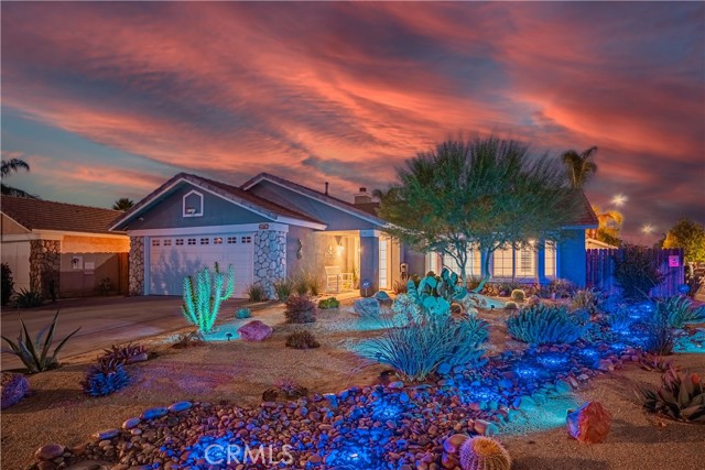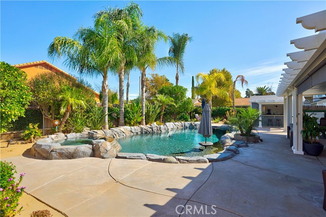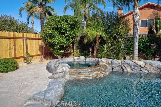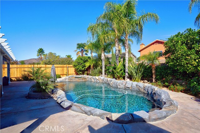 Charming Corner Single-Story in Menifee with Stunning Outdoor Living! This beautifully remodeled 3-bedroom, 2-bath home perfectly blends indoor comfort with resort-style outdoor living. Thoughtfully updated in 2020, the seller has truly checked all the boxes—inside and out. Enjoy a private backyard oasis featuring a Pebble Tec saltwater pool, converted shed turned outdoor cabana, Sonance sound system, and custom lighting. The professionally designed landscaping offers desert-style appeal in the front and a tropical retreat in the back. Additional upgrades include new fencing, rain gutters, a 30-foot patio cover with patio furniture, and an expanded front driveway with brick inlay. Step inside to find newer vinyl plank flooring with 6-inch baseboards, plantation shutters throughout, granite counters, a custom stone kitchen backsplash, and new bathroom vanities. The primary suite includes custom wardrobe shelving, while all bedrooms feature mirrored closet doors. Other touches include a hallway linen cabinet and a new garage door that enhances both function and curb appeal. This home delivers effortless indoor-outdoor living with every detail thoughtfully designed for comfort, style, and entertaining. Low taxes and No Hoa. Professional photos coming soon.