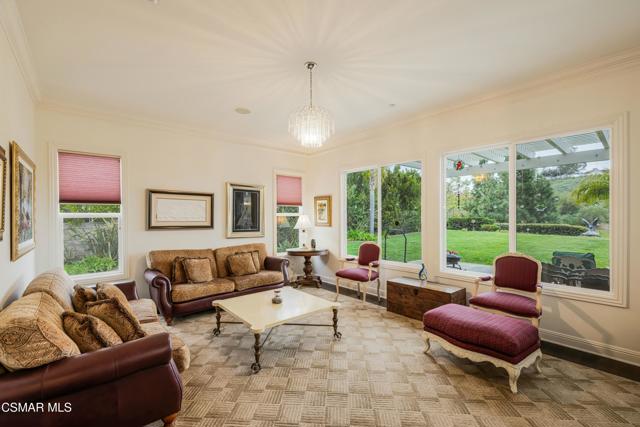 REFRESHED -NEW carpeting & paint - Come take another look at the Open House Sunday - BACK ON MARKET - No fault of property! Buyer's circumstances changed, their loss is your gain. Don't miss this beautiful home! Luxury golf course home for sale - ONLY HOME FOR SALE DIRECTLY ON THE GOLF COURSE come take a look! Welcome to the Moorpark Country Club Estates, nestled in the scenic foothills of Moorpark and adjacent to the renowned Moorpark Country Club, this luxurious popular Santa Barbara model home offers the ultimate in resort-style living. With 5 bedrooms, 6 bathrooms, and over 5,000 sq. ft. of thoughtfully designed living space, this home is a rare find. Positioned directly off the fairway and hole 5, the backyard is a true outdoor paradise featuring a large grassy area, fenced side yard, a separate covered cabana with a cozy fireplace and mounted TV, a stunning 10-person infinity-edge spool (spa/pool), and a dramatic lava rock firepit, bbq island island with brand new gas bbq, perfect for entertaining or unwinding under the stars. Inside, you'll find an updated kitchen with a sleek, modern flair, seamlessly opening to the spacious family room with fireplace, ideal for relaxed gatherings. The formal living and dining rooms offer elegant spaces for hosting and views of the backyard. The expansive primary suite includes a fireplace and a private upper-level balcony where you can take in breathtaking sunset and golf course views. Upstairs, you'll find three additional bedrooms including ensuite bathrooms. A desirable downstairs bedroom with a private ensuite and a separate office provides flexibility for guests or remote work. With timeless style, luxurious amenities, and a premier location, this home captures the essence of California living at its finest. This energy-efficient home also includes fully owned solar, offering long-term savings and sustainability. Located in the gated Moorpark Country Club community, residents enjoy access to fantastic amenities including tennis courts, basketball, pickleball, and multiple playgrounds making it perfect for active lifestyles. With timeless style, luxurious amenities, and a premier location, this home captures the essence of California living at its finest. All that's missing is you!