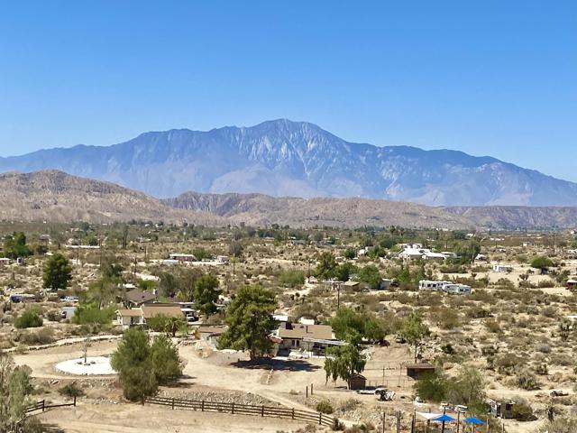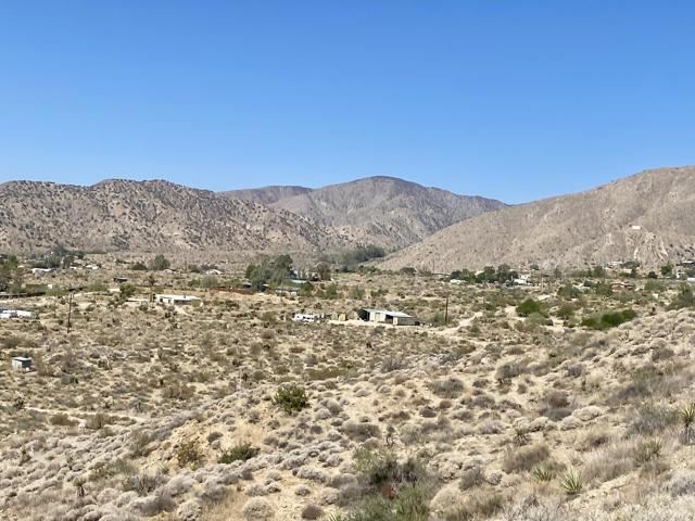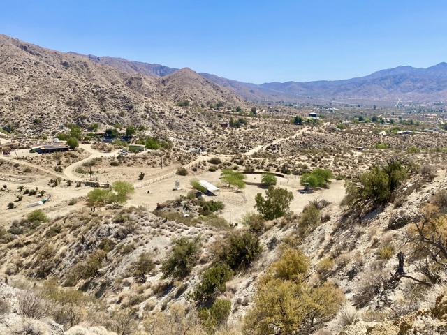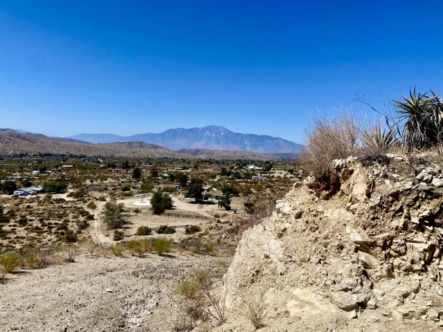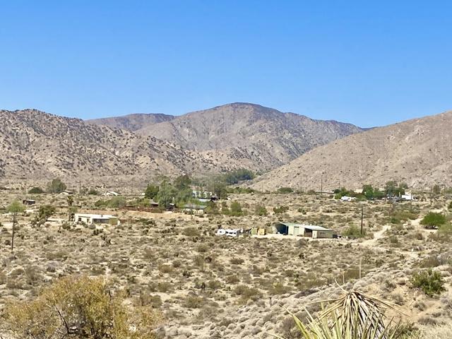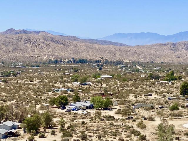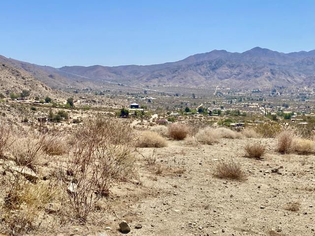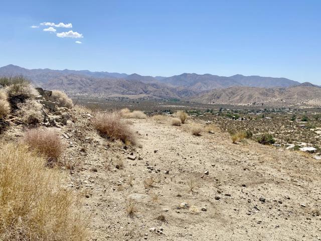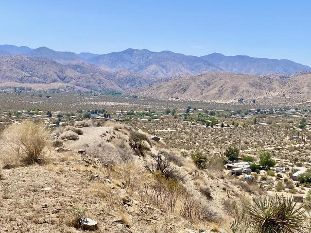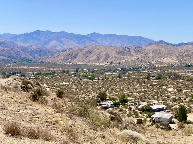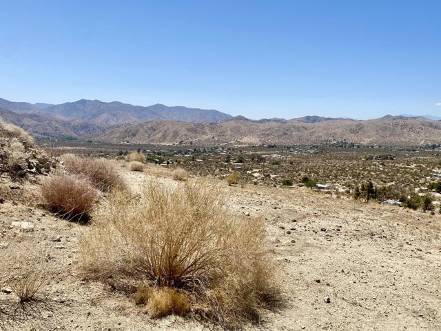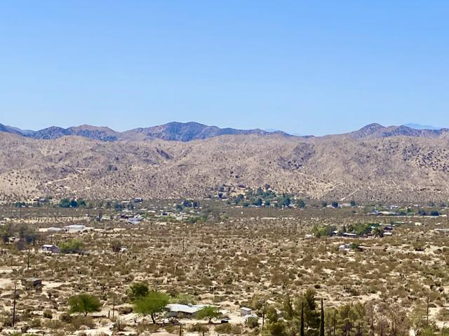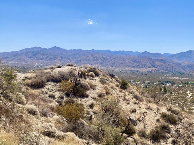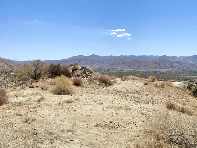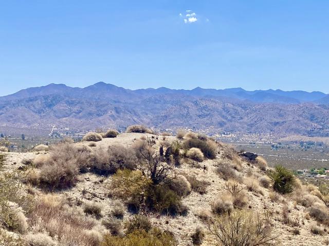 Beautiful & Panoramic 5 acres perched across a breathtaking hilltop ridge. Spectacular views of snow caps on Mt San Jacinto and the little San Bernardino Mtn range. A driveway easement ascends over 100ft to the building pads. Possibilities of a multi-level sanctuary with several opportunities for several building areas. Gorgeous desert fauna with cholla cactus, creosotes and yuccas scattered among the rocks and boulders. This magical lot is close to thousands and thousands of wilderness acres for you to explore. Horse property. Starry nights and shimmering city lights. Higher elevation offers milder summers than the Coachella Valley which is just a short drive down the Morongo Pass. Ideal for a modern luxury compound hideaway. The county may allow for two homes and guest homes. The property appears to be RL-5 zoned lot which may allow for owners to enjoy limited camping. Utilities appear to be on Cheyenne with power and water access with the deeded easement. Seller owns mineral rights which are negotiable. 36 miles to Palm Springs. 20 miles to the Joshua Tree National Monument where about 3 million tourists visit the park annually. 45 miles to the Coachella Valley Music & Arts Festival which averages 100,000 visitors each day of the event. 114 miles to Los Angeles. Make your dreams come true. Buyers must contact the county planners for all questions on building and uses. Buyers must contact the appropriate utilities agencies for all questions on utilities. Address is a real assigned address, easement is to Cheyenne. GPS: 34.08946, -116.54871 Don't Wait! - Call Now! APN: 0581-161-06-0000