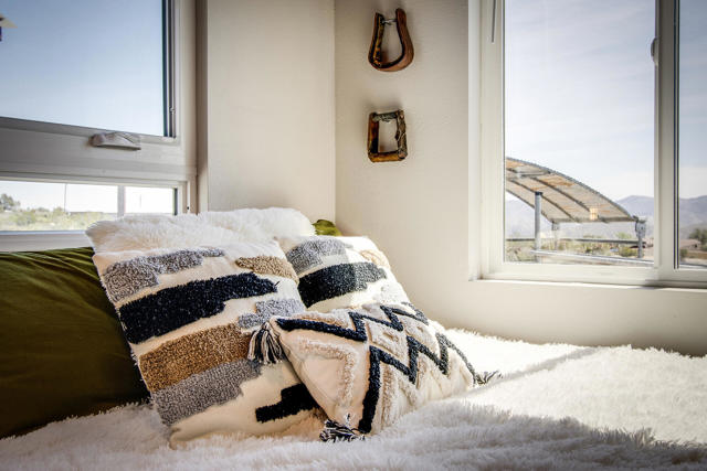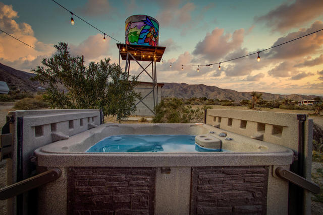 Welcome to Owl's Nest--a truly one-of-a-kind high desert retreat situated on 5 sprawling acres with breathtaking panoramic mountain views in every direction, including stunning vistas of Big Morongo Canyon. This beautifully renovated home captures the essence of high desert living with warm, rustic charm and thoughtful design throughout. Though compact in size, every inch of this home has been masterfully utilized. The inviting living room features large picture windows that flood the space with natural light and frame the spectacular views, along with a cozy gas fireplace perfect for cool desert nights. Just outside the living room, you'll find a small fenced-in dog run area--ideal for your furry friends to safely enjoy the desert air. The kitchen is a true gem, offering a charming breakfast bar with a picture-perfect window where you can sip your morning coffee while taking in the serene landscape. With a copper sink, wood cabinetry, and stylish finishes, the cabin radiates character and warmth. Outside, the magic continues with two horse stalls and a painted water tower adorned with an owl--an ode to the property's name. A fully finished and beautifully styled shipping container offers two additional sleeping areas and a bathroom, creating a dreamy private guest retreat. Whether you're looking for a peaceful full-time residence, a weekend getaway, or an incredible investment opportunity as a vacation rental, Owl's Nest offers an unmatched blend of comfort, charm, and natural beauty--this is desert living at its finest.
