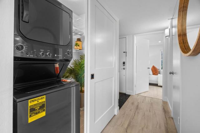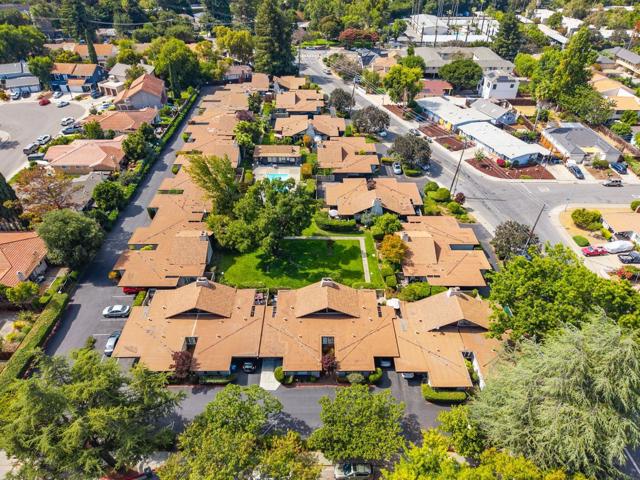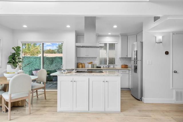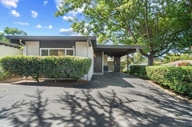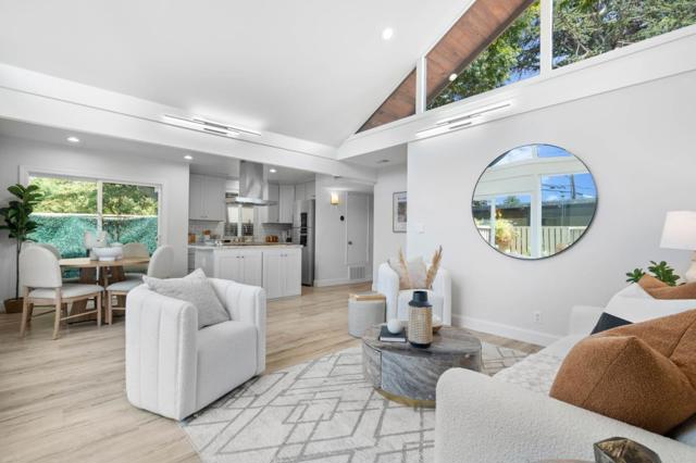 Contemporary single-level end-unit PUD (FEE ownership of land) tastefully remodeled with premium finishes. This unit is special in that it features inside laundry and central A/C. Dramatic tall ceilings with numerous windows fill the open and bright floorplan with natural light. Freshly painted interiors, wood-like vinyl floors throughout, dual paned windows, recessed lights. Spacious living and dining room combination features the towering ceilings and expansive windows with garden views and sliding doors open to private patio for easy indoor-outdoor enjoyment. Remodeled designer kitchen features white cabinetry topped in granite slab with white subway tile backsplashes; center island includes an smooth-surface electric cooktop and suspended stainless steel vent hood. Other appliances include a GE Profile oven, Samsung dishwasher, and Summit smart refrigerator. Primary bedroom features en-suite bath with updated vanity topped in marble-style quartz, and frameless-glass shower. Bedroom 2 has direct access to a dual-entry bath (shared with the hallway). Covered carport parking, guest parking + off-street parking. Community amenities include a greenbelt park plus pool and cabana. Conveniently located moments away from downtown Mountain View Castro Street, Highways 237 & 85.
