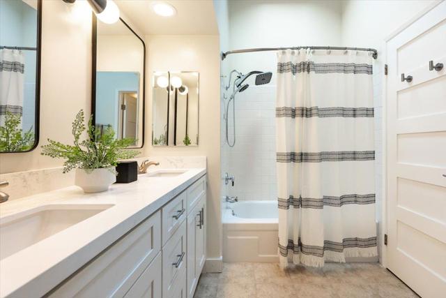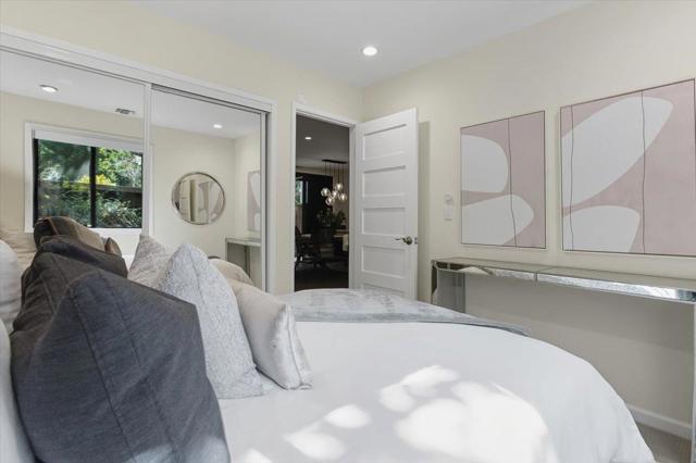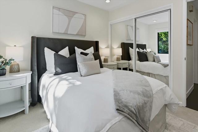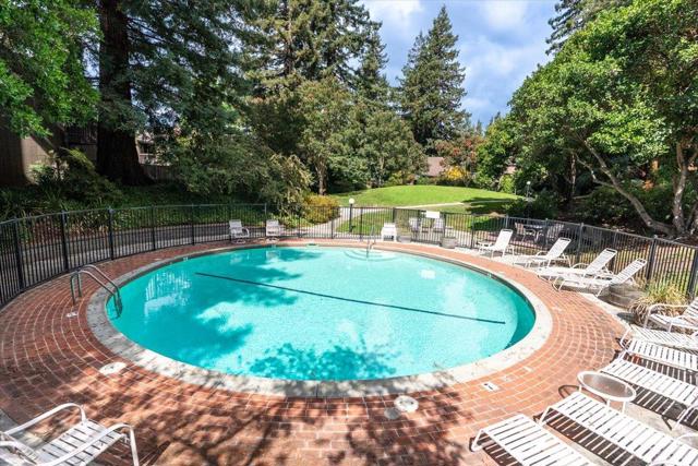 This beautifully updated 3 bedroom, 2 bath Cypress Point Villas townhome combines a tranquil setting with unbeatable convenience. Just steps from Downtown Mountain View, Caltrain, Light Rail, and Stevens Creek Trail, with easy access to Hwy 85, 237, 101, and Central Expressway. A spacious open floor plan is highlighted by wood vaulted ceilings in the living room and upstairs bedrooms, large windows, and sliders that open to the wraparound deck, creating the ideal indoor-outdoor space for entertaining or relaxing by the nearby pool. The modern kitchen features shaker cabinets, Fischer Paykel and Bosch appliances, ample counter space, a breakfast bar, and a large storage area under the staircase. A bedroom and full bath downstairs provide the perfect space for guests or a home office. Upstairs are two spacious bedrooms, a bathroom with tub and shower, laundry, and a private deck overlooking the green space. The primary bath includes a new double-sink vanity with quartz countertop and undermount sinks. Additional features include custom, stylish, and functional Hunter Douglas Smart shades with blackout in all bedrooms, central AC, new carpet and paint, covered parking conveniently adjacent to the front door, and a private storage area. Move-in ready and ready to make your home!