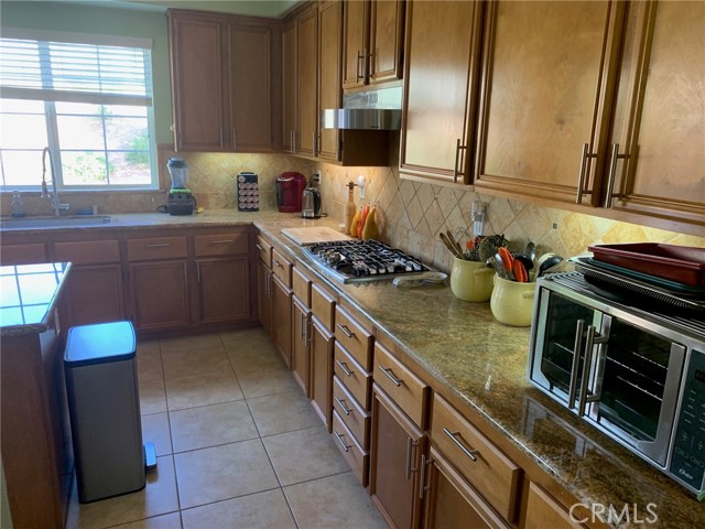 Move in ready gorgeous home in Murrieta with no HOA fees….walk thru a vine covered archway w/shrubbery to your front door into over 3000 square feet of well laid out living space with high vaulted ceilings, natural lighting throughout, starting with a library/sitting room and a dining room enhanced with custom paint throughout the house. Kitchen is graced with custom designer granite with custom travertine tile backsplash throughout kitchen and butler’s pantry, stainless steel appliances, Electrolux cook top with 5 gas burners, stove hood, Whirlpool oven, microwave and dishwasher, oversized stainless steel one piece sink with satin nickel goose neck faucet, stainless steel drawer pulls, walk-in pantry, center island, chandelier in eating area, family room warmed by wood burning fireplace, half bath w/vanity, custom Acacia hardwood flooring in family room, dining room and library/sitting room. Upstairs is a large loft area ideal for home office on one end and game room on the other end all overlooking main floor, w/ spacious master bedroom w/walk in-closet, large well-appointed bathroom, laundry room w/sink and storage cabinets, three other large bedrooms with two other full bathrooms, all four full bathrooms have 18†ceramic tiles, all five toilets are one piece toilets, new 75 gallon gas water heater, three car garage with insulated interior garage doors, back yard well landscaped w/ 3 olive trees, one lemon and one orange tree w/full automatic sprinklers for front and back yards. Close to 215 freeway, several hospitals and a full assortment of restaurants and shopping including Costco.