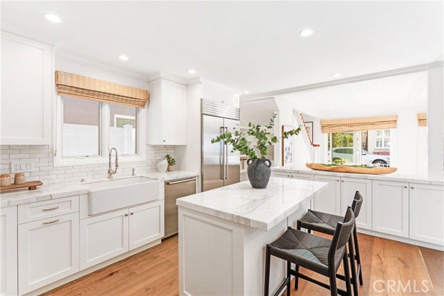 Outstanding opportunity to own a turnkey 4-bedroom, 3-bath home in a prime 100-block location on Balboa Island, just four doors from South Bayfront. The spacious front patio offers Bay views and opens to the first level with an open floor plan, living room with fireplace, dining area, family room, and a bedroom with en-suite bath. The remodeled kitchen features quartz counters, custom cabinetry, a large island, and Wolf and SubZero appliances. Upstairs, the primary suite showcases vaulted ceilings, a fireplace, built-ins, and a covered deck with Bay views. Two additional bedrooms and a bath, a second family room, and a separate laundry room complete the second level. A rare chance to experience the best of Balboa Island living.