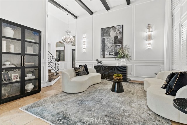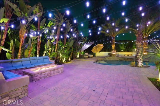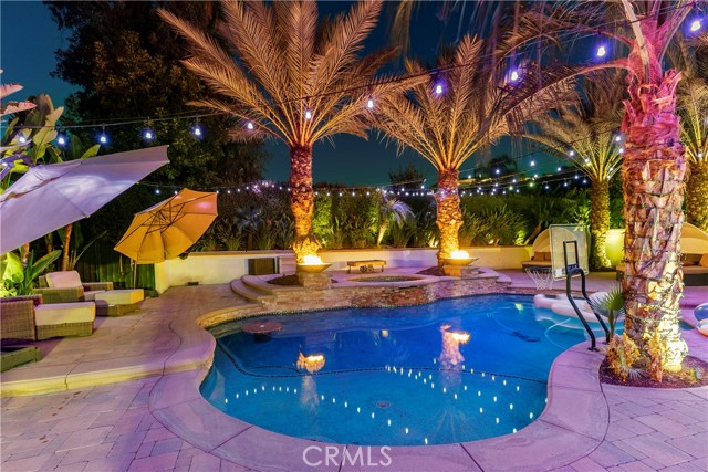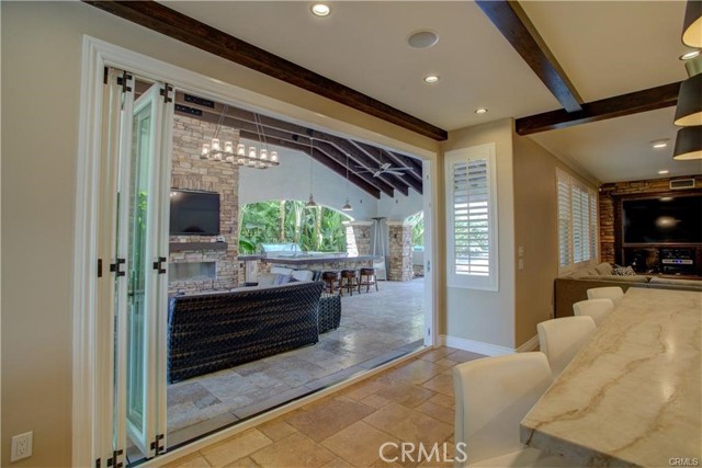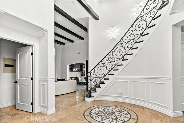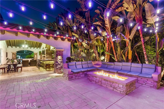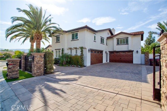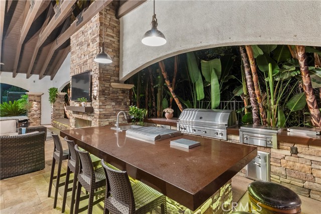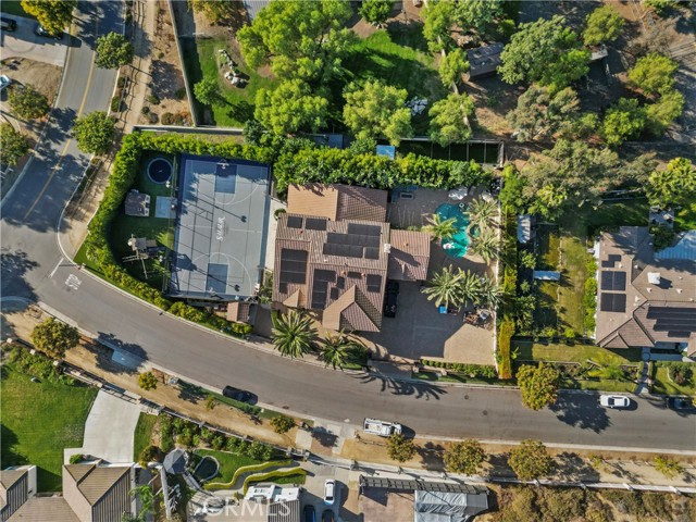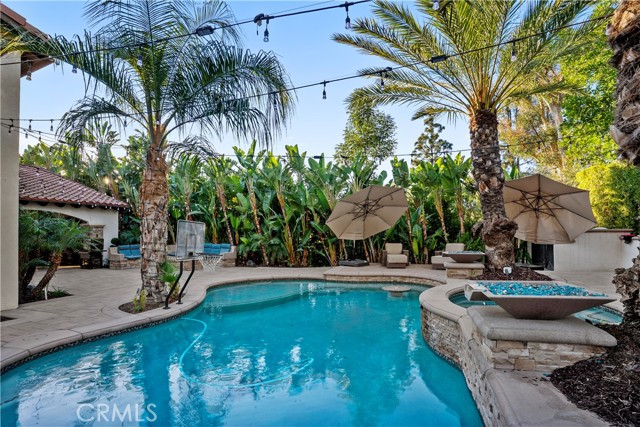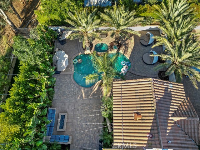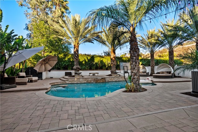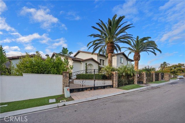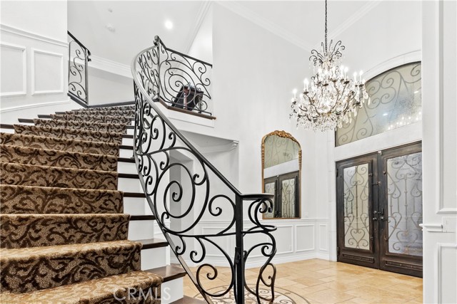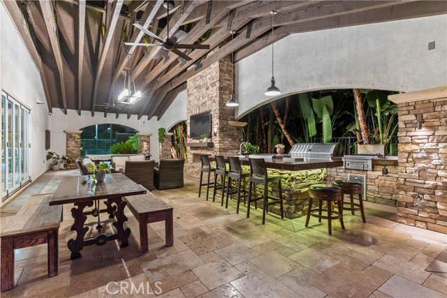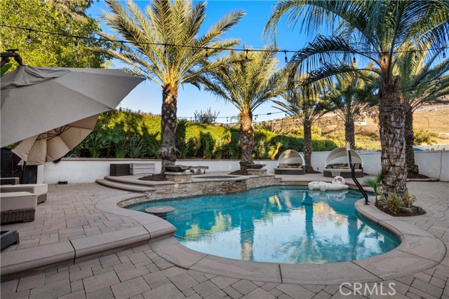 This magnificent 6-bedroom, 5-bath estate welcomes you with lush palm trees, a gated entrance, and grand double wrought-iron doors that open to an elegant mosaic inlay and travertine flooring throughout the first floor. Stunning Norco Hills home, thoughtfully designed with luxury and comfort in mind. The main level includes a bedroom with an en suite bathroom and custom closet organizers, tall windows dressed with long, flowing drapes that fill the formal living room with beautiful natural light, and a sophisticated wet bar featuring a Sub-Zero mini refrigerator, nugget ice maker, lighted cabinets, and built-in wine racks leading into the dining area. The gourmet kitchen offers a built-in Sub-Zero refrigerator, Wolf six-burner range with griddle, oversized island with built-in microwave and warming drawer, walk in pantry and flows effortlessly into the family room complete with a fireplace and custom entertainment center. Accordion doors open to a stunning 1,000-square-foot covered patio with ceiling fans, a gas fireplace, and a top-of-the-line Lynx outdoor kitchen equipped with a grill, hibachi, ice maker, and refrigerator. The backyard is an entertainer’s dream, boasting a Salt water heated pool with fire-bowl waterfalls, custom concrete seating with a fire pit, a full outdoor fitness court, playhouse, built-in trampoline, dog run, and two large storage units. The home also features two 2-car garages with custom cabinetry, an indoor laundry room with granite counters, and ample storage throughout. Upstairs, a mezzanine landing leads to spacious bedrooms with custom closet organizers and a luxurious primary suite with a gas fireplace, dual walk-in closets, illuminated vanity mirrors, dual sinks, jacuzzi tub, and a steam shower with multiple shower heads. This remarkable home blends luxury, comfort, and functionality and comes fully equipped with solar panels for energy efficiency.