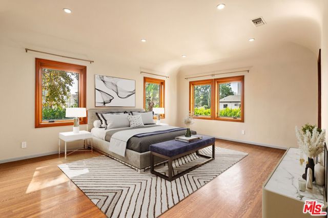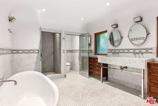 Tucked behind soaring 18-foot hedges, this private Spanish estate seamlessly blends classic 1920s architecture with sophisticated modern updates. Originally built in 1927 by Tony La Maida, the home has been meticulously restored and expanded into a serene compound featuring a 25-meter lap pool and spa, outdoor kitchen, fireplace, shower, koi pond, and multiple patios designed for true indoor-outdoor living. Inside, a dramatic foyer with a sweeping spiral staircase sets the tone for elegant entertaining. The main level includes a grand formal dining room, sun-filled living room with marble fireplace, family room, office, and chef's kitchen with Wolf and Sub-Zero appliances. A guest suite and dual powder rooms complete the first floor. Upstairs, the primary suite offers a marble-clad bath with soaking tub, plus three additional en-suite bedrooms and two balconies overlooking the lush grounds. Additional features include a 520-bottle wine cellar, detached one-bedroom guest house with full bath, and gated parking for six or more cars. Updated systems include 60 solar panels, new Pella windows and doors, copper plumbing, five HVAC zones, Tesla charger, and whole-house water filtration. Moments from the NoHo Arts District, Toluca Lake, and Studio City's best dining and shopping, this historic compound offers rare privacy, character, and craftsmanship in a premier location.