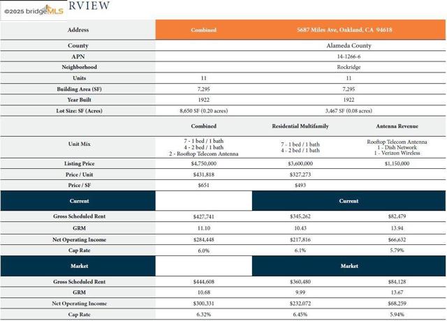 We are pleased to present 5687 Miles Avenue, an exceptional 11-unit multifamily investment opportunity located in Oakland's premier Rockridge neighborhood. This trophy asset offers investors a rare combination of stable residential income as well as substantial commercial revenue through long-term wireless carrier roof top leases. The property's strategic positioning directly across from the Rockridge BART station provides unmatched connectivity to major employment centers, with 22-minute access to San Francisco's Financial District and seamless highway connectivity via Route 24. The building's desirable unit mix of studios through two-bedroom apartments commands strong rents in a neighborhood characterized by affluent demographics, including a median household income of $212,638 and exceptional walkability (Walk Score 97/100).