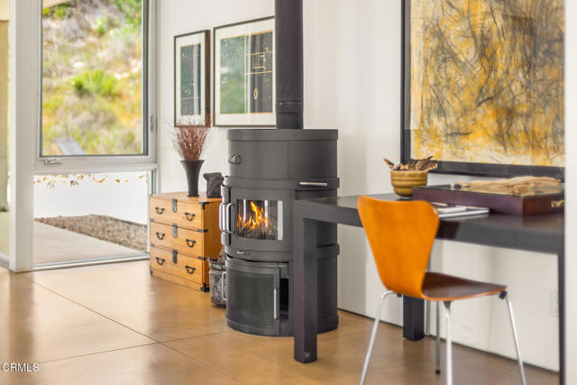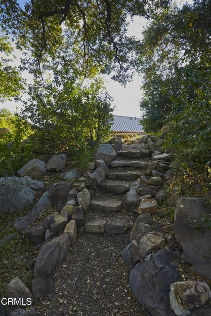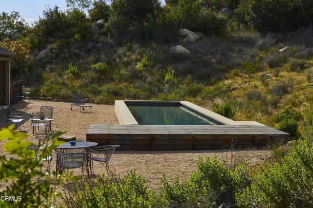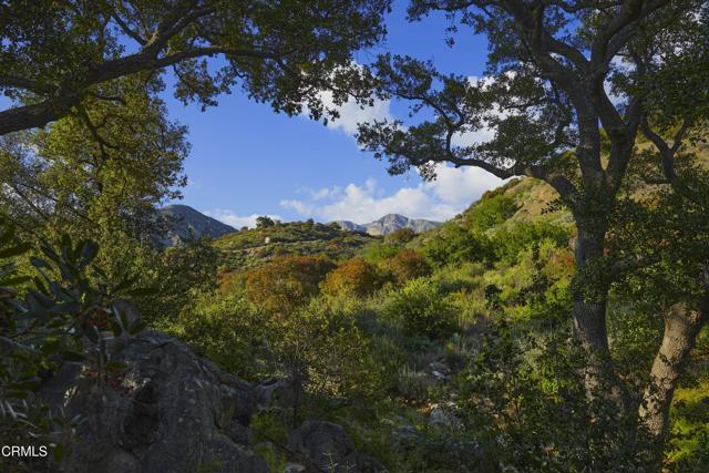 This remarkable forty-four-acre property is set just beneath the Topatopas in Upper Ojai's rugged backcountry where the architect owners designed a modern, sustainable, residential compound. Over the last sixteen years they have rewilded the landscape and developed the walking trails that now vein its chaparral, oak meadowland, sage scrub and riparian habitats. Approached from the South, the compound is entirely hidden from the road. The house, guest house, pool & terraces are enfolded in the crook of a dramatic eastern ridge that provides unparalleled privacy, yet affords views of the Santa Ynez Mountains, the Upper Ojai Valley and Sulphur Mountain Ridge. The property is situated half-way between Ojai and Santa Paula.Surrounded by its gravel precinct, the light-filled, minimalist house sits amidst the trees and shrubs of the chaparral and includes three bedrooms and two baths. The cathedral ceilinged living, dining & kitchen flow into one another flanked by broad passageways and bookended by towering walls that demark the functions. To the North, the house opens to a 12' X 48' pool with views of the Topatopa foothills and beyond, to the mountain's iconic spalled face.Mindful of the heat of summer, the house features shallow covered porches, or loggias, which open to the north and south & provide full summer shade and welcome winter sun. These loggias can be closed behind steel barn doors when there is the threat of wildfire. When not in use they park against the solid stucco walls of the house.The guesthouse/studio and a two-car garage sit below the last curve of the driveway which sweeps up to the house. Its linear design echoes the building above and provides two airy studios linked by an entry hall, a 3/4 bath and an efficiency kitchen.The property comprises two 20+ acre parcels separated by a low ridge dotted with native walnuts, oaks, toyon, and Matilija poppies. The western parcel is bordered by the year-round Bear Creek. Its meadows rise gently to a magnificent oak grove and offer opportunities for both architectural and agricultural development. The residential compound is carefully integrated within a landscape that nurtures the local fauna, birds, bees, hummingbirds and pollinating butterflies, while its buildings are holistically designed to provide serenity, utility & sustainability.Recently certified by Ojai Valley Land Conservancy's 'Rewild Ojai' initiative, the estate was featured on their 2025 Native Garden tour.