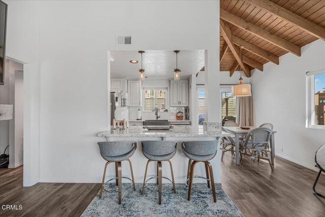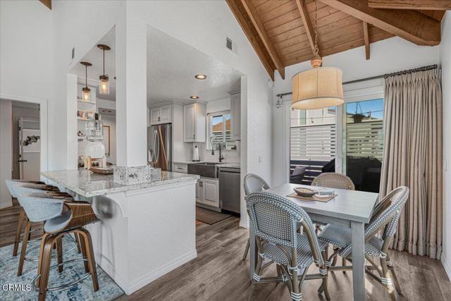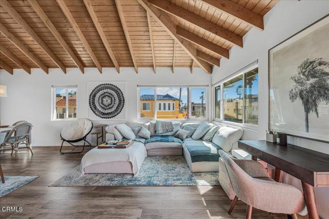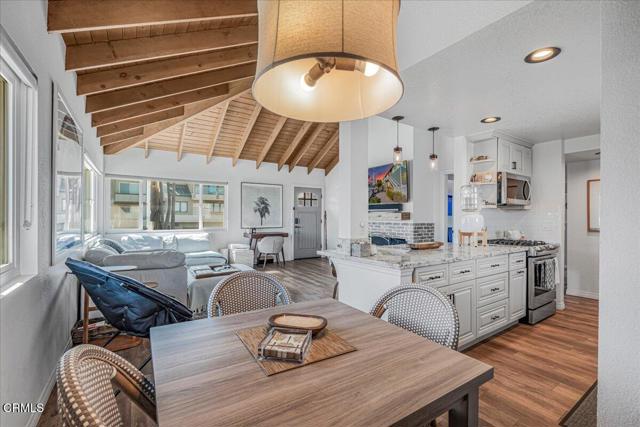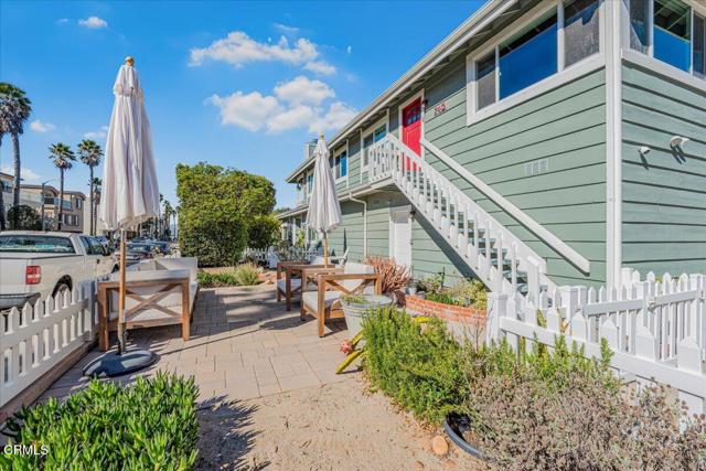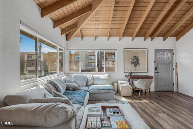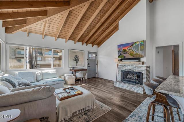 Coastal Comfort Meets California Charm -- Just steps from the sand, this beautifully updated 2-bedroom, 2-bath one-of-a-kind condo in Oxnard Shores offers the perfect blend of beachside serenity and modern convenience. Enjoy peek-a-boo ocean views from the living room and bedroom, vaulted wood-beam ceilings throughout, and a cozy fireplace that anchors the inviting living space. Both bathrooms have been remodeled with skylights that fill the rooms with natural light, and the chef's kitchen shines with newer cabinetry, stainless appliances, and a striking copper sink. The primary suite features a walk-in closet and serene ambiance, perfect for unwinding after a day at the beach. Entertain with ease on the dining deck or in one of two spacious patios--complete with a fire pit, garden area, and a fenced-in space ideal for pets.Additional highlights include a 2-car garage with washer, dryer and EV charger, plus a dedicated parking space for guests or extra vehicles. Dual-pane windows and a low HOA add comfort and value. Nestled between Malibu and Santa Barbara, this move-in-ready gem delivers coastal living at its finest--complete with ocean views from your front door