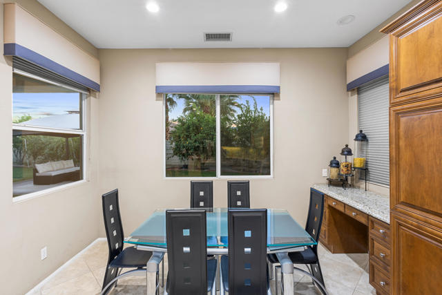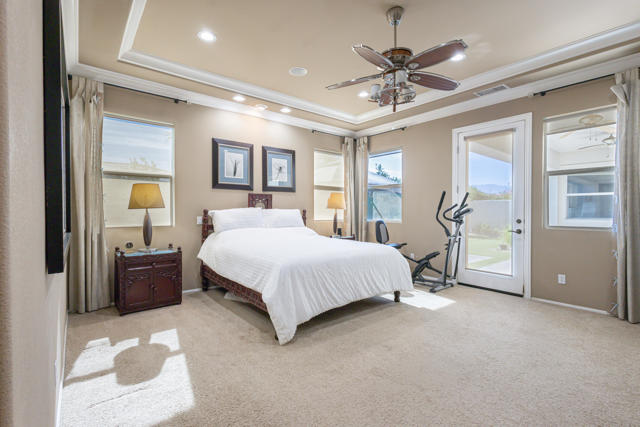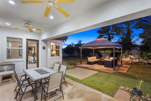 Desert Dream Home! This former model home sits on a quiet cul-de-sac in the gated community of Brenna at Capri, near Ronald Reagan Elementary and Freedom Park. The open floor plan features tile flooring throughout with carpet only in bedrooms, a cozy fireplace in the living room, and a spacious chef's kitchen with granite countertops, a large island, double ovens, pot filler and a five-burner cooktop. The home offers 4 bedrooms and 3 bathrooms, including a convenient Jack and Jill and a primary suite with a built-in closet, soaking tub, dual vanities, and patio access. The backyard is a true garden retreat with multiple fruit trees, over 50 rose bushes, and plenty of space to relax or entertain. Additional highlights include coffered ceilings, plantation shutters, a paver driveway, and two front patio seating areas. This home shows pride of ownership and offers peaceful, low-maintenance desert living at its best. Close to the freeway, shopping, dining and so much more. Make this your home today!