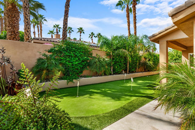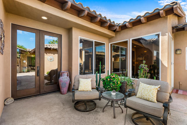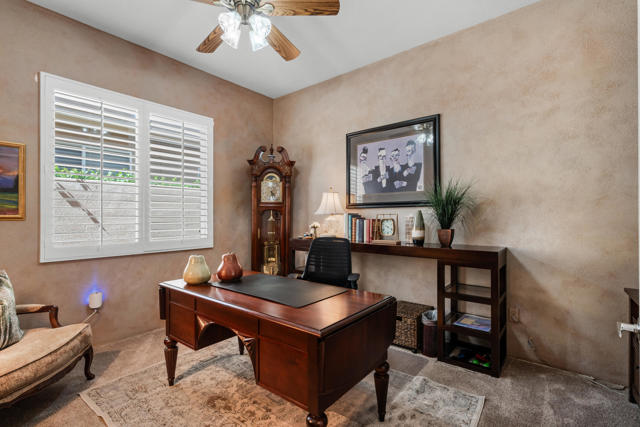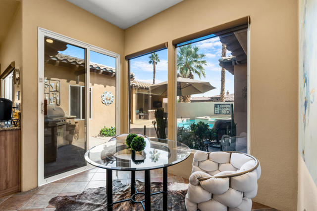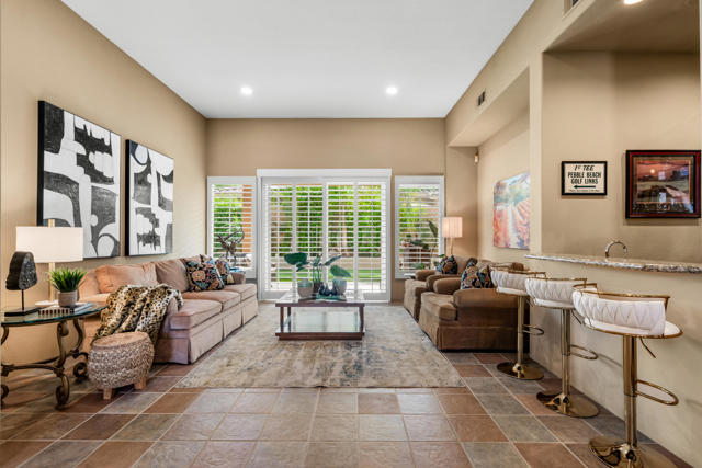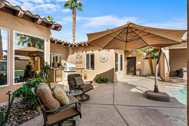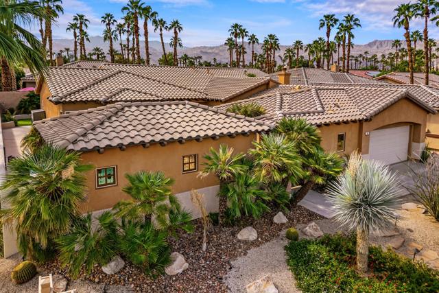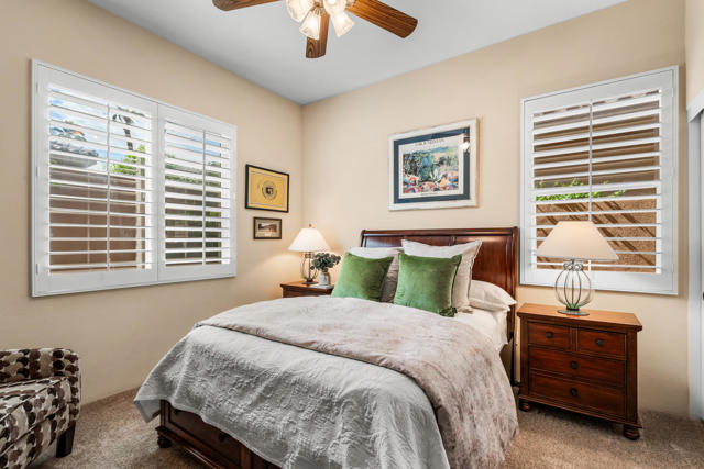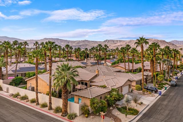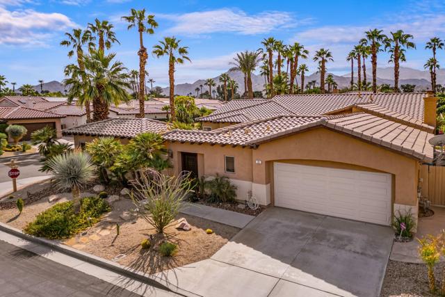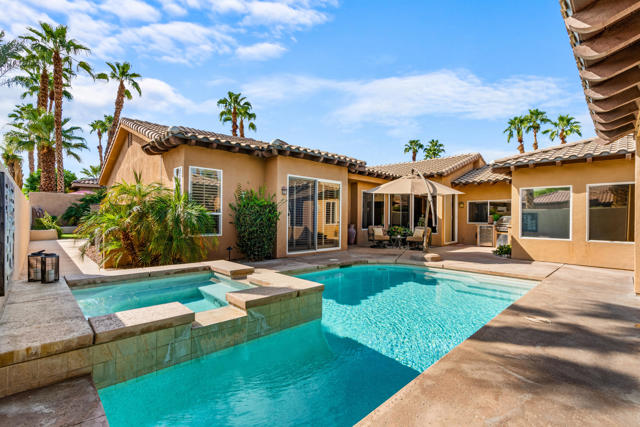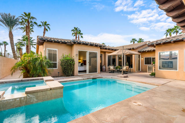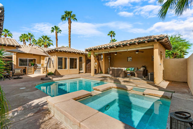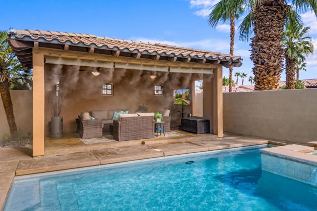 Welcome to Palmira, a sought-after gated enclave celebrated for its privacy, charm, and prime Palm Desert location. This beautifully crafted Plan Three residence features five bedrooms, one is currently used as an office, and three-and-a-half-baths, offering generous living spaces designed for effortless desert living. Soaring ceilings, granite slab surfaces, and refined finishes of tile and plush carpeting lend a timeless warmth to the interiors, while expansive glass doors dissolve the boundary between indoors and out. The formal living room opens to a gracious wet bar and a wall of sliding glass doors, filling the space with natural light and seamless views to the private courtyard and pool. An adjacent formal dining room lends itself to elegant entertaining, while the open-concept kitchen and family room combine for relaxed everyday comfort; complete with a center island, breakfast bar seating, fireplace, and casual dining area that connects directly to the patio. Outdoors, the north-facing courtyard offers resort-style living with a sparkling pool and spa, covered patio with ceiling fans and misters, plus a guest casita, perfect for hosting family and friends. Lush landscaping ensures privacy and tranquility, framing every view in desert beauty. Perfect as a full-time residence or seasonal escape, this home embodies comfort, craftsmanship, and convenience, just moments from El Paseo's boutiques, fine dining, and world-class golf.