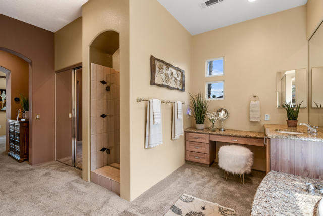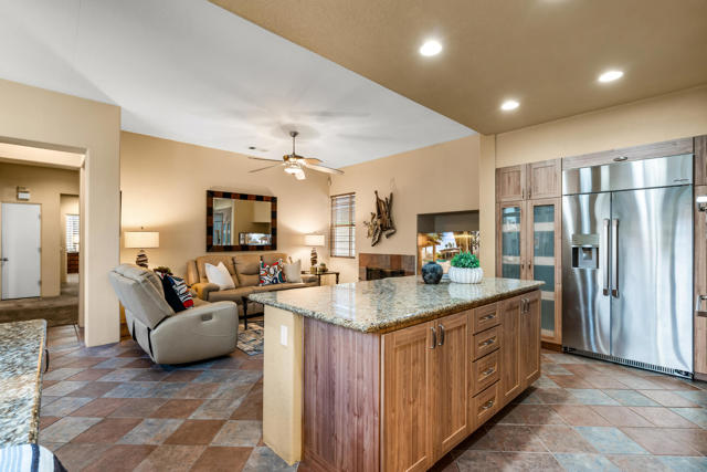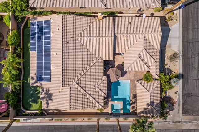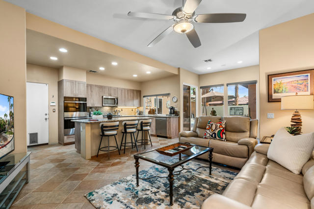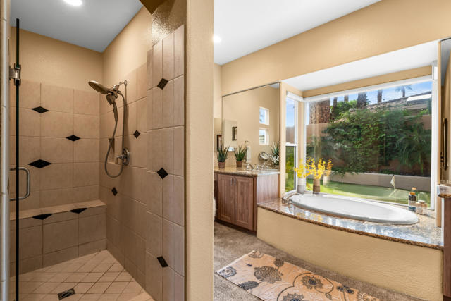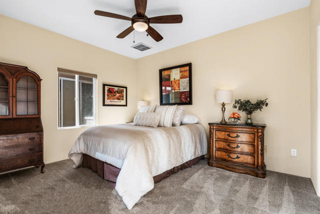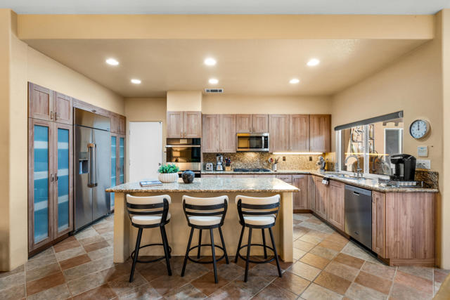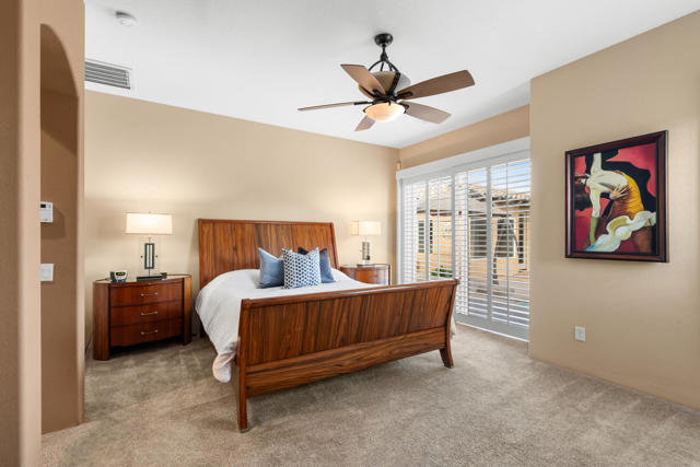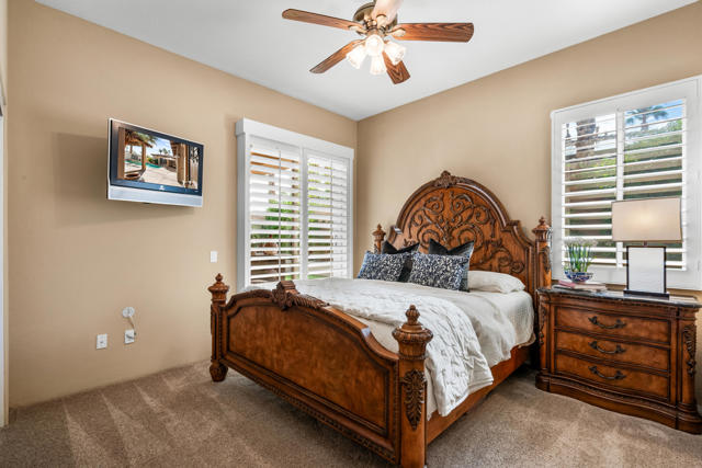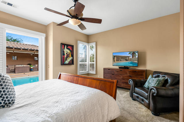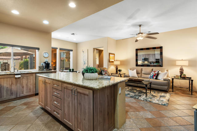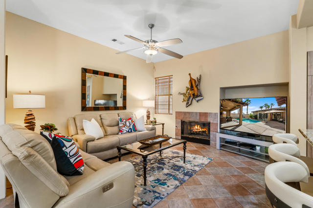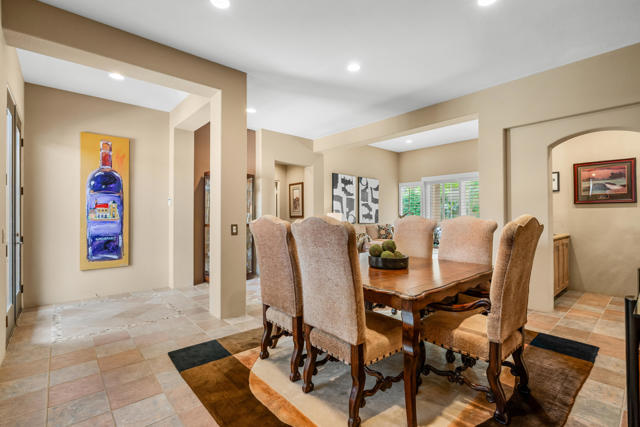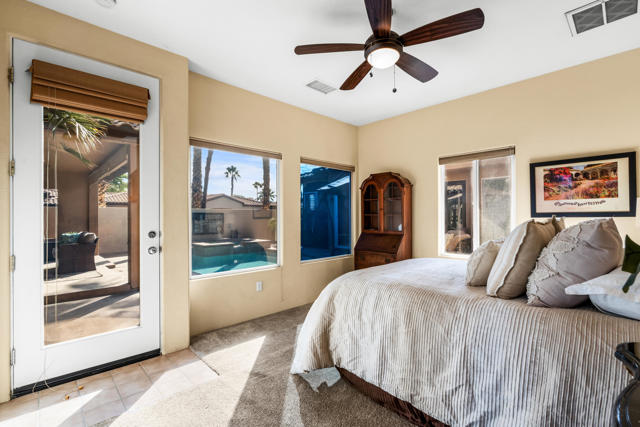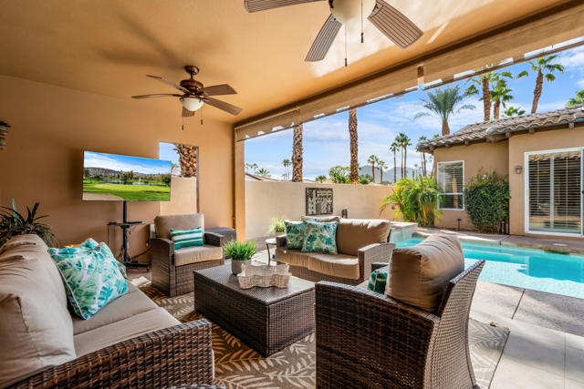 Welcome to Palmira, a sought-after gated enclave celebrated for its privacy, charm, and prime Palm Desert location. This beautifully crafted Plan Three residence features five bedrooms, one is currently used as an office, and three-and-a-half-baths, offering generous living spaces designed for effortless desert living. Soaring ceilings, granite slab surfaces, and refined finishes of tile and plush carpeting lend a timeless warmth to the interiors, while expansive glass doors dissolve the boundary between indoors and out. The formal living room opens to a gracious wet bar and a wall of sliding glass doors, filling the space with natural light and seamless views to the private courtyard and pool. An adjacent formal dining room lends itself to elegant entertaining, while the open-concept kitchen and family room combine for relaxed everyday comfort; complete with a center island, breakfast bar seating, fireplace, and casual dining area that connects directly to the patio. Outdoors, the north-facing courtyard offers resort-style living with a sparkling pool and spa, covered patio with ceiling fans and misters, plus a guest casita, perfect for hosting family and friends. Lush landscaping ensures privacy and tranquility, framing every view in desert beauty. Perfect as a full-time residence or seasonal escape, this home embodies comfort, craftsmanship, and convenience, just moments from El Paseo's boutiques, fine dining, and world-class golf.