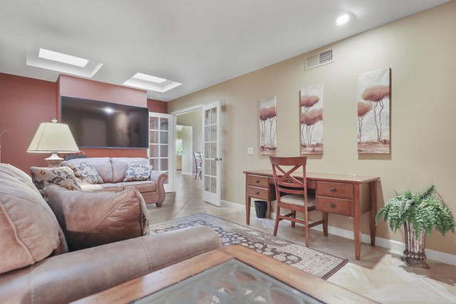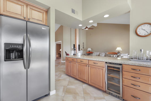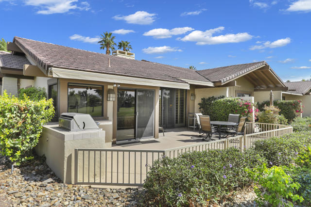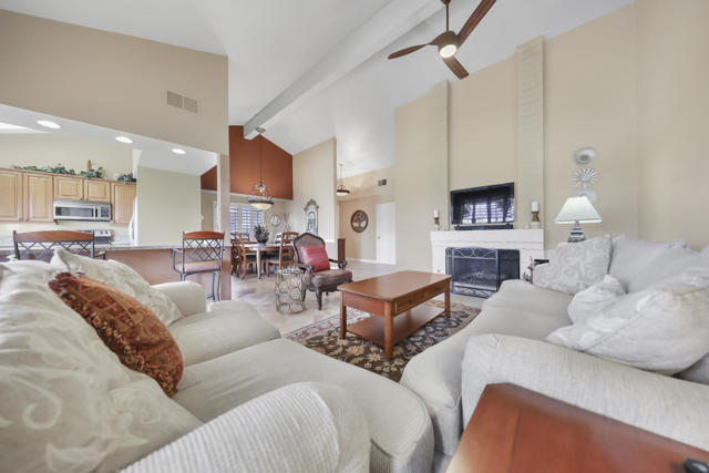 This beautifully updated 2-bedroom + den, 2-bath condo offers the perfect blend of comfort, style, and breathtaking views. The extended south-facing patio showcases expansive double fairway and mountain views, complete with a built-in BBQ, electric awning, and wrought iron viewing fence, ideal for entertaining or quiet relaxation.Inside, the remodeled kitchen has been opened to the living room, creating a bright, inclusive space featuring granite countertops and custom cabinetry. The living room boasts a cozy fireplace and sliders to the patio, while the dining area sits conveniently nearby. The converted atrium expands the den, offering a versatile bonus space.The spacious primary suite includes a generous bath, and the hallway bath features a tub/shower combo. Additional highlights include direct garage access, a 2-car attached garage, tile flooring in main living areas, and carpet in bedrooms. Offered furnished.Located in the fantastic Lakes Country Club, enjoy 27 championship golf holes, 9 pickleball courts, 4 pop tennis courts, 14 tennis courts, 4 bocce ball courts, a state-of-the-art fitness center, library, and an incredible clubhouse with restaurant and bar. It's a lifestyle