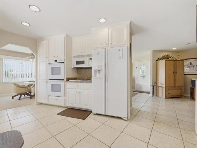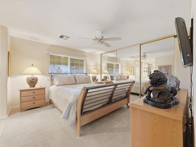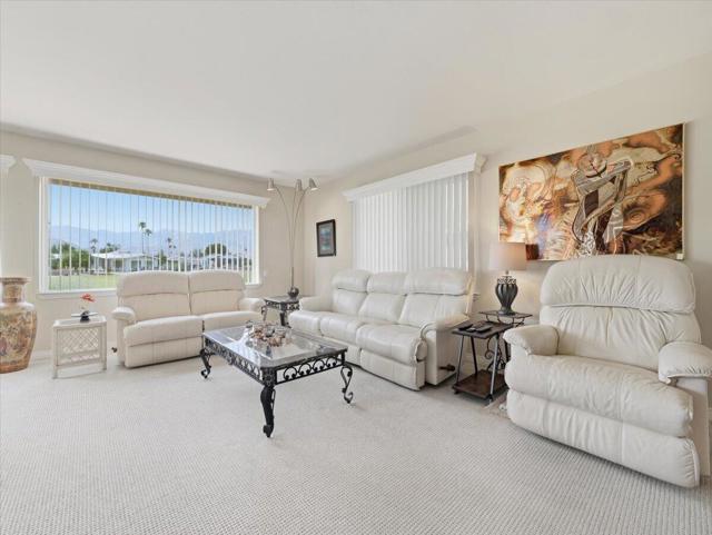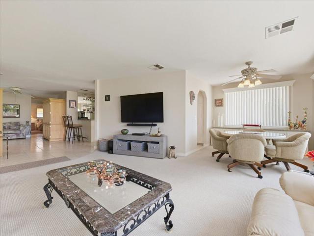Exciting Opportunity to own on the Green Belt with spectacular views of not only the green belt, but of the golf course and mountains! The curb appeal is delightful with artificial grass decorated with bronze statues. The spacious patio features a BBQ and lounging areas to enjoy the view. Upon entering the living, dining, and family room area the views jump out to you from the walls of dual pane windows. This upgraded home has drywall with an open floor plan tastefully furnished throughout. The kitchen has lots of storage with the upgraded kitchen cabinets. The large master suite located in the rear of the home provides a quiet retreat with a dressing area. The guest bathroom has a large Walk-in shower. This home is on tags for possible tax savings.