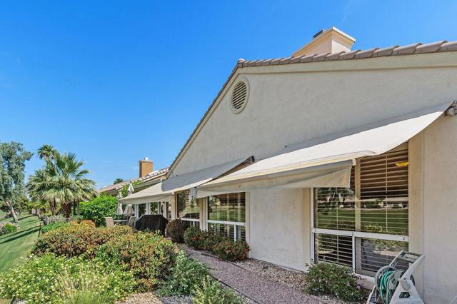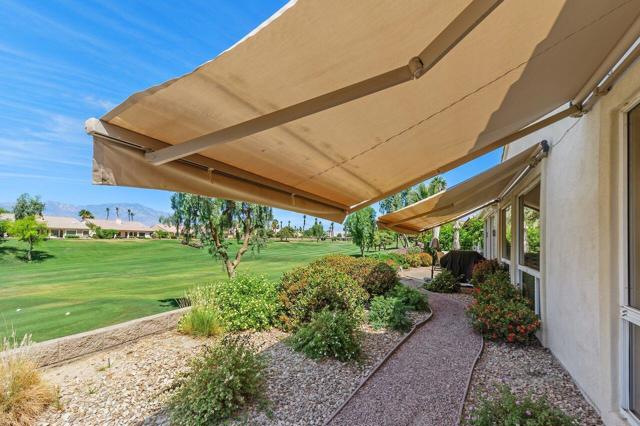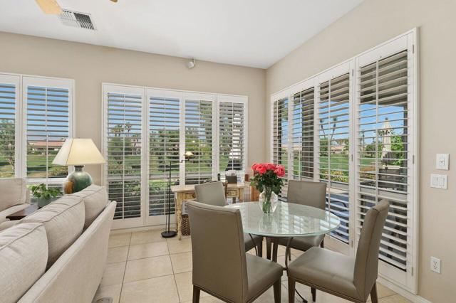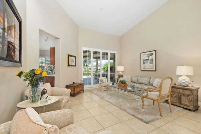 This San Remo model home is situated in Sun City Palm Desert, an exclusive guard-gated golf course community. This 3-bedroom, 2.5-bathroom residence offers 2,432 square feet of living space and is positioned on an elevated lot offering stunning views of the golf course and mountains. The property features a spacious covered patio ideal for enjoying mountain vistas and sunsets. Enter this home through double doors that lead into an interior with soaring ceilings, creating a spacious and inviting atmosphere suitable for relaxation and entertainment. The family room includes a cozy fireplace, enhancing the home's warmth. The remodeled kitchen boasts granite countertops, a breakfast bar, and ample cabinetry. The primary suite is a luxurious retreat, complete with a spa-like bathroom offering dual sinks, a separate shower, a soaking tub, and a generously sized walk-in closet. Throughout the home, plantation shutters enhance both style and functionality. In 2023, the HVAC system and water heater were replaced. The property also offers a two-car garage plus a dedicated golf cart garage. Don't miss this exceptional opportunity to own a home on the golf course in Sun City.