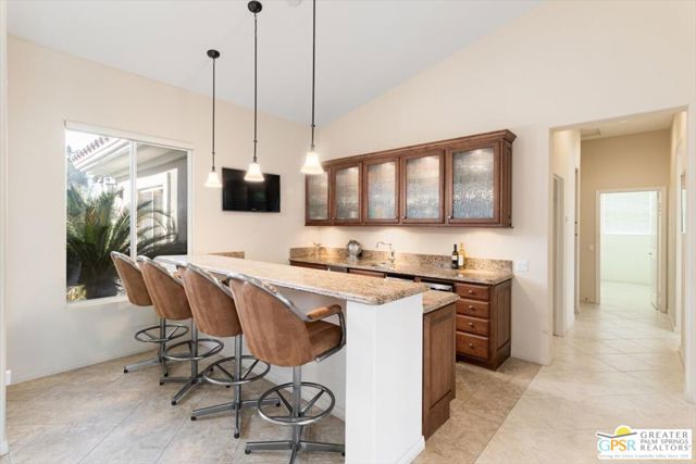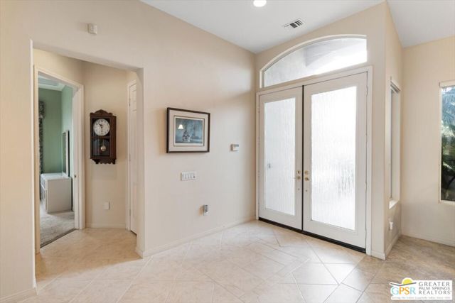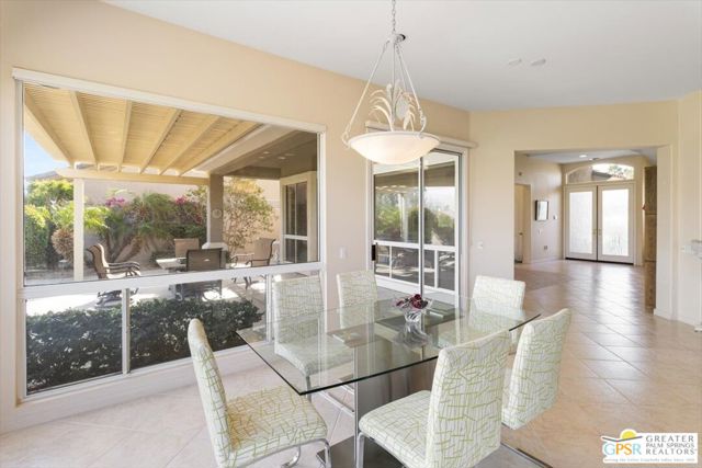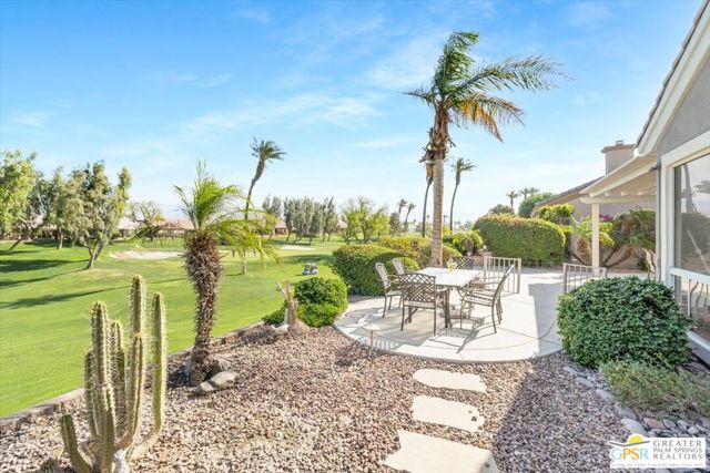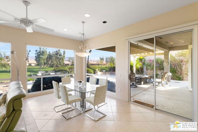 $50,000 price reduction! San Remo plan on the Golf Course with Fabulous Views of the 4th Green and 5th Tee. Views of 3 Mountain Ranges-San Jacinto,San Gorgonio and Chocolate Mountains. Open floorplan with floor to ceiling windows showcasing the Golf Course. Chef's Kitchen features Built in Double Oven, Granite Counters, Pullout Drawers and Reverse Osmosis Water System. Good Size Master Bedroom with Large En-Suite Bath. Bath includes Large Tub, Shower, and Large Walk-In Closet. Great Separtion of Bedrooms. Guest Bedrooms are on other side of home from Master. Ceiling Speakers in Family Room, Living Room, Master and Patio. 4 seat professional bar with ice machine ,2 beverage coolers and sink. Diamond Cut ceramic Tile, Custom Entertainment Center, Central Vacuum, and Circulating Hot Water, Alumnawood Pergola, Misting System with compressor, Mini Split in Garage. Rear yard facing Golf Course has extensive decking. Very convenient easy acces to shoppping using Varner Gate.