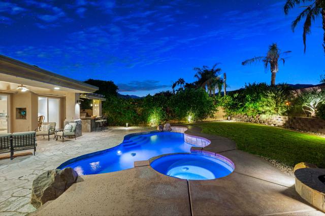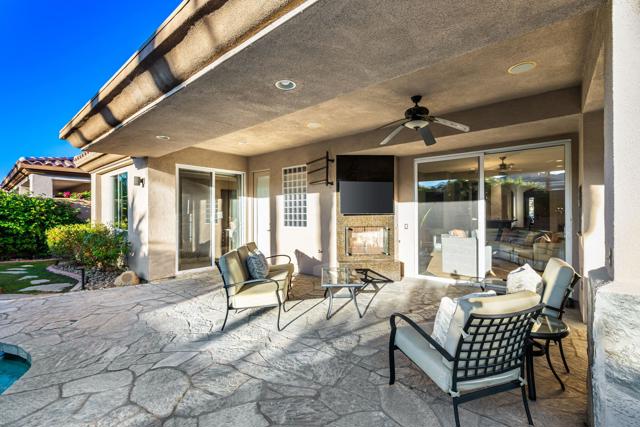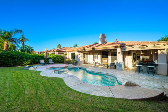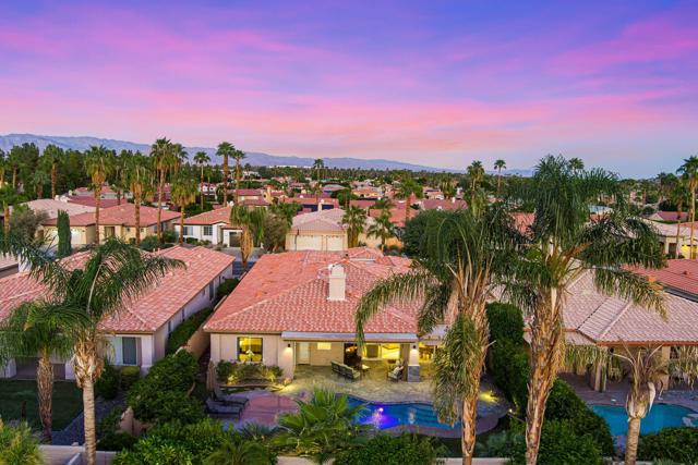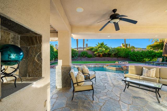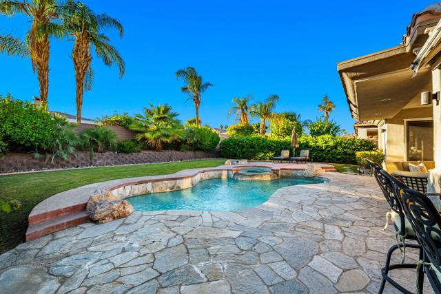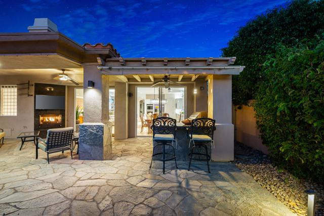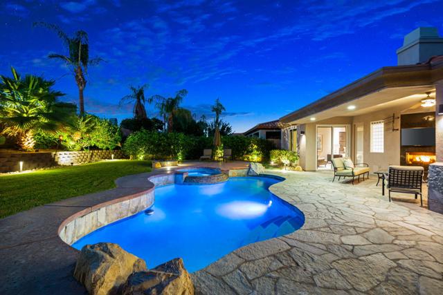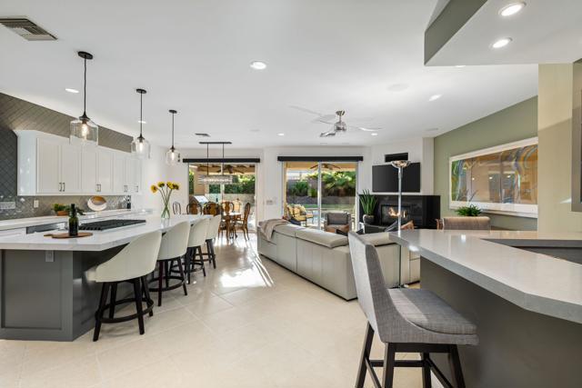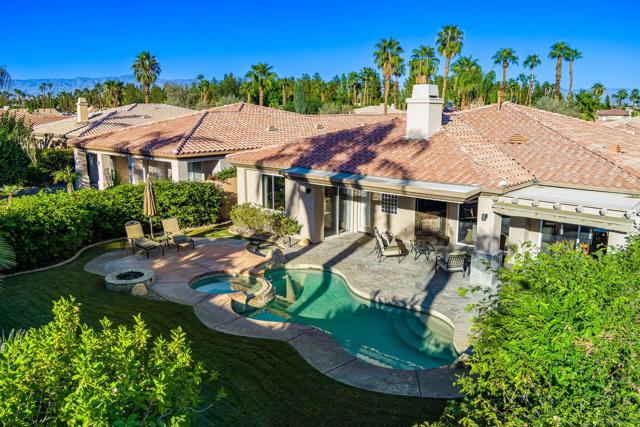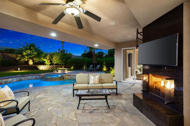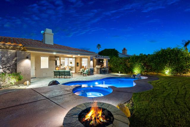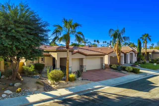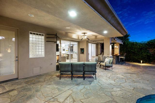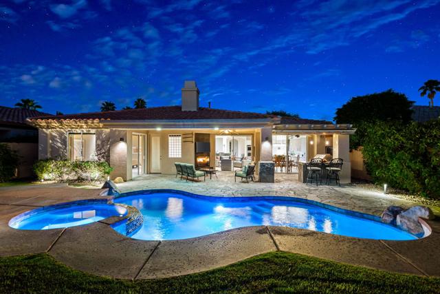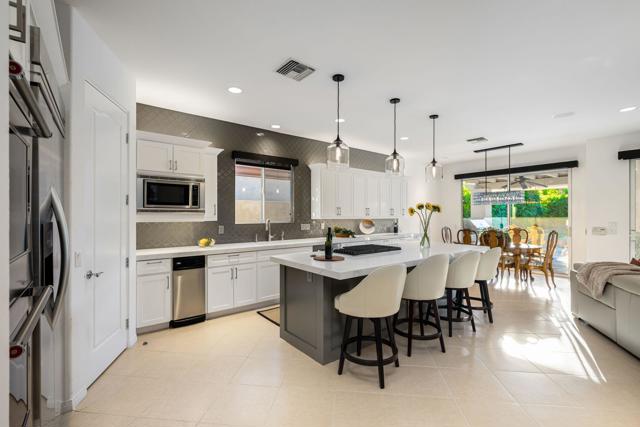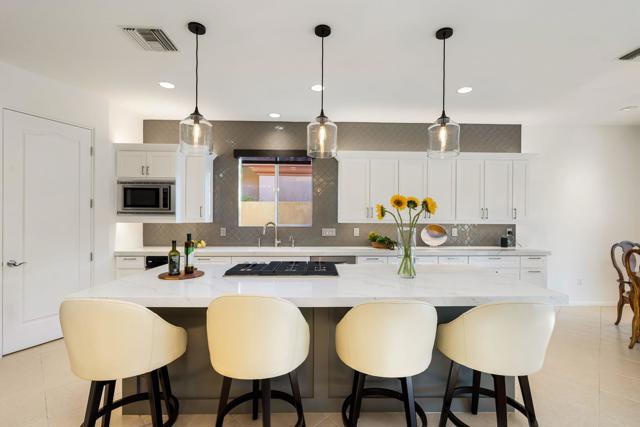 Welcome to your perfect Palm Desert retreat! Ideally situated in a prime central location, this stunning residence offers the best of desert living--just minutes from top-rated restaurants, grocery stores, shopping, and entertainment. Step inside and you'll immediately notice the open, inviting floor plan designed for both relaxation and entertaining. The home features three spacious bedrooms, each with its own en suite bathroom, providing comfort and privacy for family and guests alike. There's also a versatile den equipped with a murphy bed, making it the perfect flex space for a home office, media room, or an additional guest room.The newly remodeled kitchen is the heart of the home, complete with sleek quartz countertops, brand-new appliances, and a modern bar area ideal for hosting gatherings or enjoying a quiet morning coffee. The seamless flow from the kitchen and great room to the outdoor living area creates a true indoor-outdoor lifestyle that's synonymous with the desert experience.Step outside and be captivated by a backyard designed for entertaining and relaxation. The expansive patio features stone columns and flooring and multiple areas to lounge or dine al fresco. Gather around the fire pit, watch your favorite shows on the flat-screen TV, or fire up the built-in barbecue for an evening with friends. The retractable awnings and misting system ensure year-round comfort, while the Pebble Tec pool and spa invite you to unwind in total luxury.Additional highlights include a three-car garage with new garage doors, custom built-ins, and epoxy flooring, offering plenty of space for storage or a home gym. Set within a quiet, family-friendly neighborhood, this home combines thoughtful design, modern upgrades, and a resort-style backyard to deliver the ultimate Palm Desert lifestyle. Whether you're looking for a full-time residence, vacation getaway, or investment opportunity, this property truly has it all.**Original plans reflect approximately 3,085 sq. ft. During construction, the owner added an additional 6 feet to the primary bedroom. Buyer to verify all square footage and satisfy themselves with regard to accuracy.**