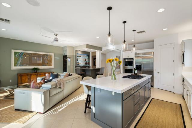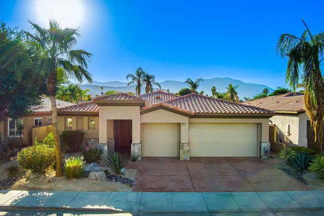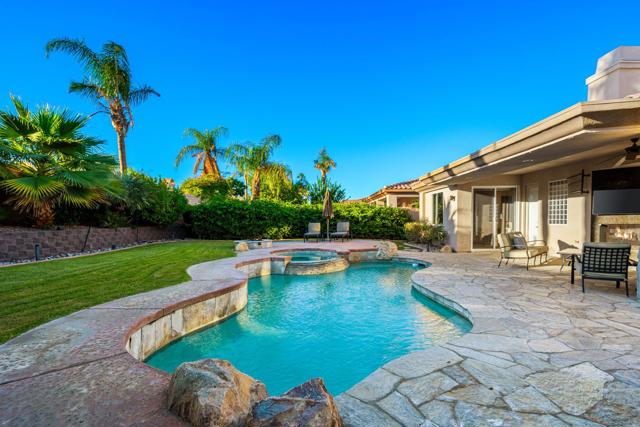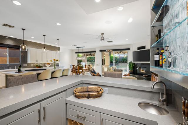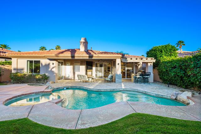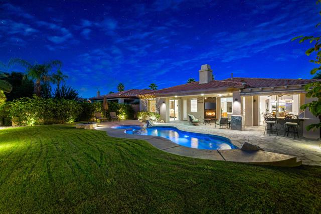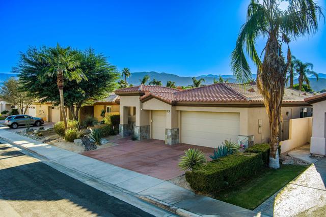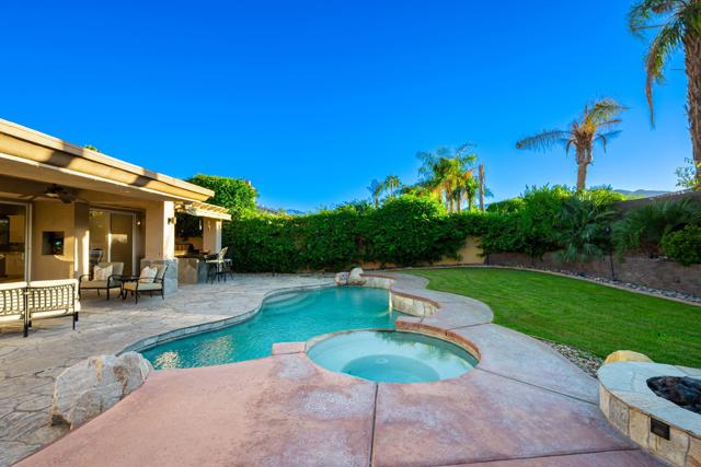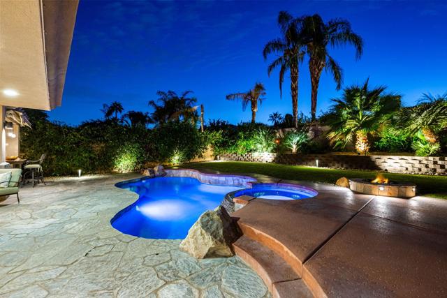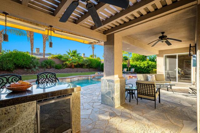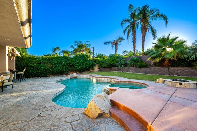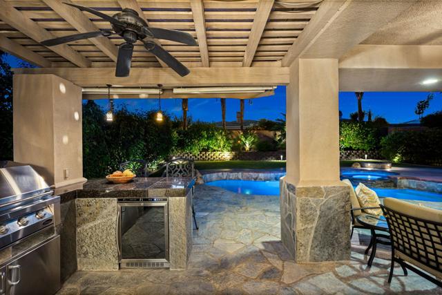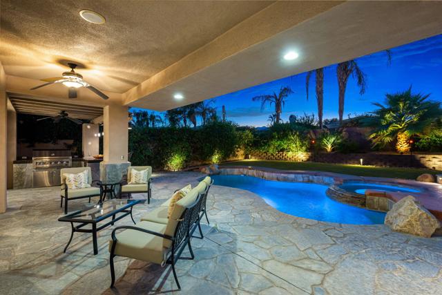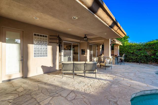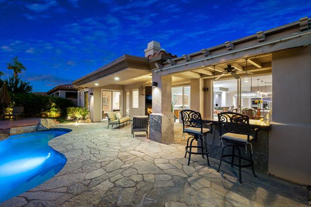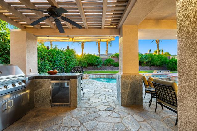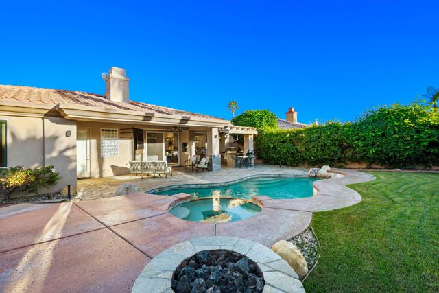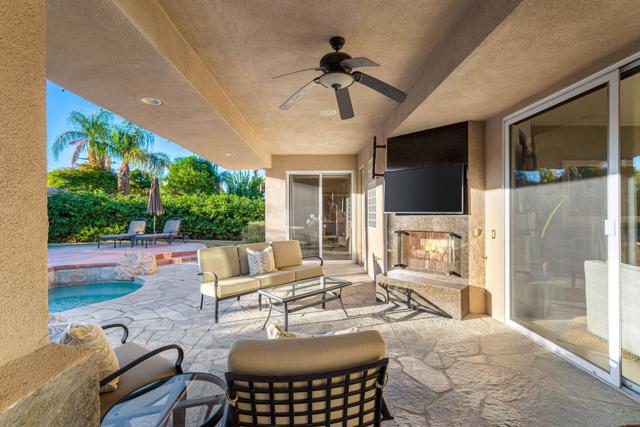 Welcome to your perfect Palm Desert retreat! Ideally situated in a prime central location, this stunning residence offers the best of desert living--just minutes from top-rated restaurants, grocery stores, shopping, and entertainment. Step inside and you'll immediately notice the open, inviting floor plan designed for both relaxation and entertaining. The home features three spacious bedrooms, each with its own en suite bathroom, providing comfort and privacy for family and guests alike. There's also a versatile den equipped with a murphy bed, making it the perfect flex space for a home office, media room, or an additional guest room.The newly remodeled kitchen is the heart of the home, complete with sleek quartz countertops, brand-new appliances, and a modern bar area ideal for hosting gatherings or enjoying a quiet morning coffee. The seamless flow from the kitchen and great room to the outdoor living area creates a true indoor-outdoor lifestyle that's synonymous with the desert experience.Step outside and be captivated by a backyard designed for entertaining and relaxation. The expansive patio features stone columns and flooring and multiple areas to lounge or dine al fresco. Gather around the fire pit, watch your favorite shows on the flat-screen TV, or fire up the built-in barbecue for an evening with friends. The retractable awnings and misting system ensure year-round comfort, while the Pebble Tec pool and spa invite you to unwind in total luxury.Additional highlights include a three-car garage with new garage doors, custom built-ins, and epoxy flooring, offering plenty of space for storage or a home gym. Set within a quiet, family-friendly neighborhood, this home combines thoughtful design, modern upgrades, and a resort-style backyard to deliver the ultimate Palm Desert lifestyle. Whether you're looking for a full-time residence, vacation getaway, or investment opportunity, this property truly has it all.**Original plans reflect approximately 3,085 sq. ft. During construction, the owner added an additional 6 feet to the primary bedroom. Buyer to verify all square footage and satisfy themselves with regard to accuracy.**