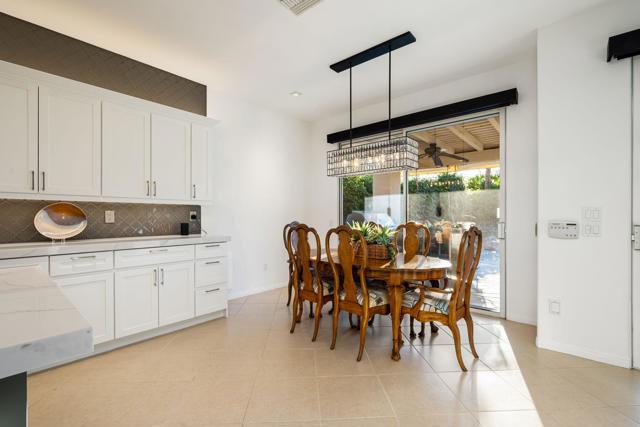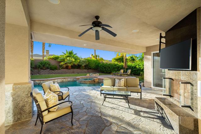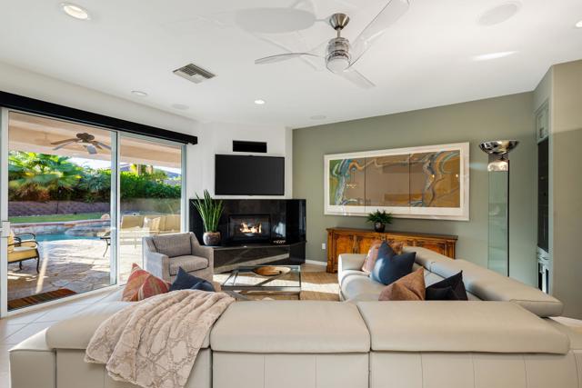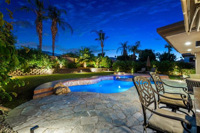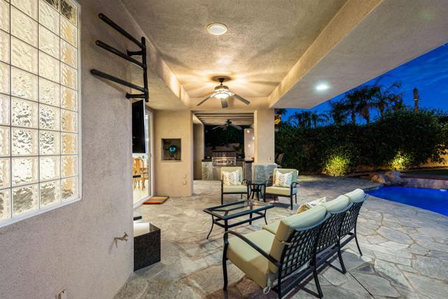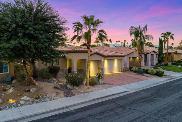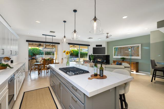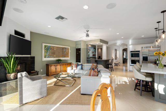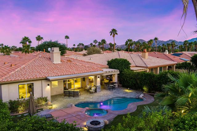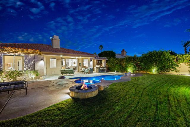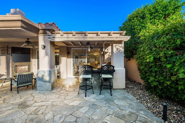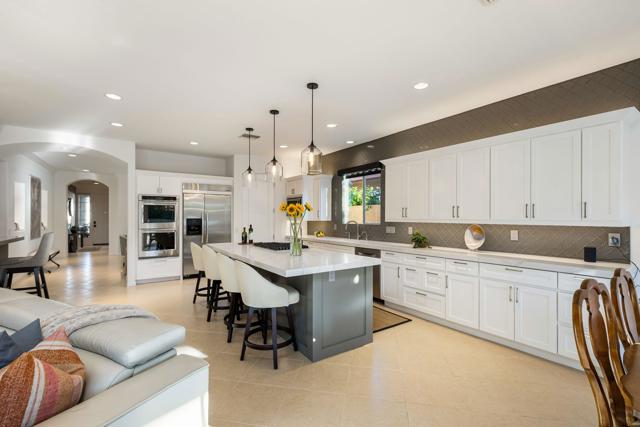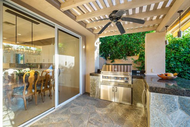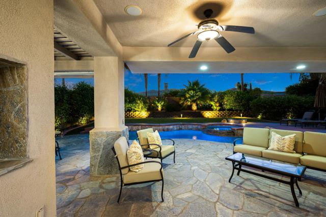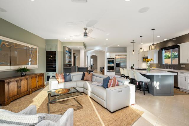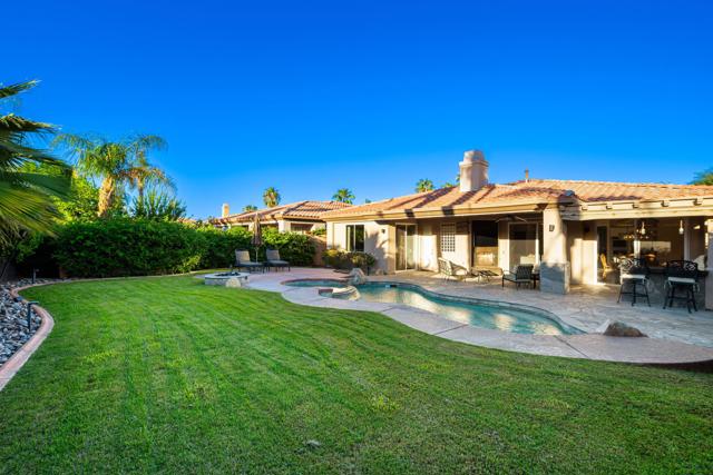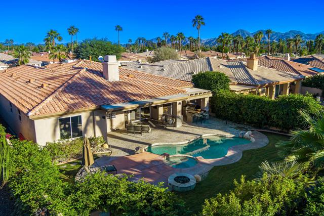 Welcome to your perfect Palm Desert retreat! Ideally situated in a prime central location, this stunning residence offers the best of desert living--just minutes from top-rated restaurants, grocery stores, shopping, and entertainment. Step inside and you'll immediately notice the open, inviting floor plan designed for both relaxation and entertaining. The home features three spacious bedrooms, each with its own en suite bathroom, providing comfort and privacy for family and guests alike. There's also a versatile den equipped with a murphy bed, making it the perfect flex space for a home office, media room, or an additional guest room.The newly remodeled kitchen is the heart of the home, complete with sleek quartz countertops, brand-new appliances, and a modern bar area ideal for hosting gatherings or enjoying a quiet morning coffee. The seamless flow from the kitchen and great room to the outdoor living area creates a true indoor-outdoor lifestyle that's synonymous with the desert experience.Step outside and be captivated by a backyard designed for entertaining and relaxation. The expansive patio features stone columns and flooring and multiple areas to lounge or dine al fresco. Gather around the fire pit, watch your favorite shows on the flat-screen TV, or fire up the built-in barbecue for an evening with friends. The retractable awnings and misting system ensure year-round comfort, while the Pebble Tec pool and spa invite you to unwind in total luxury.Additional highlights include a three-car garage with new garage doors, custom built-ins, and epoxy flooring, offering plenty of space for storage or a home gym. Set within a quiet, family-friendly neighborhood, this home combines thoughtful design, modern upgrades, and a resort-style backyard to deliver the ultimate Palm Desert lifestyle. Whether you're looking for a full-time residence, vacation getaway, or investment opportunity, this property truly has it all.**Original plans reflect approximately 3,085 sq. ft. During construction, the owner added an additional 6 feet to the primary bedroom. Buyer to verify all square footage and satisfy themselves with regard to accuracy.**