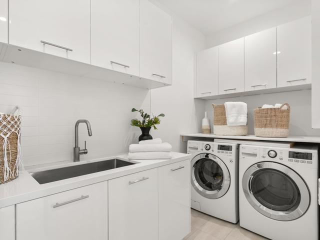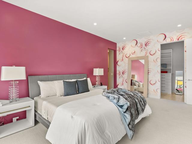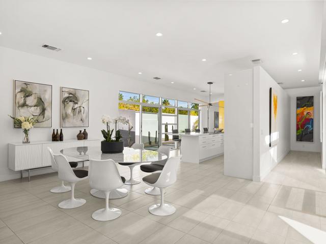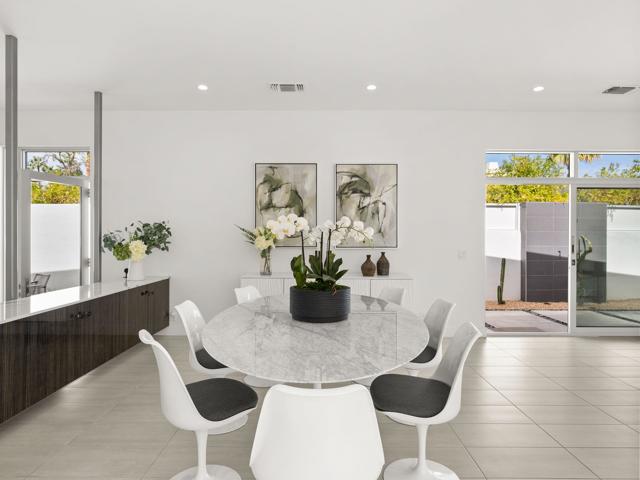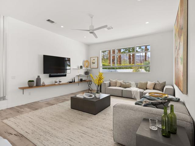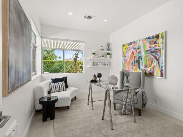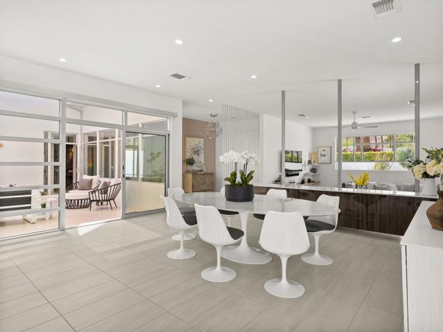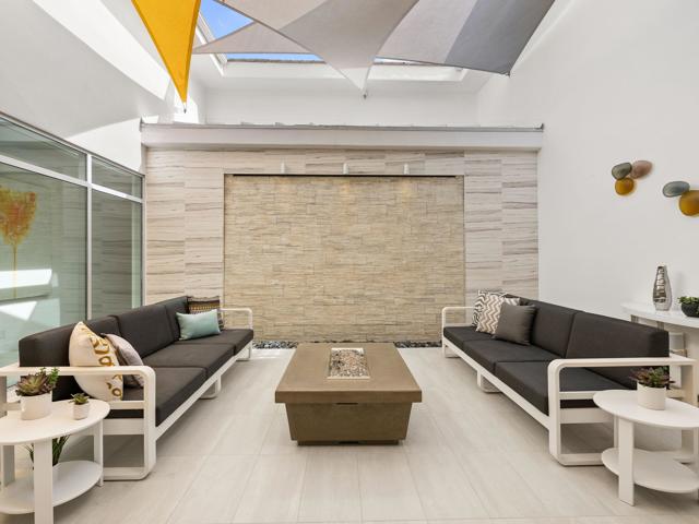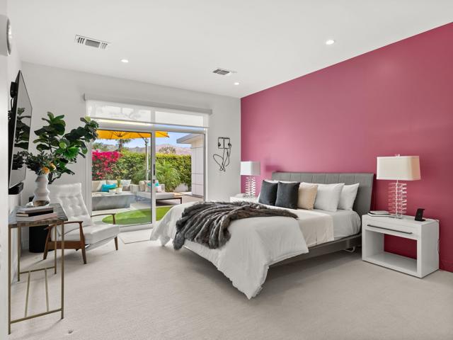 Reimagined both inside and outside by the talented owner-designer, this residence has been transformed into a modern masterpiece. Commercial-grade windows and sliders, arranged in a Mondrian-inspired composition of varying glass sizes and shapes, enhance the home's sleek lines, natural light, and dynamic color contrasts. This to-the-studs renovation includes a 38-panel solar system with three Tesla Powerwall batteries, a massive atrium with a lighted wall fountain and firepit, and two primary suites. The main suite features dual spa-like bathrooms, two custom walk-in closets, in-room laundry, and direct access to the backyard and gym. The secondary primary suite offers luxe carpeting, a designer ensuite bath, and a private patio. The striking ultra-modern kitchen boasts an expansive island, high-end appliances, and custom cabinetry with quartz countertops. Outdoor enhancements include a motorized pergola with recessed heat lamps and a detached structure that is currently used as a private gym. A spacious guest suite ensures comfort for visitors and also has a stunning en-suite bathroom. With panoramic mountain views to the east and west, the home is ideally located near the renowned El Paseo Shopping District, Historic Highway 111, and prestigious golf clubs, blending high-end functionality with modern sophistication. Furnishings negotiable outside escrow.