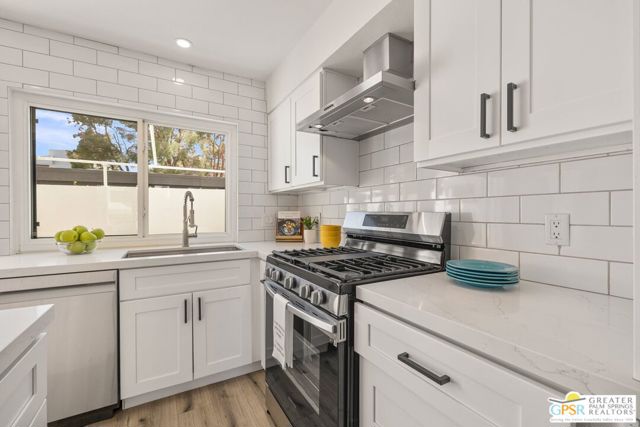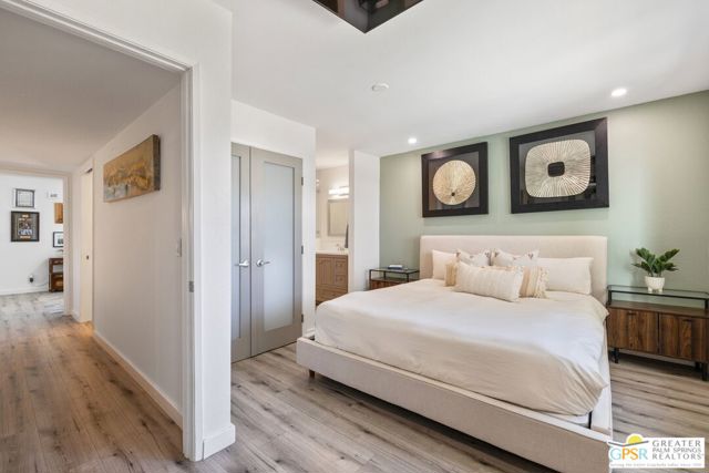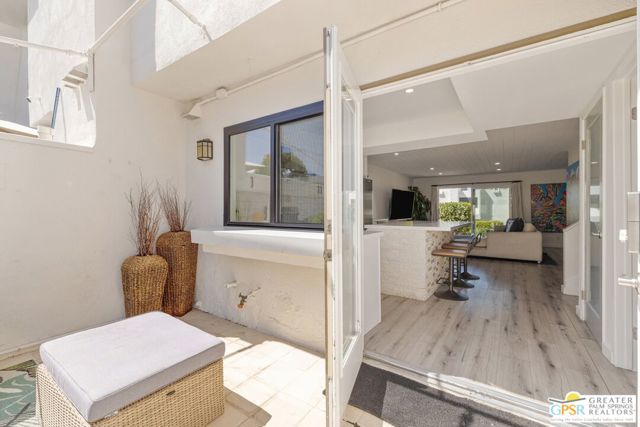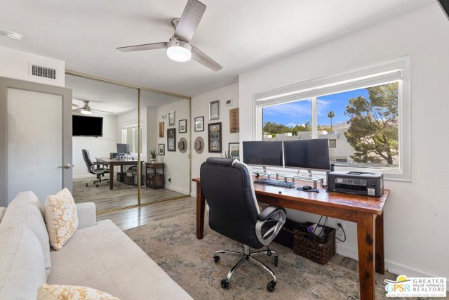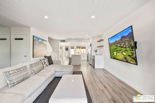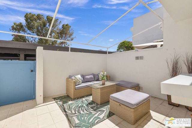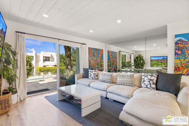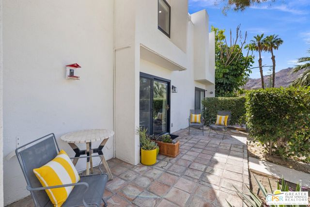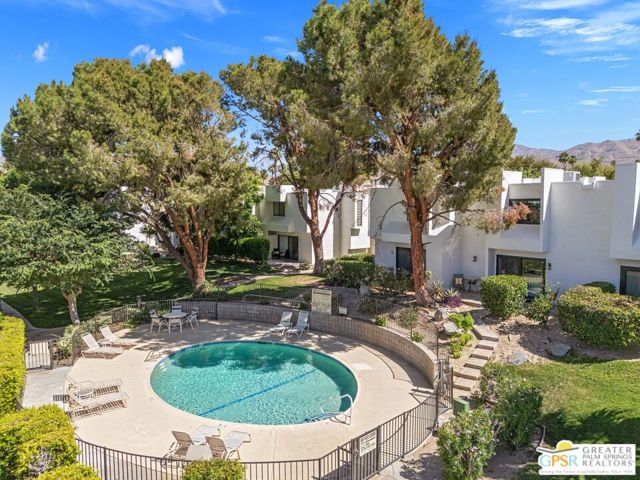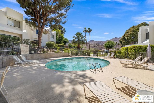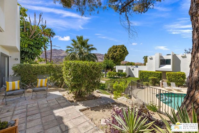Perfectly Positioned, Updated, and Move-In Ready! This light-filled two-story townhome offers modern style, effortless indoor-outdoor living, and stunning mountain and pool views. Perched just right above the pool, it strikes the ideal balance of privacy and connection with a private path to the pool! The open-concept main level showcases a reimagined kitchen with an oversized island, designer finishes, and seamless flow into the living and dining areas. A gated front courtyard with a fun pass-through to the kitchen adds charm and functionality. Also on the main level are a powder bath and large under-stair storage closet. Upstairs, the updated primary suite features a modern bath and a ceiling-mounted TV that retracts when not in use. A newer laundry area adds convenience to the second level. The guest bedroom, currently used as an office, is located at the opposite end and includes a fully updated bath, offering ideal bedroom separation. Additional highlights include two assigned covered carports, a rare feature in the 120-home Mountainback community. Amenities include tennis, pickleball, pools, + spa. Just minutes from El Paseo's premier shopping and dining, and close to scenic hiking trails. Low HOA fees. Take the Matterport Virtual Tour to experience the layout and lifestyle this special property offers. Welcome to easy, elevated living in South Palm Desert.
