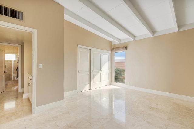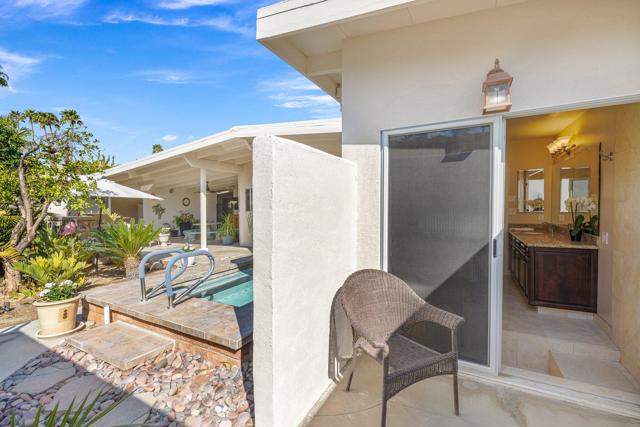 Nestled in south Palm Desert's premier, historic Silver spur neighborhood, this ultra-private mid-century retreat features timeless architecture and character, even boasting a massive casita. Enter through the gated courtyard to the main residence, offering 2 generously sized bedrooms, 2 updated baths, and an open, inviting floor plan. Beautiful wood-beamed ceilings and travertine flooring run throughout, creating warmth and cohesion. The casita mirrors the home's roofline and finishes with a built-in entertainment center, walk-in closet, and updated bath. It's an ideal space for guests, extended family, or a private work studio. Designed for effortless indoor-outdoor living, the lush backyard features a large covered patio for entertaining, a built-in barbeque, and a relaxing spa. Chase the sun, soak in dramatic mountain views, and enjoy the quiet serenity that defines this neighborhood. Lovingly maintained and truly move-in ready, this home sits just five doors from Ironwood Park, walking distance to The Living Desert, and moments from El Paseo's world-class dining, shopping, and galleries.