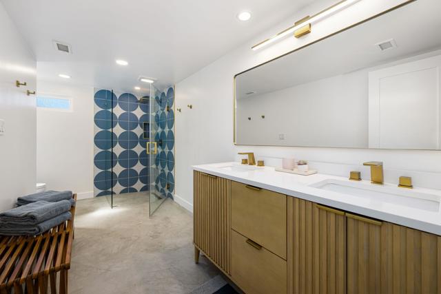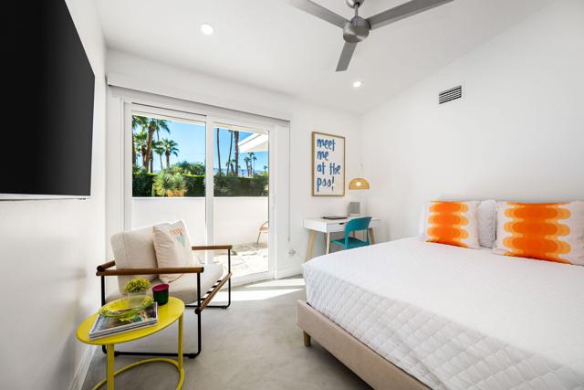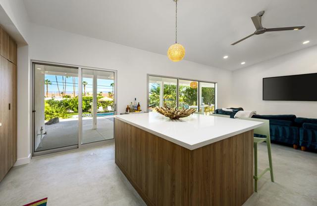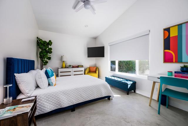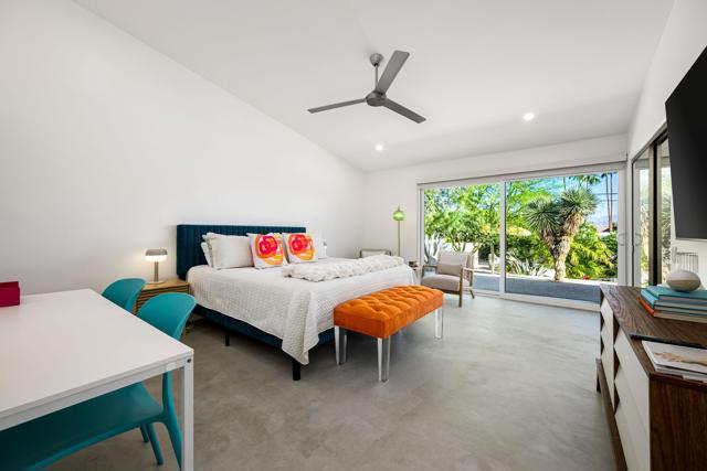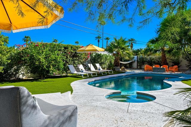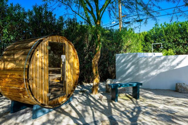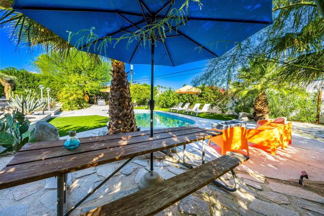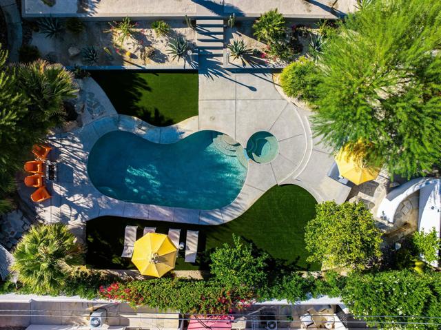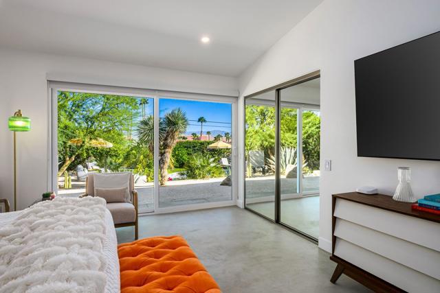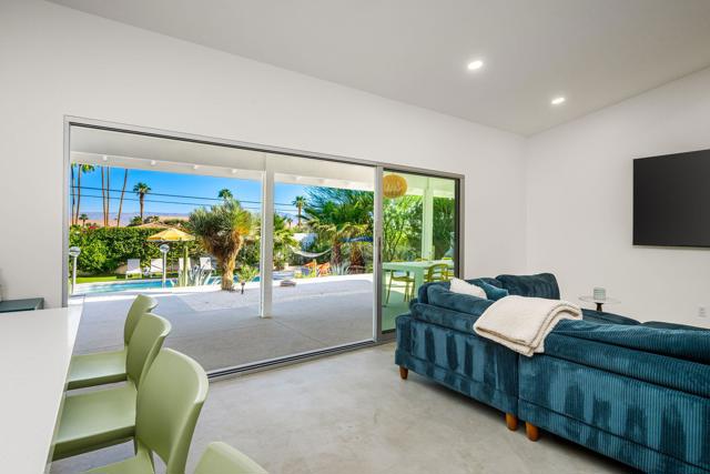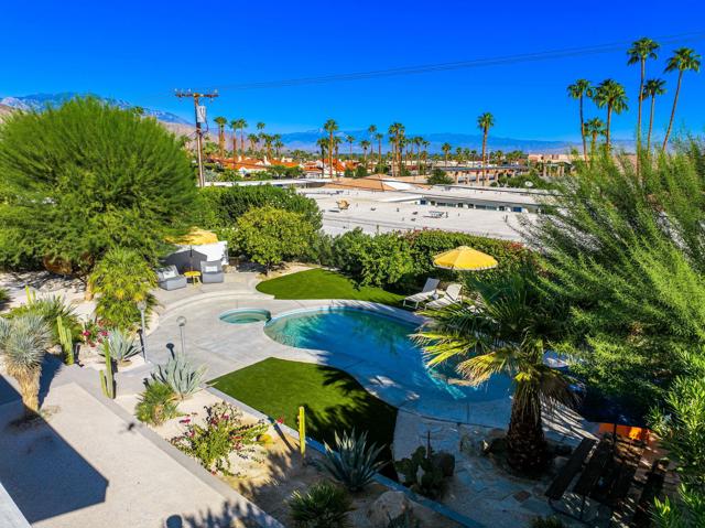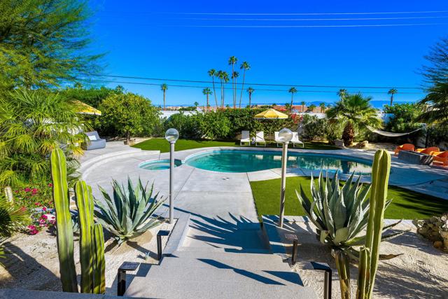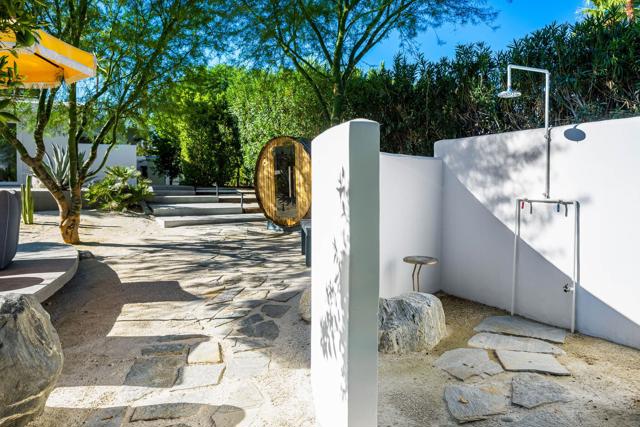 73520 Joshua Tree Street is a fully remodeled mid-century residence in South Palm Desert, nestled in a quiet, secluded neighborhood with sweeping mountain views and just blocks from El Paseo's premier dining, shopping, and cultural attractions. The home seamlessly combines modern finishes with carefully restored vintage details, preserving its architectural integrity while offering contemporary comforts for sophisticated desert living. Inside, polished concrete floors flow throughout the open-plan living, dining, and kitchen areas, which are anchored by a large kitchen island with eat-up seating, perfect for entertaining or casual gatherings. A dramatic wall of glass opens these spaces to a raised backyard terrace, creating a seamless connection between indoors and outdoors and framing scenic mountain vistas. Thoughtful spatial planning enhances both flow and privacy, ensuring that each area of the home feels purposeful and inviting. The primary suite and den occupy one wing of the home, while two guest bedrooms are positioned on the opposite side, providing separation and privacy. Multiple rooms open to patios or terraces, reinforcing the home's bungalow-like ease and celebrating the hallmark indoor-outdoor lifestyle of Palm Desert living. The tiered backyard is designed as a private retreat and entertainer's playground. A pool and spa are complemented by 2 outdoor showers, a fire pit, outdoor sauna, and expansive terrace spaces for lounging or dining al fresco, all surrounded by mature, low-maintenance landscaping. Additional highlights include a fully finished two-car garage with epoxy floors, restored original front doors with bronze hardware, owned solar, and a cohesive blend of modern and vintage design elements that convey a refined sense of style. Blending timeless mid-century character with contemporary sophistication, this residence offers elevated design, thoughtful indoor-outdoor integration, and easy access to El Paseo's lifestyle amenities, making it an exceptional opportunity for those seeking refined desert living in a serene South Palm Desert setting.