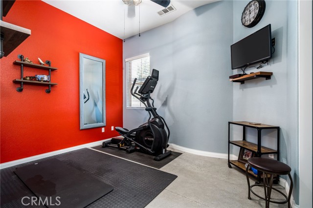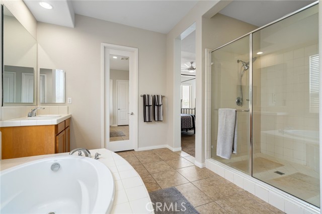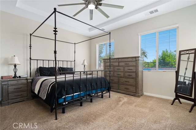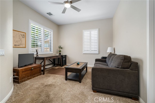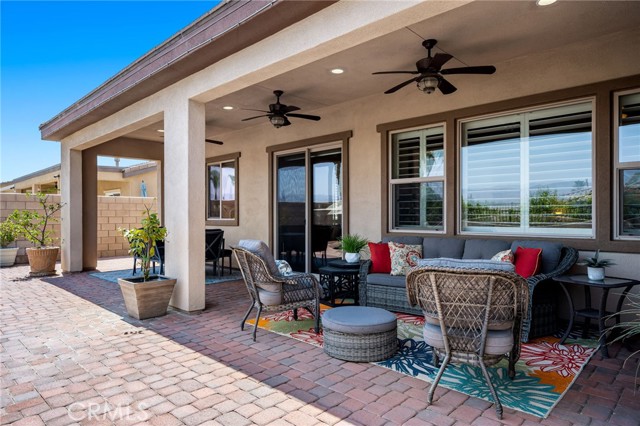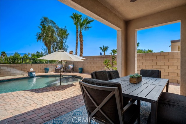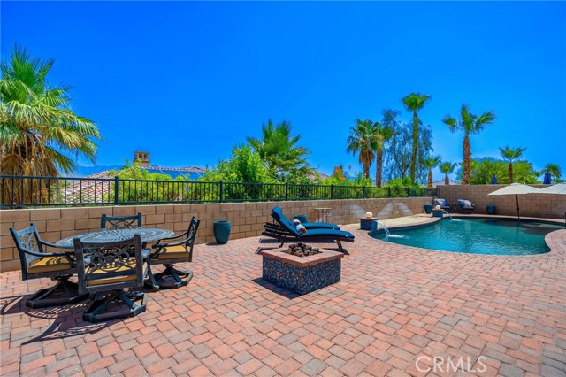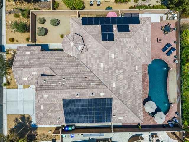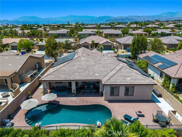 Located in the desirable community of The Gallery in Palm Desert, this 4 bedroom, 3.5 bath home offers 2,596 sq. ft. of stylish living space. A gated courtyard entry leads to an elegant rotunda, high windows, and 12 ft. tray ceilings that fill the home with light. The formal dining room is perfect for entertaining, while the kitchen boasts black granite counters, double ovens, and a Sub-Zero built-in refrigerator. The fourth bedroom is currently used as an office with a walk-in closet for added storage. The home is powered by 40 solar panels and a Tesla back up battery that are paid off. Enjoy resort-style outdoor living with a covered patio featuring recessed lighting and a mist system, plus a Pebble Tec pool with tanning shelf. The private backyard offers low-maintenance landscaping and stunning mountain views. Two attached garages accommodate three cars. This home blends elegance, comfort, and function in one of Palm Desert’s most sought-after neighborhoods.