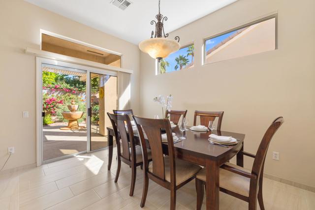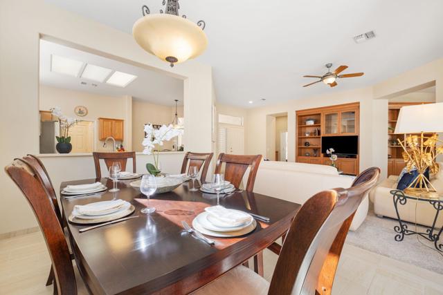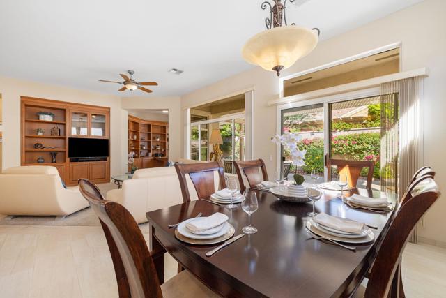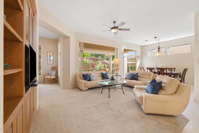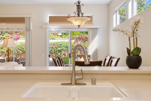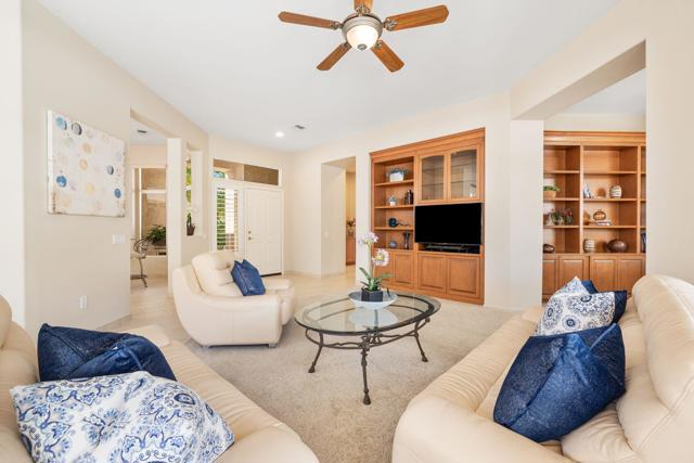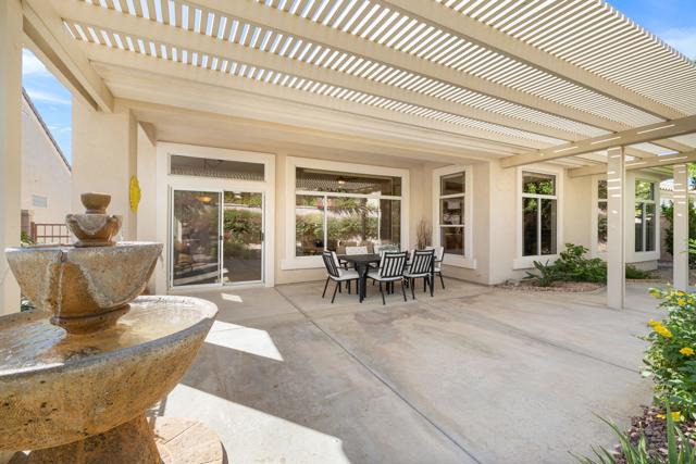 Sun City Palm Desert 55+ community.This Morocco is one of the most popular models, with high ceilings and transom windows, letting in plenty of light. The large entry courtyard is perfect for a sitting area that enjoys southern warmth in the winter. It has 2 bedrooms, 2 bathrooms, a den/office with a built-in office desk, and lots of natural light. Upgraded 12X24 tile was added in the main living areas and carpet in the bedrooms. The living room has a custom entertainment center and huge windows. The kitchen has newer stainless appliances, a kitchenette, and a center island. The laundry room has a utility closet, and the washer and dryer are included. The master bedroom has a bay window with a nice view of the beautiful private north-facing backyard. An extended 'Alumawood' cover makes it feel like another living space outdoors. The master bathroom has a custom walk-in tile shower, a private toilet room, a large walk-in closet, and a dual vanity. The guest bedroom is adjacent to the 2nd full bathroom and is very inviting. It has a 2-car garage and is extended with a golf cart nook. Lenox A/C was replaced in 2014. This is a must-see home, so don't miss it. SUN CITY PALM DESERT IS ALL ABOUT LIFESTYLE!! It has many clubs, activities, amenities, and low HOA dues. Play at 2 championship 18-hole golf courses and practice facilities, pickle ball, tennis, softball, bocci ball, an 18-hole miniature golf course, an honor library, arts and crafts, a ballroom for special entertainment, and 4 saltwater pools kept at 87 degrees with hot tubs. Enjoy 2 great restaurants, a martini/coffee bar, and even a post office. There is a newly renovated classy indoor/outdoor bar with fire tables to enjoy the awesome views and our beautiful desert weather..