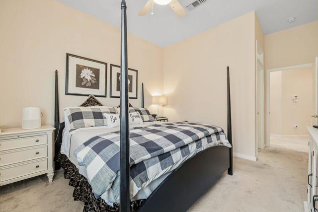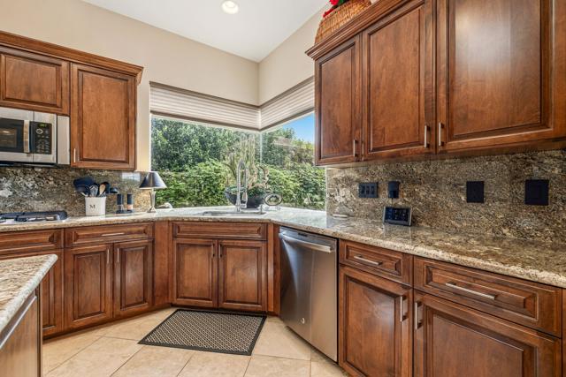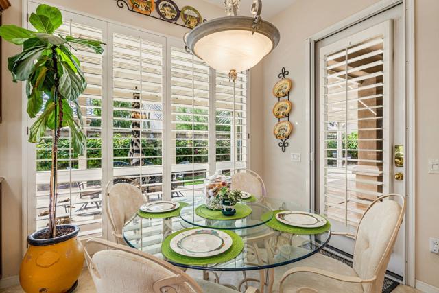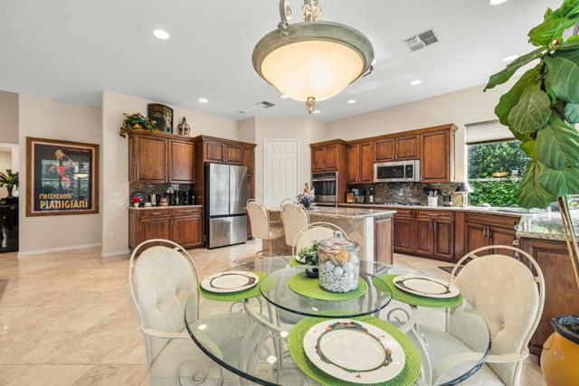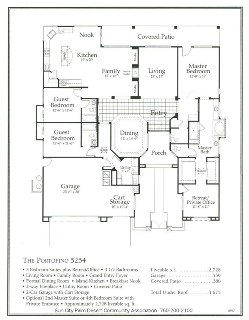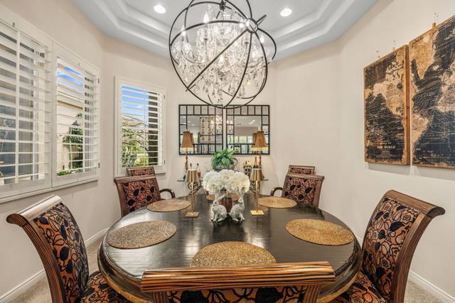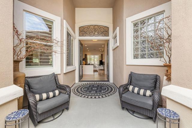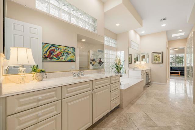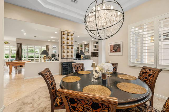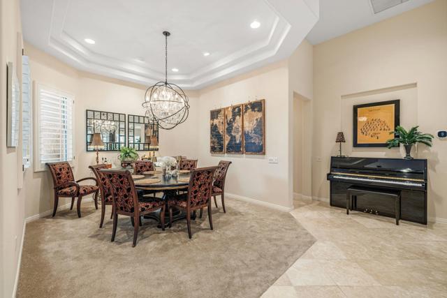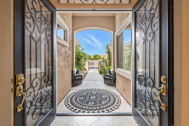 Del Webb Sun City Palm Desert. Gorgeous GREAT ROOM Portofino. This highly sought-after Estate model home is located in the heart of the community between the Sunset View and Lake View clubhouses. Nice curb appeal with gated courtyard and fabulous wrought iron and glass double entry doors. Inside, diagonally laid Travertine tile, plantation shutters throughout, 12-foot ceilings in the foyer and living room for a dramatic open concept. The beautiful kitchen was tastefully upgraded with slab granite, beautifully stained, raised panel cabinets and pull-out shelving, upgraded hardware, stainless appliances, a chefs island with breakfast bar, a walk-in pantry, classic mitered windows and power shades, a skylight, and recessed lighting. Living and family rooms are open to the kitchen with gas fireplace, marble tile surround, custom cabinets and shelving, and keep the pool table if you like. The formal dining room has a gorgeous tray ceiling. The luxurious master suite has an access door to the patio, and plantation shutters. The bath is extended with a private retreat room, which makes a perfect office/hobby room. It has double vanities, a large stall shower with glass block, a soaking tub, a skylight, and two walk-in closets. On the opposite side of the home, there are two guest suites for maximum privacy. The powder bath has a pedestal sink. Laundry room has a washer and dryer, cabinets, and a utility sink. The extended 2-car plus golf cart garage has storage cabinets, a fridge, a newer hot water tank, 1 NEW A/C in 2025 with a heat pump, and a replaced condenser on the 2nd one. The gorgeous private, south-facing, spacious rear patio is extended with a full-length 'Alumawood' cover, custom concrete overlay and lovely landscaping, and a built-in BBQ kitchen, perfect for relaxing or entertaining!