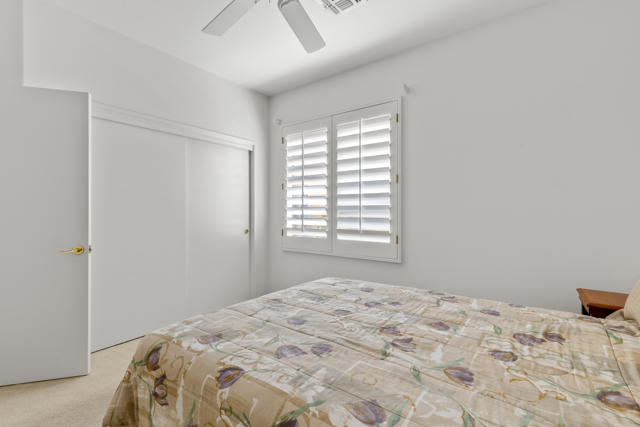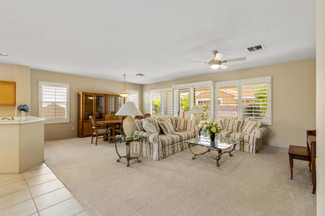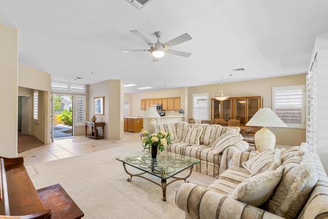 ST CROIX floor plan with hobby room & golf cart garage , new A/C.2 bedrooms + den with built in shelves, all in lovely condition. 2 bathrooms. Large eat in kitchen with stainless steel appliances. Wonderful plantation shutters throughout. Nice size and easy to maintain north facing back yard great for entertaining. Best of desert living with pools, golf, tennis, pickle ball, fitness centers, restaurants, and endless social clubs and acitvities!