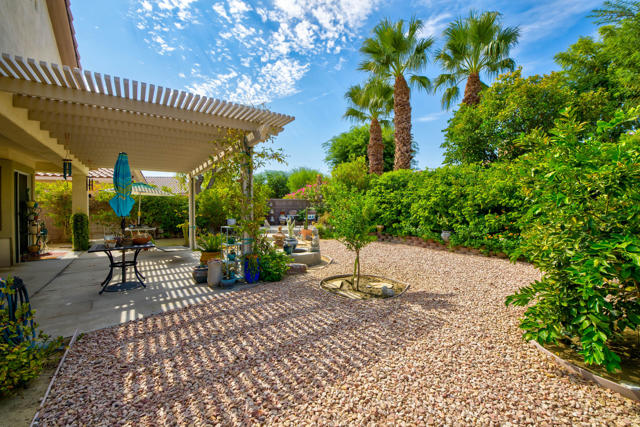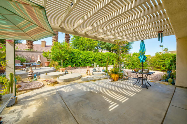 Sun City Palm Desert ''Cayman'' Model 2/2+ Den with pocket doors can be an optional 3rd bedroom. Located in the new section near Lakeview Clubhouse. Custom courtyard wall with security gate gives this unique home great curb appeal! Wide hallways open to the Great Room floor plan with 9' and 10' ceilings. Custom wallpaper & paint, smooth finish Plantation Shutters, 16'' tile floors, carpet in bedrooms, and ceiling fans are through-out. New HVAC 2024, water heater and disposal. Island Kitchen with granite tile countertops, stainless appliances and new LED canned lighting. Primary suite with a french door that opens to the rear patio, bath has a seated vanity, step-in shower and walk-in closet. Guest bedroom & bath with shower/tub combo. The South facing backyard has an extended aluma-wood covered patio, fruit trees and custom concrete hardscape in the front & back. Indoor laundry with newer front load washer/dryer and a 2 car garage.