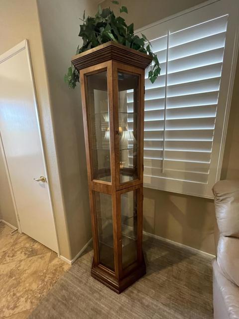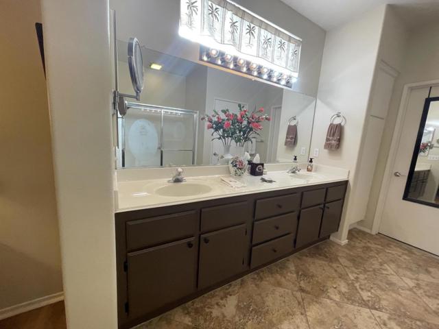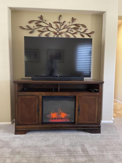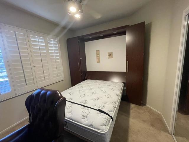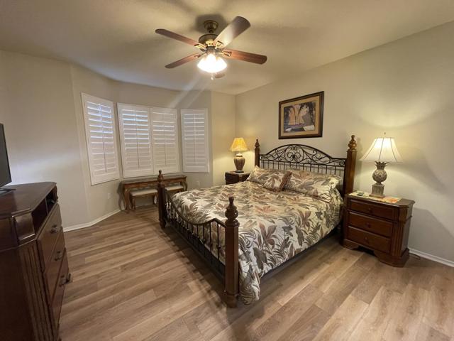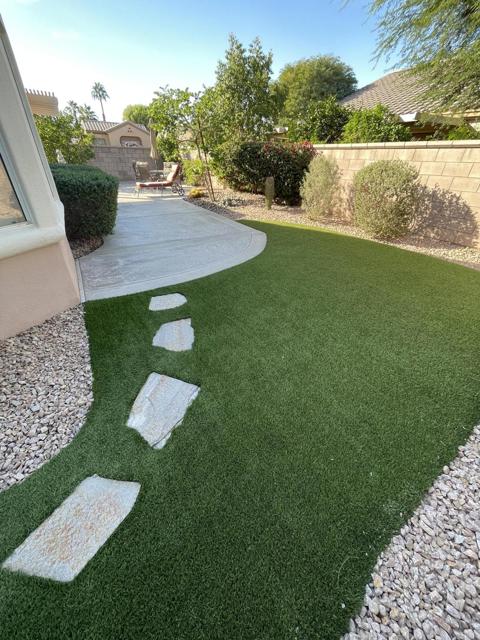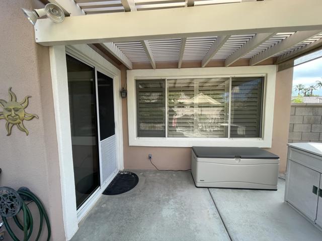 Fabulous Sun City Palm Desert: Outstanding Barbados two-bedroom, two-bath. Turnkey Furnished plus Golf Cart. Highly Upgraded: Custom interior paint, lead glass front door, faux electric fireplace/ Large TV in Living Room, new carpet in living room Table with Six chairs in Dining Area. Stainless Appliances, Granite Kitchen Counters, Electric King Bed in Primary, Murphy Bed and desk with Chair in Guest Bedroom, Plantation Shutters, Bay Window in Primary, Tree Palm trees in front yard, dog friendly artificial turf in rear yard and close to dog park, Alumawood Patio cover, water fountain, furnished patio, citrus trees and a Hong Kong Orchid in rear yard, paved walkway from driveway to rear yard. Large 2- Car Garage. Move-in ready. On a friendly street, must see.