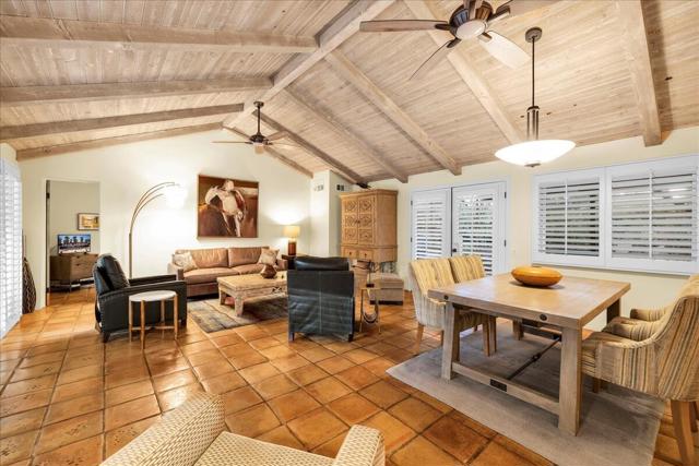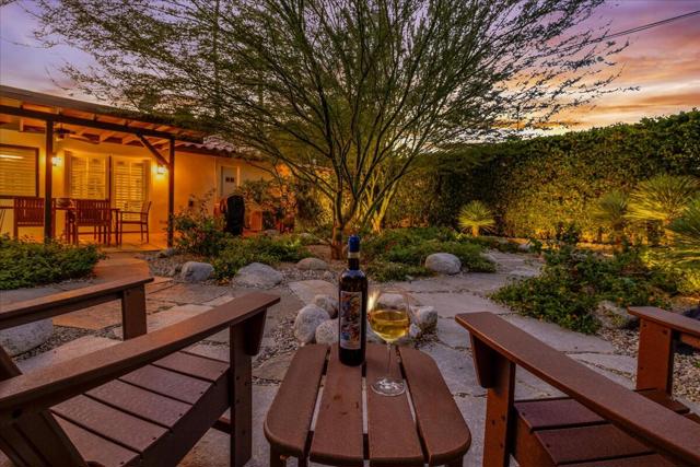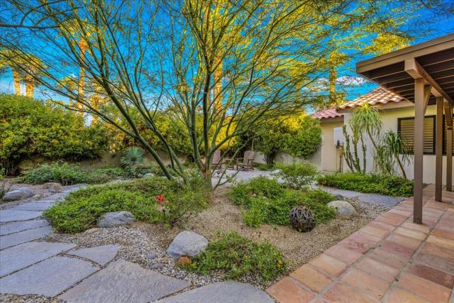 Welcome to Casa Lantanas in highly desirable Movie Colony East, one of Palm Springs' most iconic neighborhoods where history, style, and desert living combine together in perfect harmony. Discover the perfect blend of vintage charm and modern comfort at this timeless Palm Springs Spanish Retreat. The charm begins at the covered front porch and continues as you pass through the custom iron front entry door. Featuring 4 Bedrooms (one currently used as an office has its own en-suite bathroom), a master bedroom with en-suite, and two additional guest rooms. Custom closet organization systems in the primary bedroom and two of the guest rooms. All Showers are beautifully tiled with custom glass doors/surrounds and the master bath has dual vanities. Granite counters, Viking appliances and a wine fridge complete the amazing kitchen. Inside laundry room with ample storage. Custom shutters throughout and interior and exterior were painted in 2020. The large Great room features tongue and groove ceiling and open beams with French doors leading to two distinct outdoor spaces. Each side has a large covered patio and distinct entertaining space offering endless opportunities to entertain or unwind. One side includes Mountain Views and the sparkling Salt water pool and Spa with new pebble tech and all new equipment. Recently upgraded with new Cool Decking with diamond grind surface. Heated pool and spa with additional roof mounted solar pool heater providing eco-friendly year-round enjoyment. The other side includes a treed garden and illuminating fire pit . A large side yard with desert plants, meandering flagstone walkway and drought tolerant landscaping with automated irrigation make for easy maintenance. The property is walled for privacy and includes a 1 car garage with built in storage cabinets and Granitex epoxy flooring surface. A new tankless water heater was added in 2024. Dual HVAC and ceiling fans throughout for energy efficient heating and cooling. Whether it's a lively gathering under the desert skies or a quiet morning coffee in your private oasis, this home was designed for the Palm Springs lifestyle. Living in Movie Colony East means being close to it all. You're just minutes from downtown Palm Springs, with world-class dining, boutique shopping, and vibrant nightlife. A short walk to Ruth Hardy Park for tennis, pickleball, or a picnic under the palms--or simply enjoy the peace and quiet of wide streets and a welcoming neighbor