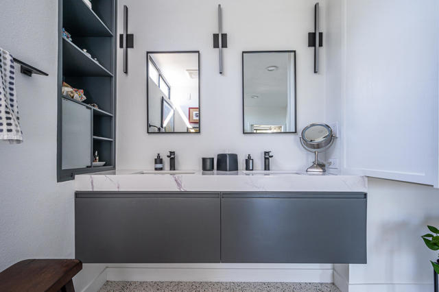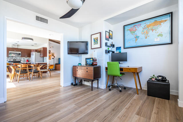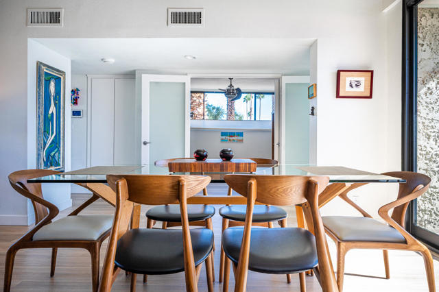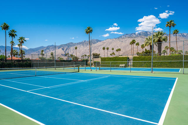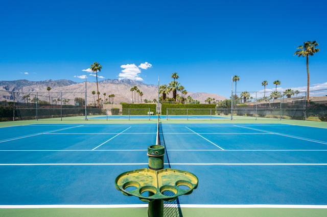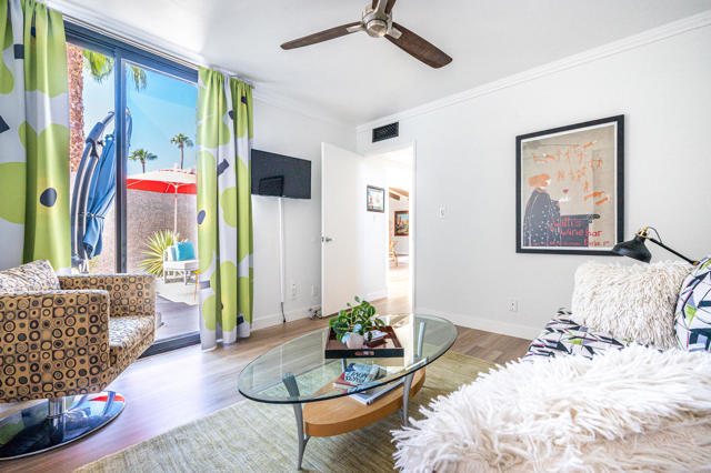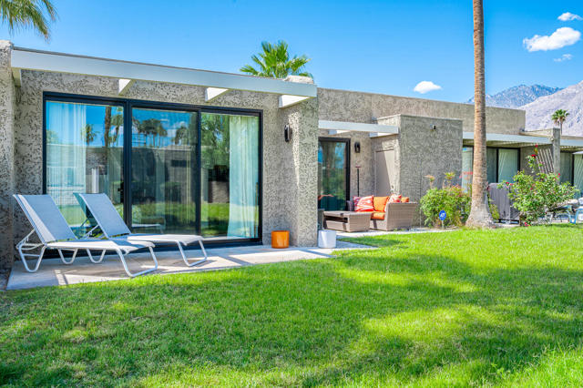 Back on the Market! Gorgeous Central Palm Springs Condo with Newer Windows, HVAC & Roof, and more!Welcome to Sunrise Oasis -- your Palm Springs escape! This beautifully renovated 3-bedroom, 2-bath end-unit condo is ideally located in the heart of central Palm Springs on fee land (you own the land!).Enter through a private gated courtyard with an Alumawood shade awning, modern entry door, and stunning mountain views. Inside, wood-look luxury vinyl flooring complements soaring wood-beamed ceilings in the spacious living and dining areas. The living room's wall of windows opens up to a patio overlooking lush green space, perfect for indoor-outdoor living.The gourmet kitchen features stainless-steel appliances, quartz countertops, recessed lighting, and on-demand hot water. The primary ensuite is a serene retreat with abundant light, generous closets, private patio access, and a recently remodeled spa-inspired bath with a walk-in shower, floating double vanity, and terrazzo tile floors. The hall bath was also recently redone and includes a soaking tub, gorgeous tile, and custom vanity.A flex room with glass French doors can serve as a guest bedroom, office, or den. At the opposite end of the home, the dedicated guest bedroom offers direct patio access for added privacy.Recent upgrades to this home include roof, HVAC system, whole-house water filtration, and upgraded electrical panel. The attached single-car garage includes laundry, with dedicated parking for two additional vehicles just outside.Sunrise Oasis is a low-density community of just 96 homes, featuring three pools, three spas, and tennis/pickleball courts, all surrounded by expansive greenbelts--just minutes from Palm Springs' best dining, shopping, and nightlife!