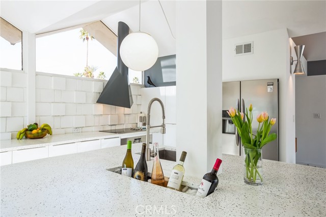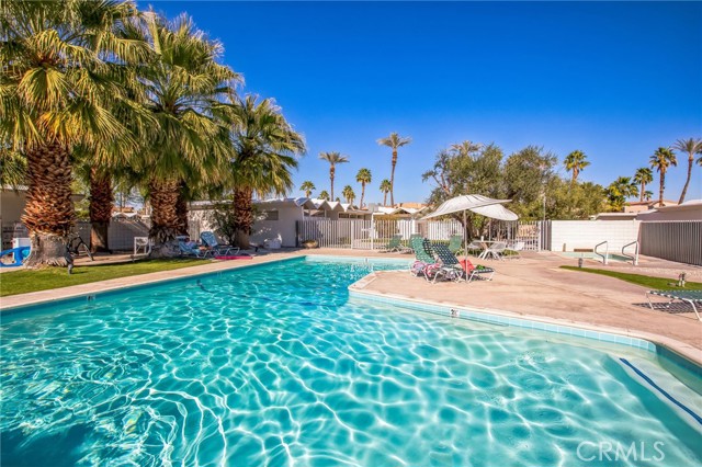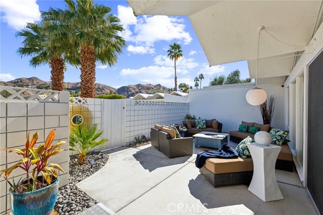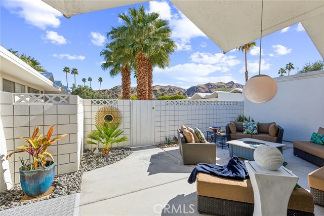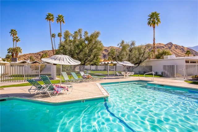 PARK Imperial South, 3.5-acre resort community built in 1961 in the south end of Palm Springs. A Berry Berkus designed mid-century modern community, best known for its unique folded plate rooflines and decorative concrete block design. Granted historical designation owners can apply under the Mills Act for significant property tax reduction. The signature steel hood fan, globe lighting, jalousie windows, terrazzo walkway and sculptural concrete block design, are just a few of the key mid-century design features. The 30-unit community features resort like grounds with mature palm and olive trees, all oriented around a large, gorgeous pool and spa. This unit has unobstructed views of the San Jacinto mountains from the patio and side kitchen window. This unit has a Southwest facing backyard providing natural light throughout the day. Inside this open concept unit, the original terrazzo runway leads from the entry, through the living room to the private walled patio. Floor to ceiling glass connects the social spaces to the large private patio. This unit features a primary bedroom, a 2nd bedroom which opens onto the patio with a mountain view. Open space concept for entertaining and a dining room off the living room that was originally designed as a convertible third bedroom/Den. The unit comes with one carport space directly out your front door. This updated home provides a modern update, building upon the unique mid-century modern design, for you to enjoy a piece of modernist history as well as the best of current mid-century Modern day Palm Springs. Unit is TURNKEY!