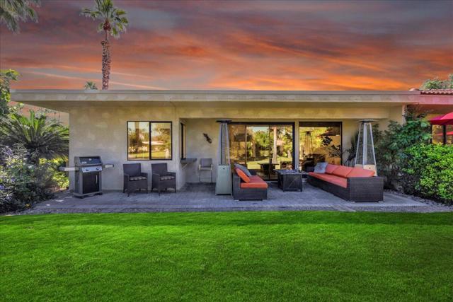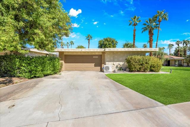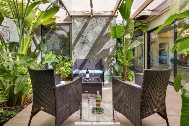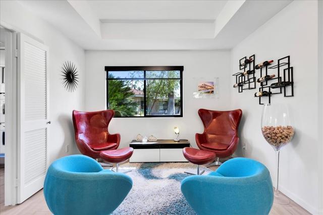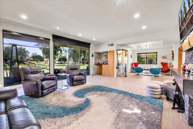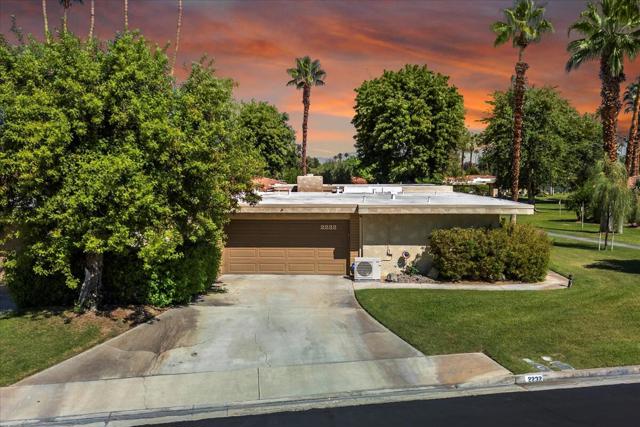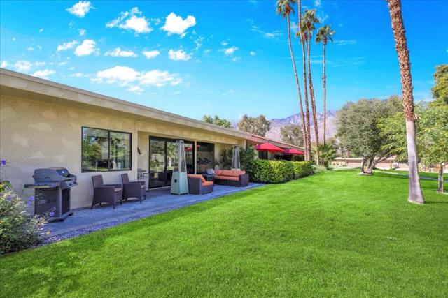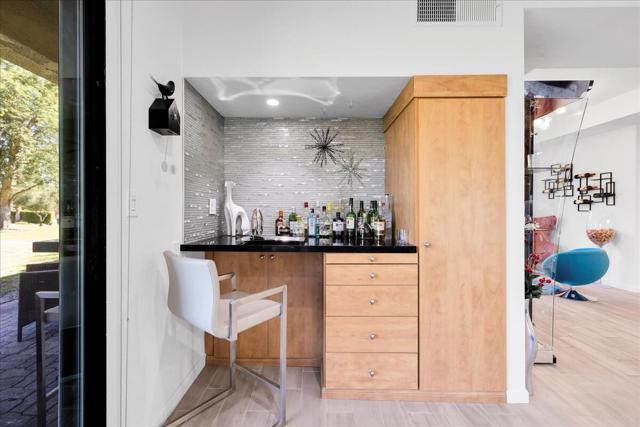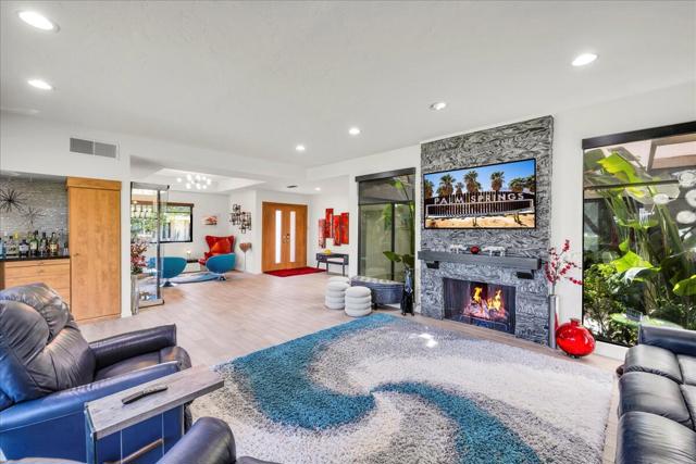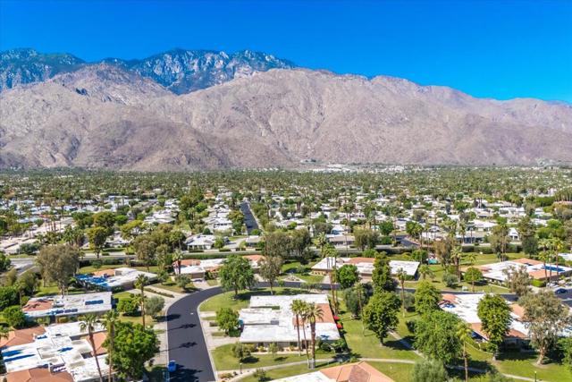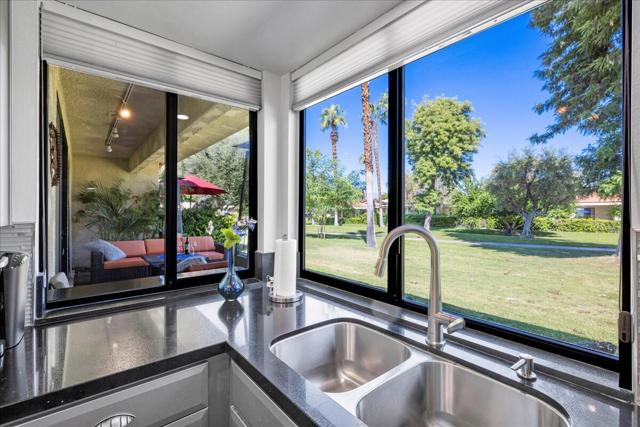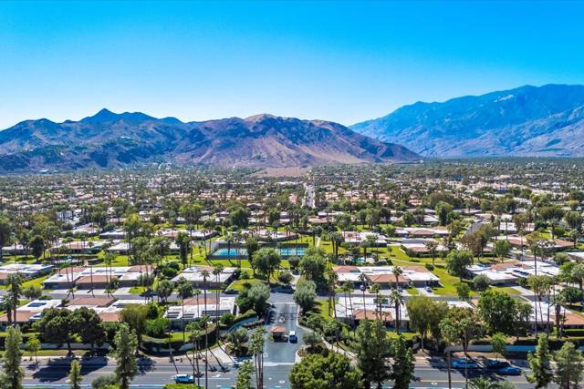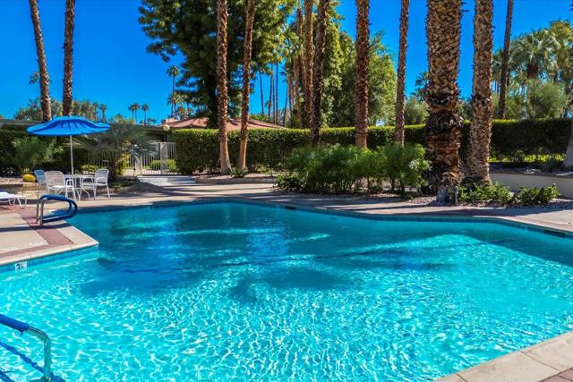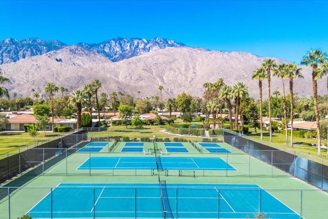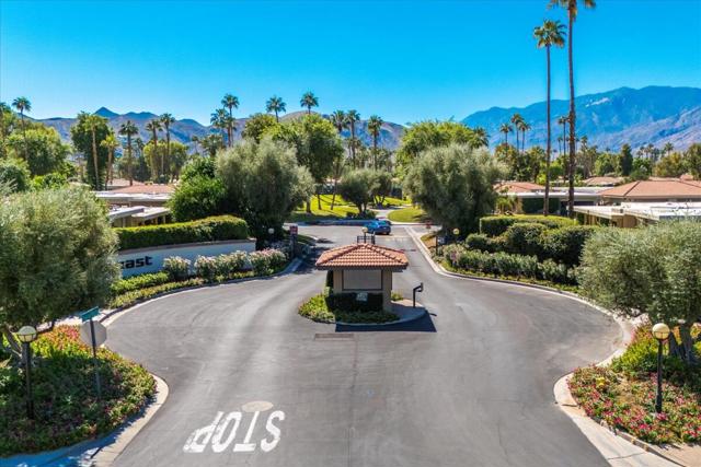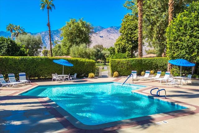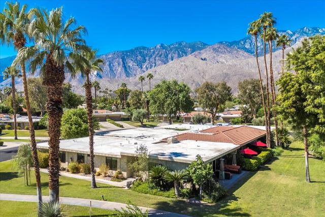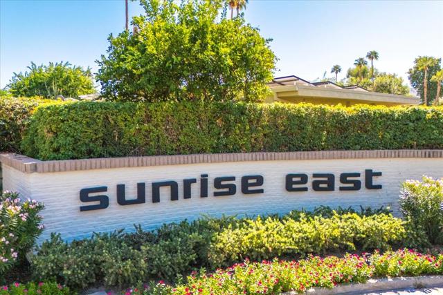A true oasis in the desert! Back in the days when Bing Crosby & Frank Sinatra were in the area, rumored to be hanging out at the Purple Room just up the street... Sunrise East was created as 130 modern styled homes on a sprawling 44 acres, with six pools and spas for relaxing your way! Yes, six rather private pool & spa enclosures, or for the more active types, check out the grand tennis courts (now with pickle ball too). Sunrise East has worked hard over the years to strike a balance of greenbelts with lush hedges and old-growth trees, while also working to reduce it's water footprint, and the result is simply gorgeous! Come explore the well lit sidewalks & trails within the serene park like settings of this true oasis! Now this 3Br/2Ba is an end unit condo on an elevated lot within the center, southwest quadrant, quiet yet in the center of it all. This home embodies the floor-to-ceiling panes of glass and open floor plan that were the hallmarks of midcentury homes, complete with the tropical plant-lined atrium! Lots of windows to let the sun shine in, bright and open, or of course the custom shades too for when you desire a little privacy. Key features are the large great room with recessed lighting, stone fireplace, and even an entertainment bar ...plus the three large bedrooms, rather large baths, with the third bedroom offering flexibility as an office/den and guest room (murphy bed included). Huge custom closets in each room, and ample storage throughout. The entire home has been remodeled, with grey wood-grain porcelain tile running throughout the home, plus black quartz or multi-colored granite countertops, and unique silver cabinetry too. And of course, all the structural upgrades you would expect, with all dual-pane windows & doors, dual AC systems (mini-splits added for master suite & attached garage), whole-house water filtration system, and a host of other goodies. All new roof installed late 2021. And did we mention that this home is being offered 'partially or turnkey furnished' at no additional cost?! Not required, but you could just bring a change of clothing and a toothbrush, and then just settle right in :). Whether you are relaxing on the back patio with friends, or privately enjoying that screened atrium, you are going to love all of the options you have right here. EASY TO SHOW, COME SEE US TODAY!!