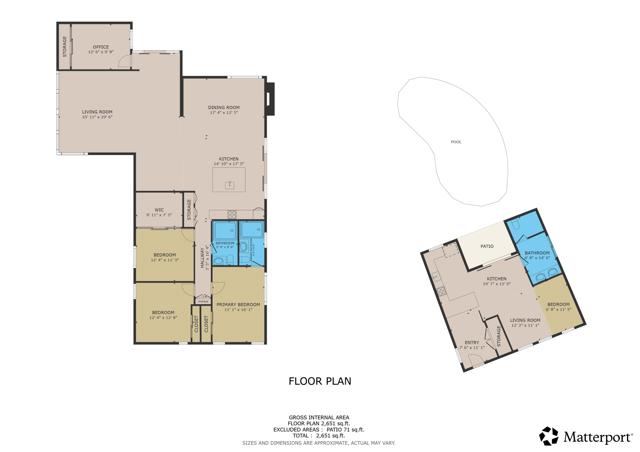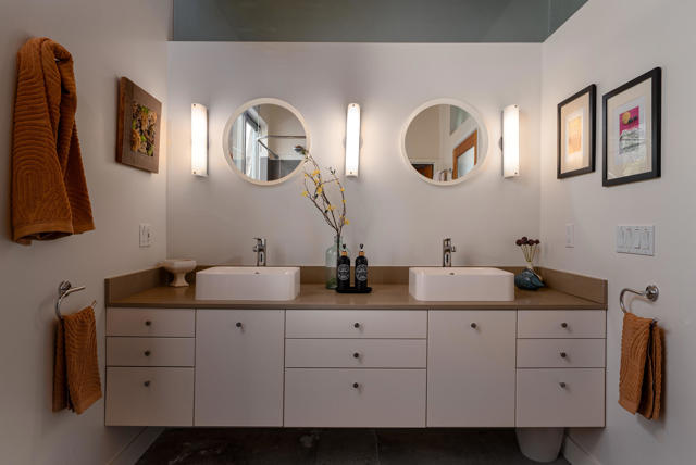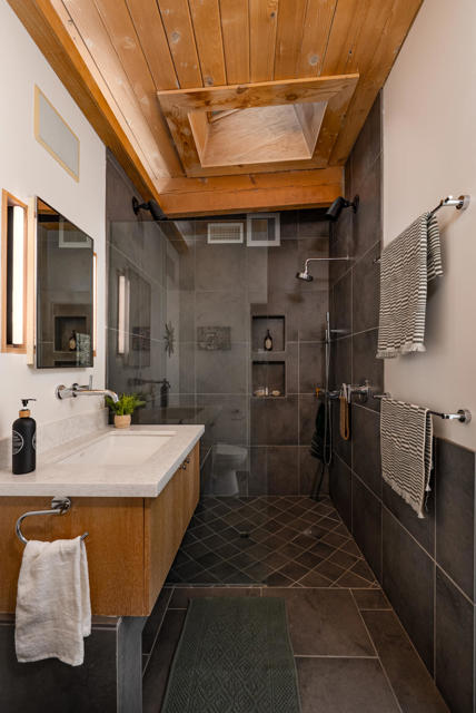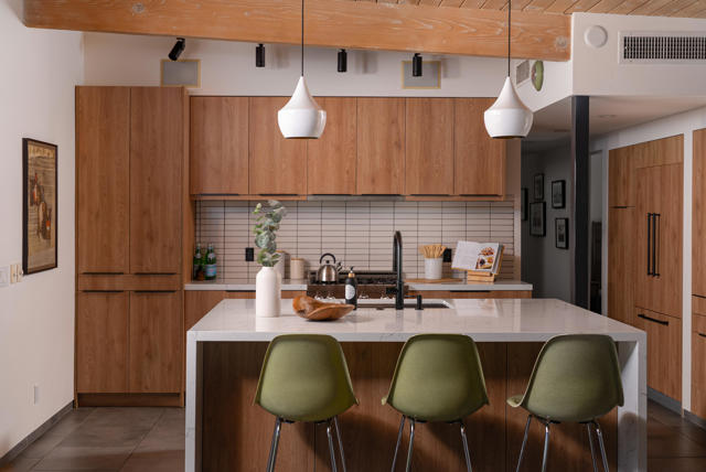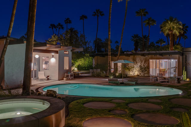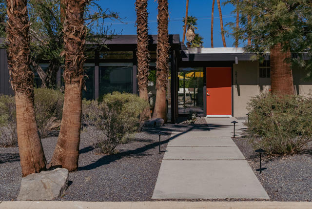 Midcentury architectural gem on an oversized lot with large casita! Located in the sought after midcentury neighborhood of Sunmor, surrounded by highly designed midcentury properties. A very private enclave perfect for walking and biking, but also minutes from downtown. Five bedrooms in total, one serving as the perfect home office, three in the main house, and one in the casita, which also features a full kitchen! Beautifully updated to showcase classic midcentury details -- post and beam construction, floor to ceiling plate glass, warm organic tongue and groove ceilings. Exceptionally large main entertaining space for a house of this style. Lush, mature landscaping, with a recently updated pool and hardscape. Backyard is fully walled and driveway features a motorized gate for privacy. 35 panels (8.575 kW) of fully owned solar. The street presence is iconic, and the pedigree is purely Palm Springs.