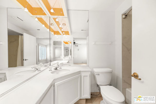Set at the beginning of a quiet culdesac in the gated Canyon Heights community, this 2 bedroom, 2.5 bath townhome sits on fee land. Inside, it's all about volume and light: soaring vaulted ceilings, a sunken living room with a fireplace, plantation shutters and gleaming tile floors. Two primary suites (one on each level) make hosting guests or multigenerational living a breeze - But the showstopper is the approx.1,000 sqft patio, the only one of its kind in the complex. It looks out over mountains and desert skyline and offers direct gated access to the pool/spa, tennis courts and clubhouse. A lava rock fire pit and water feature sets the mood for sunset cocktails or morning yoga. The attached 2-car garage is air-conditioned, so it doubles as a studio or workshop. The very desirable Canyon Heights itself is resort-like: you get four pools, four spas, three tennis courts, four pickleball courts and a clubhouse, all tucked against the San Jacinto Mountains with hiking trails right outside your door - no vehicle needed! Indian Canyon Golf Courses and Smoketree Village are just down the road for a quick round or dinner out. If you're searching for space, privacy and amenities in south Palm Springs on land you own, this condo checks all the boxes. Bring your inner entertainer and a love for desert skies; this home is ready for its next chapter!