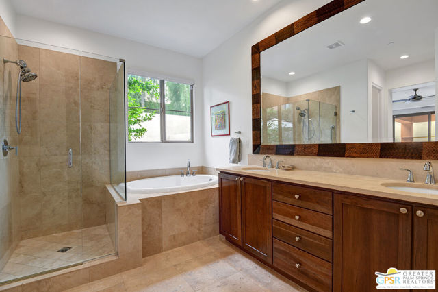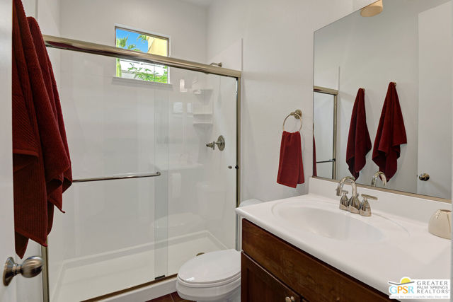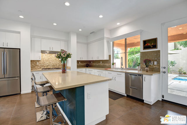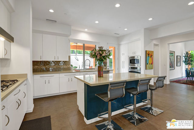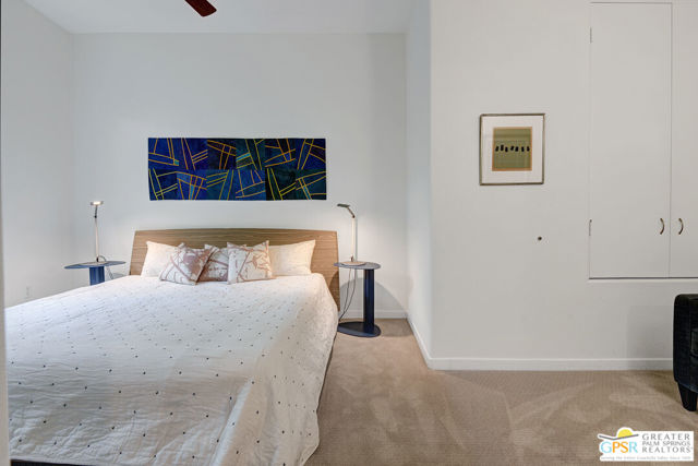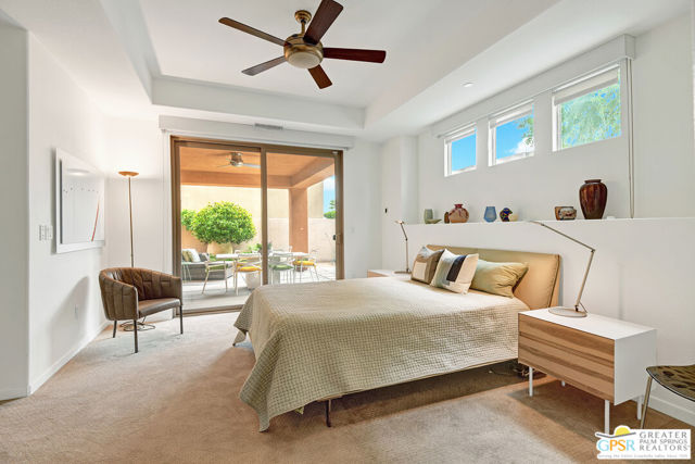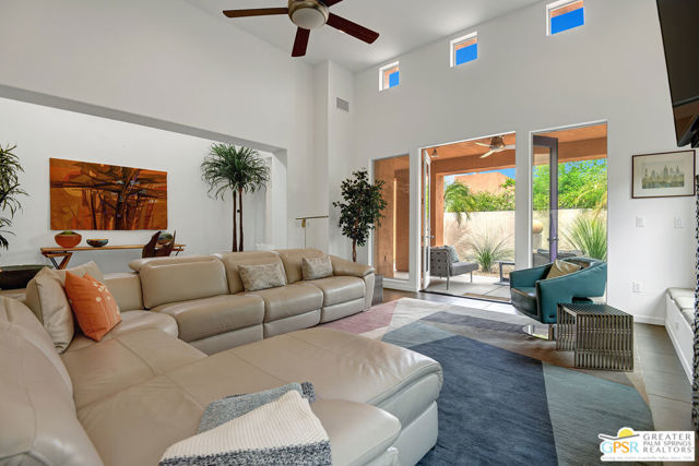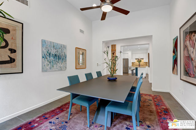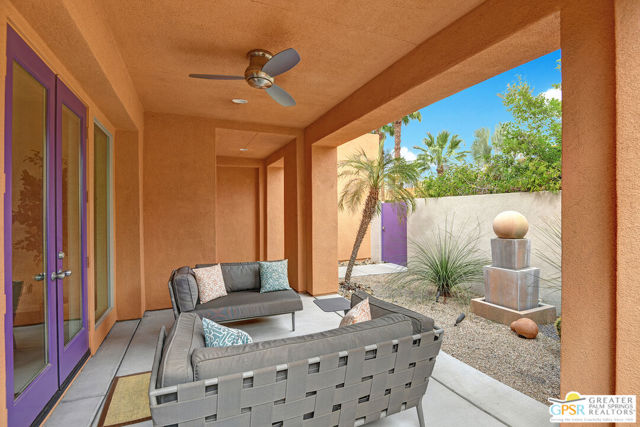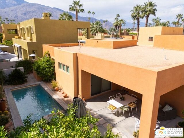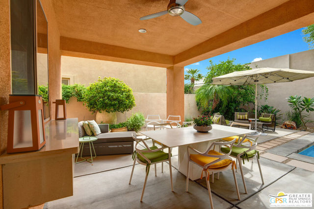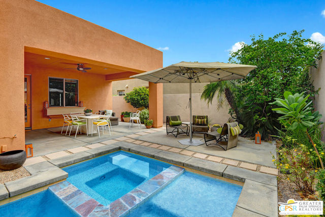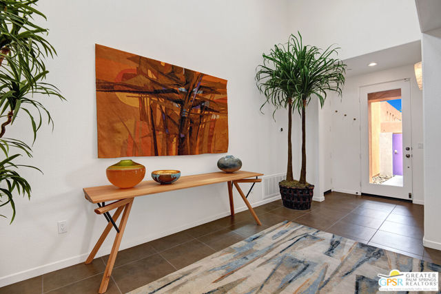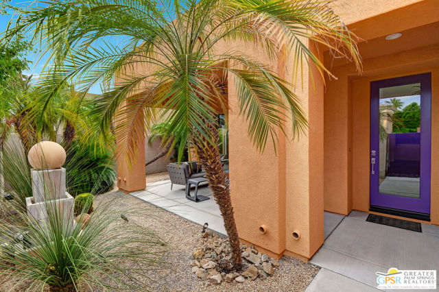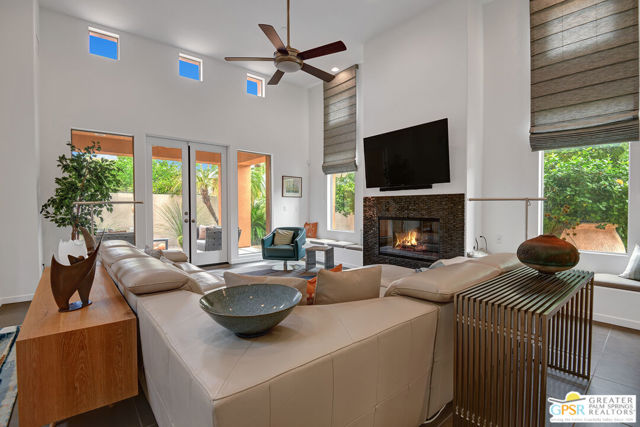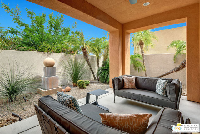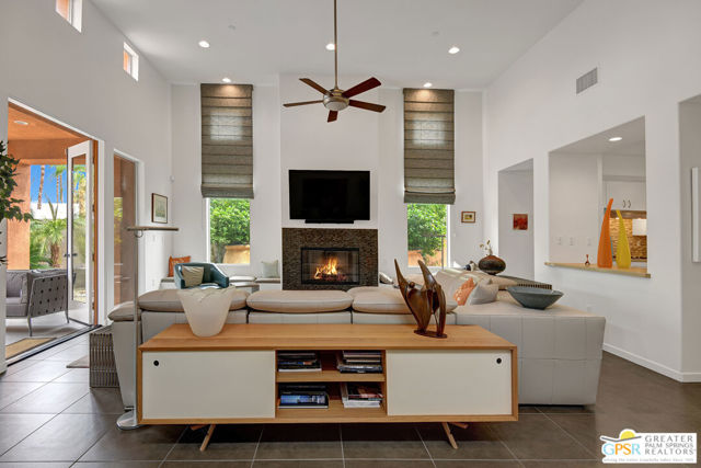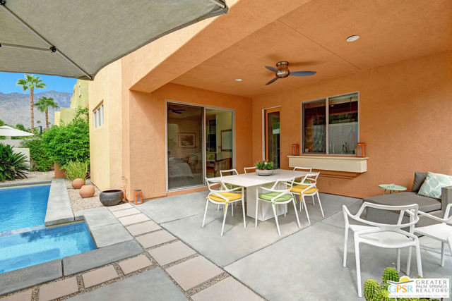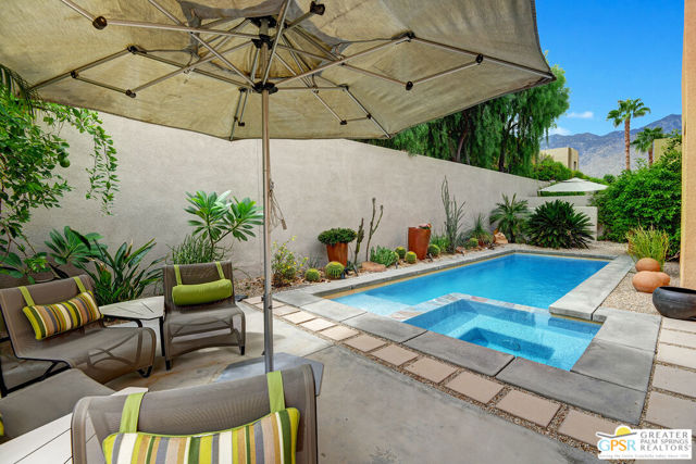 SOPHISTICATED DESERT LIVING IN LUMINAIRE PRICED TO SELL - Welcome to Luminaire, a sought-after enclave in South Palm Springs' Araby/Smoketree neighborhood where community and privacy blend seamlessly. Offered at an exceptional value, this 2-bedroom, 2-bath residence is your gateway to the refined desert lifestyle you've been seeking. From the moment you arrive, the home's thoughtful design stands out. Floor-to-ceiling windows frame garden vistas from nearly every room, flooding the interior with natural light and creating a seamless connection with the outdoors. High ceilings, decorator niches and an airy open-concept living space add architectural drama, while cozy window seats and a gas fireplace bring warmth and intimacy. The remodeled kitchen is a true showpiece, featuring custom cabinetry, molding detail, a tile backsplash, pull-out pantry drawers, Bosch stainless refrigerator, Fisher & Paykel double drawer dishwasher, GE Profile oven, microwave and gas cooktop. The spacious dining room opens to a tranquil fountain courtyard, filling the space with soothing sound - ideal for dinner parties. Many neighbors have converted this room into a third bedroom or office, offering flexibility for your lifestyle. Both bedrooms are generously scaled retreats. The primary suite features oversized sliders leading to the covered patio, stationary clerestory windows, a spa-like bath with dual vanities, sunken tub, shower and a walk-in closet with abundant storage. The secondary ensuite bedroom, with its cozy alcove, functions beautifully as a second primary suite. A bright powder room, large laundry room with cabinets and utility sink, and oversized two-car garage round out the thoughtful floor plan. Outdoors, a PebbleTec pool and spa provide the perfect spot to enjoy dramatic mountain views. Mature Meyer lemon and tangelo trees frame the backyard, while covered patios and shaded dining areas invite year-round entertaining. On fee land - you own it! - with low HOA dues, Luminaire offers a unique lifestyle: a welcoming sense of community with monthly neighborhood gatherings, while still maintaining privacy and tranquility. Whether you're seeking a full-time residence or a desert retreat, this property combines elegance, comfort, and value. This is more than a home - it's an invitation to experience the best of Palm Springs living.