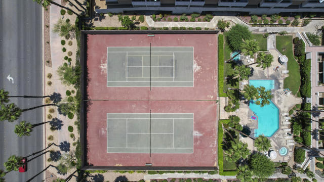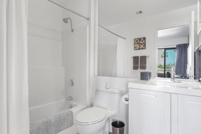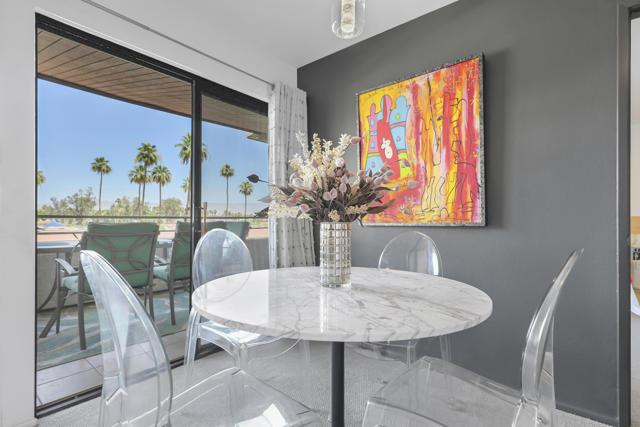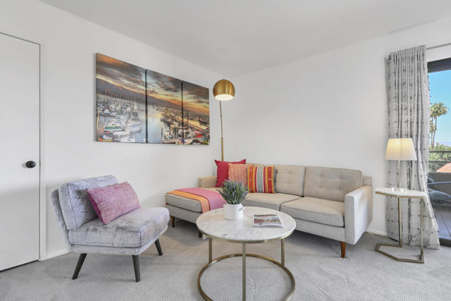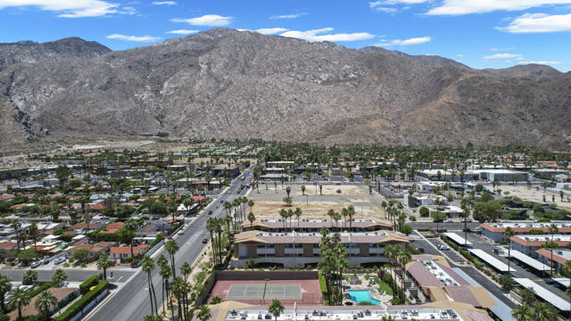 PRICED TO SELL!! Biarritz top floor view 1 bed/1 bath end unit turnkey furnished, including new linens and new appliances with a 3-year warranty. With upbeat decor and artwork, this special condo can easily serve as a weekend destination, short term or longer rental investment, or full-time residence. The condo showcases a large, spacious deck, accessible from both the family room and bedroom, with a 180 degree view of mountains by day and city lights by night. The deck includes both dining and lounge furnishings, as well as 2 large storage closets and barbecue. Biarritz amenities include a large swimming pool, 2 spas, 2 tennis courts, secured bike storage, laundry rooms, and assigned covered parking spaces. Located moments from Palm Springs downtown vibe, offering retail shopping, culinary diversity, local and international art, and weekly Street Fair fun!