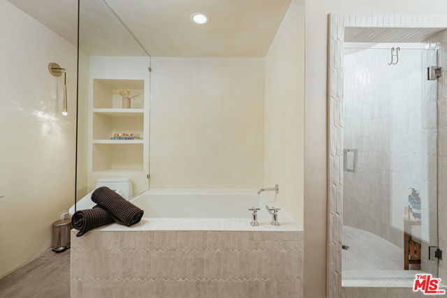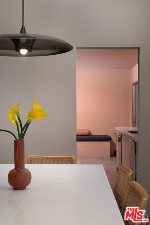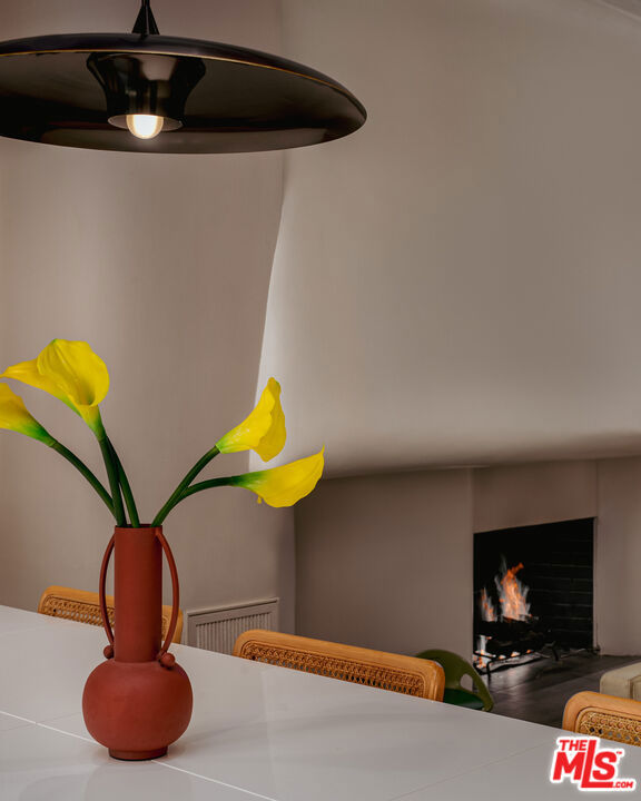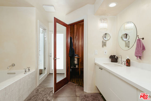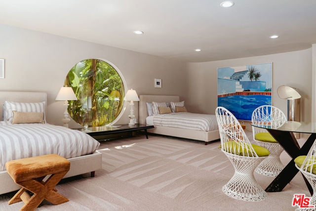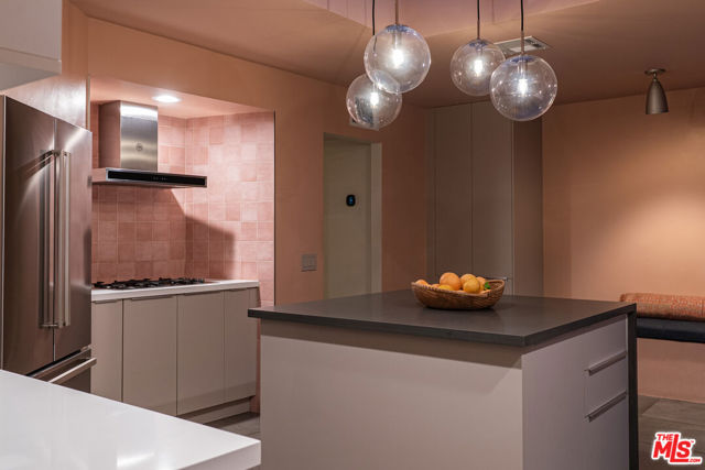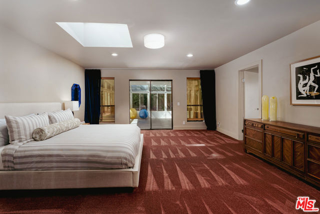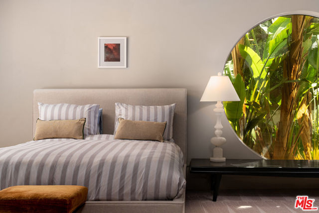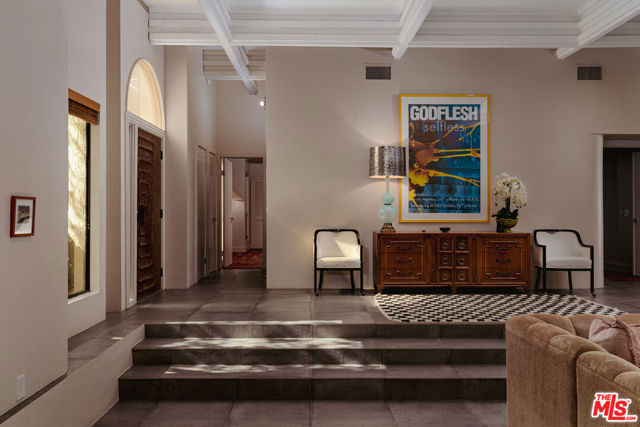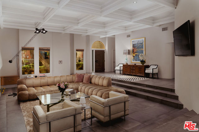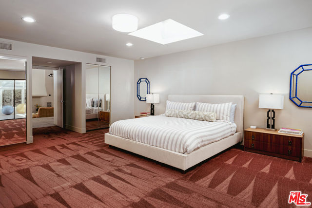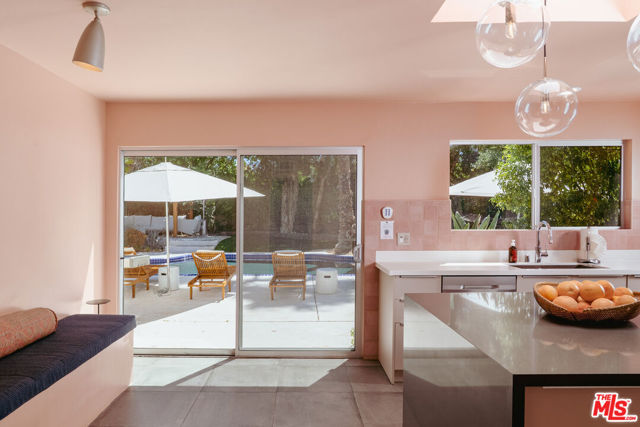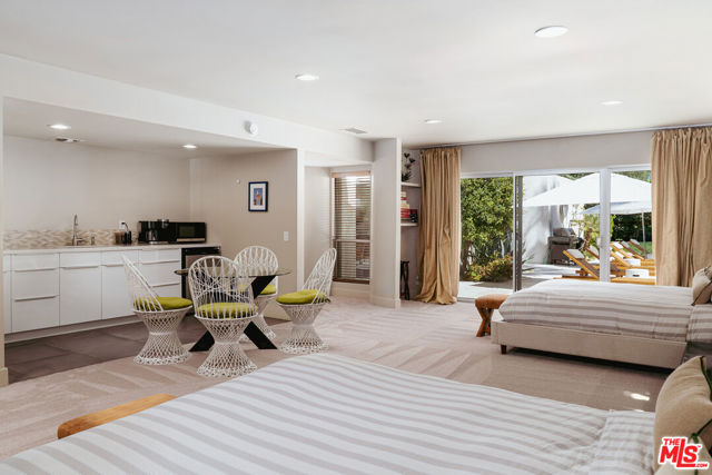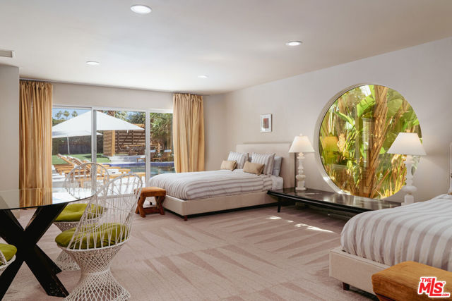 A stunning blend of modern sophistication and Palm Springs' architectural heritage, this estate is set in the coveted Movie Colony East, a neighborhood once home to Hollywood icons. Positioned on an expansive corner lot of nearly half an acre, it offers privacy and exclusivity, only attached to two neighboring properties. Located on the same street as Frank Sinatra's legendary Twin Palms Estate, it embodies a seamless fusion of history, luxury, and contemporary design. A dramatic sunken great room unfolds beneath soaring 15-foot coffered ceilings, anchored by a statement fireplace that enhances the grandeur of the space. Designed for effortless indoor-outdoor living, the layout features a formal dining area with lush poolside views, an open chef's kitchen outfitted with sleek Bertazzoni appliances, a natural gas range, a convection oven, and a breakfast nook perfect for morning rituals. The home offers three elegantly appointed en-suite bedrooms, along with an oversized attached casita that includes its own kitchenette and powder room, providing flexibility for guest accommodations or a private retreat. The primary suite is a true sanctuary, boasting a Finnish dry sauna, walk-in shower, soaking tub, and direct access to the pool, creating an experience of tranquility and indulgence. Step outside into a private oasis where native olive and palm trees, grape vines, and a citrus grove surround the pristine saltwater pool and spa, all set against breathtaking mountain views. Thoughtfully designed pergolas illuminated by bistro-style lighting create an inviting setting for alfresco dining, while a Weber char-broil 5-burner grill ensures effortless outdoor entertaining. Every detail is crafted for comfort and convenience, from the Ecobee smart system with dual-zone climate control to leased solar power for energy efficiency, an EV Level 2 plug for electric vehicle charging, and a spacious two-car garage with additional driveway parking. Ideally located just moments from downtown Palm Springs, golf courses, tennis clubs, museums, galleries, and fine dining, this estate offers both seclusion and accessibility. Beyond its architectural sophistication and luxurious amenities, the home is a study in effortless desert living, where mornings begin in sun-drenched tranquility and evenings unfold beneath a sky ablaze with stars. Whether hosting intimate gatherings by the pool, unwinding in the private sauna, or savoring alfresco meals framed by towering palms and majestic mountain vistas, every space is designed to evoke a sense of balance, beauty, and refinement. Exuding timeless desert luxury, this estate seamlessly blends architectural integrity with contemporary indulgence, offering a retreat that is unmistakably Palm Springs.