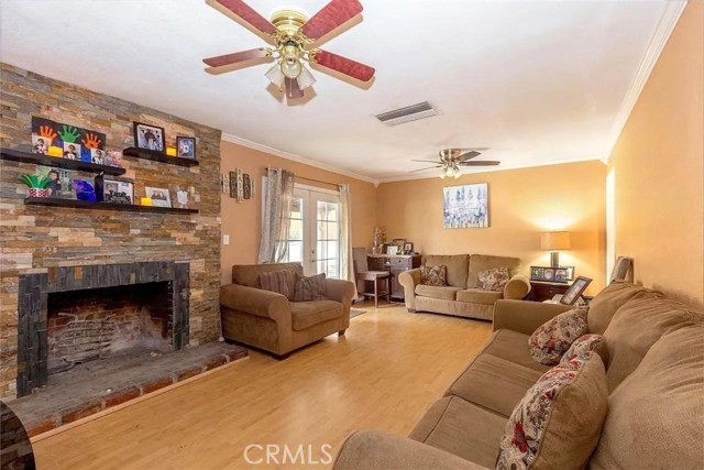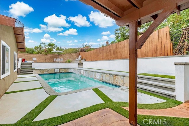 Perfect home in a cul-de-sac location. Smart split wing floor plan with one bedroom and bath at opposite side of home of the three bedrooms. This one story home with RV access has custom stamp concrete and artificial grass to cut down on your water bill. Home is complete with a beautiful fireplace for the winter AND a pool for the summer! Interior features a good floor plan, over 1350 sq ft, 4 bedrooms and 2 bathrooms. Spacious living room & dining Room with pergo flooring. Galley style kitchen tile flooring, good counter & cabinet space, AND eat-in dining! Bathroom features granite countertops, vanity, and tile work. Entertains dream backyard with pool with sheer descents and more custom cement work. Close to shopping, fwy, dining, schools & parks.